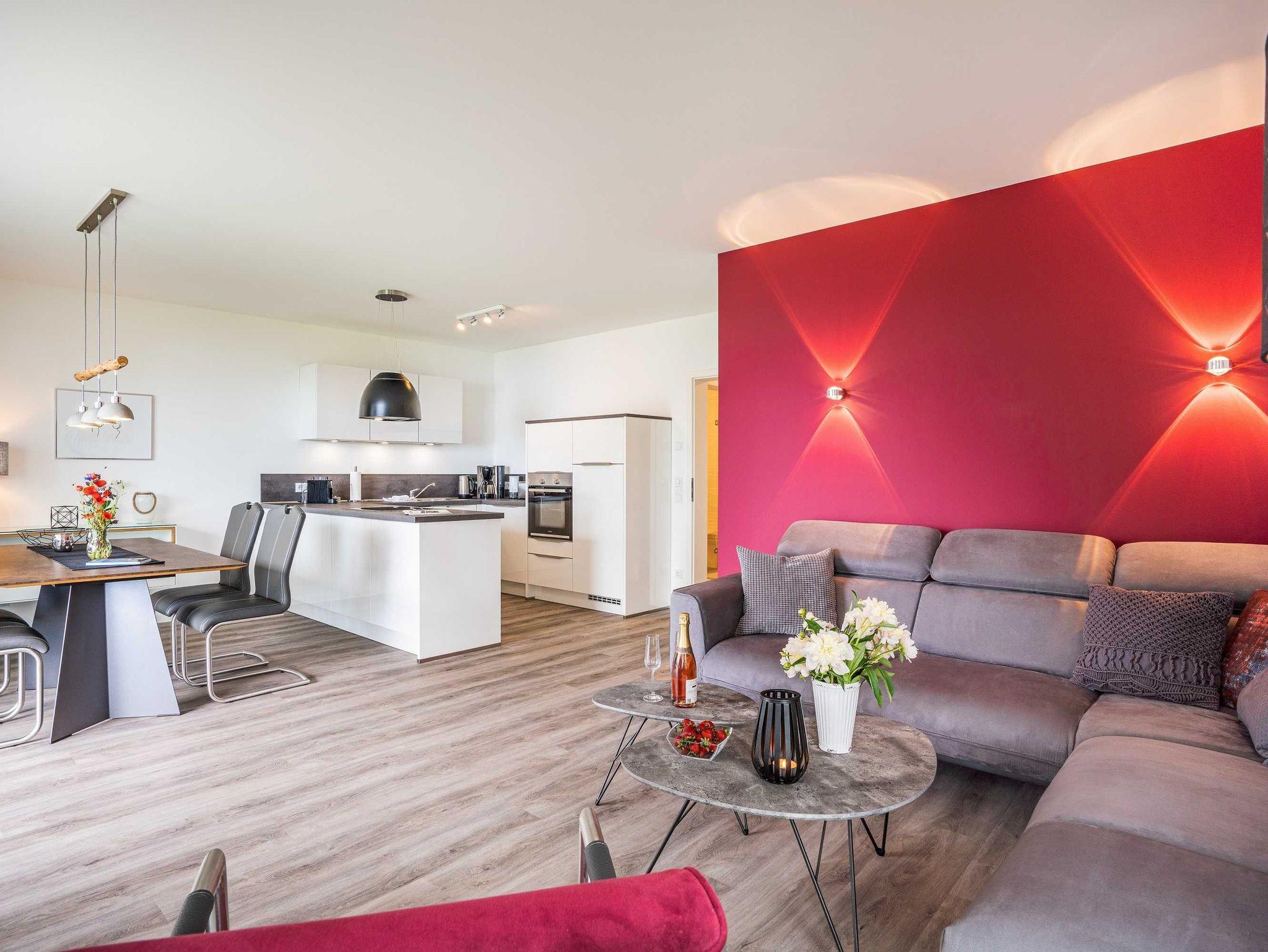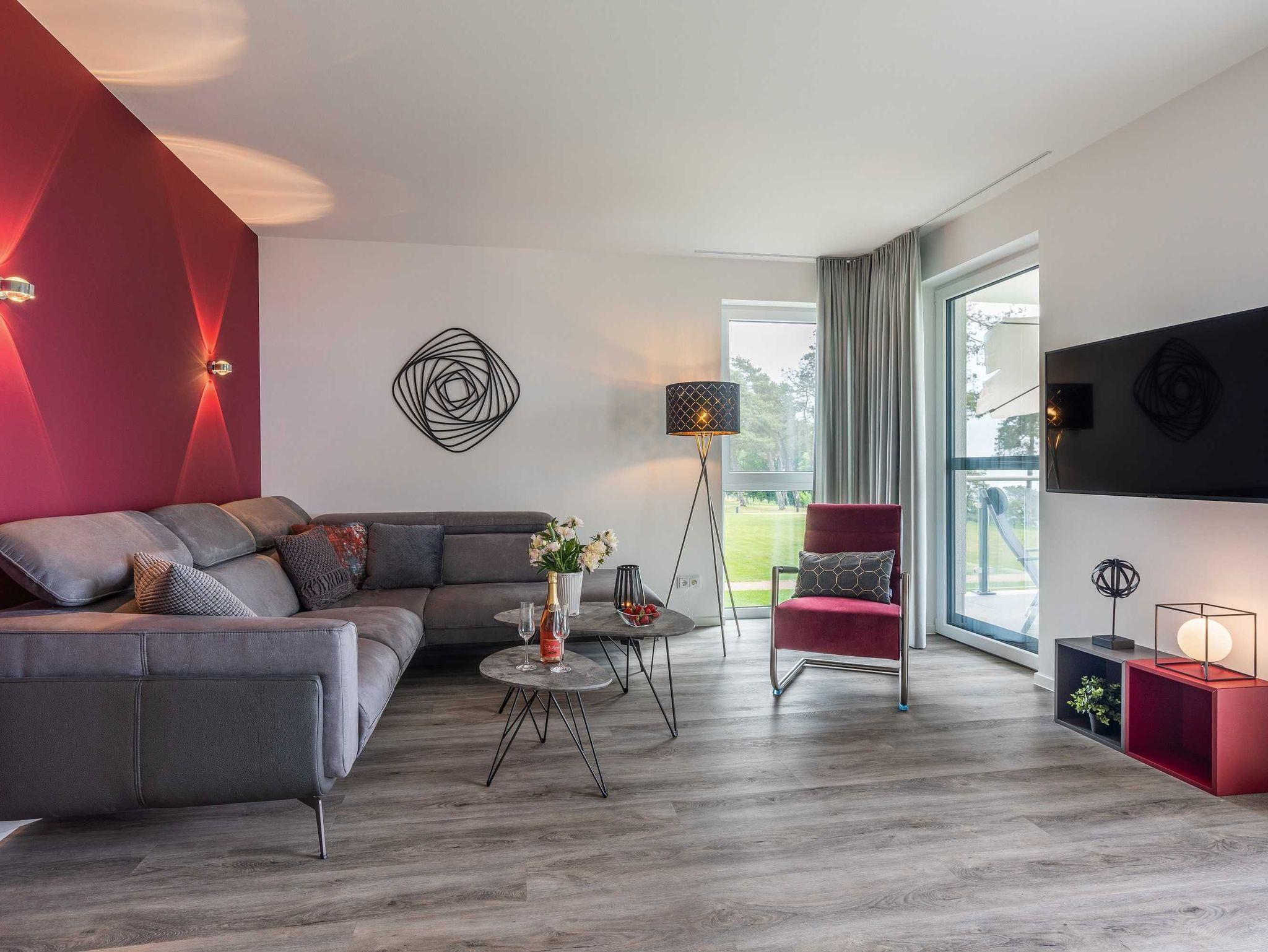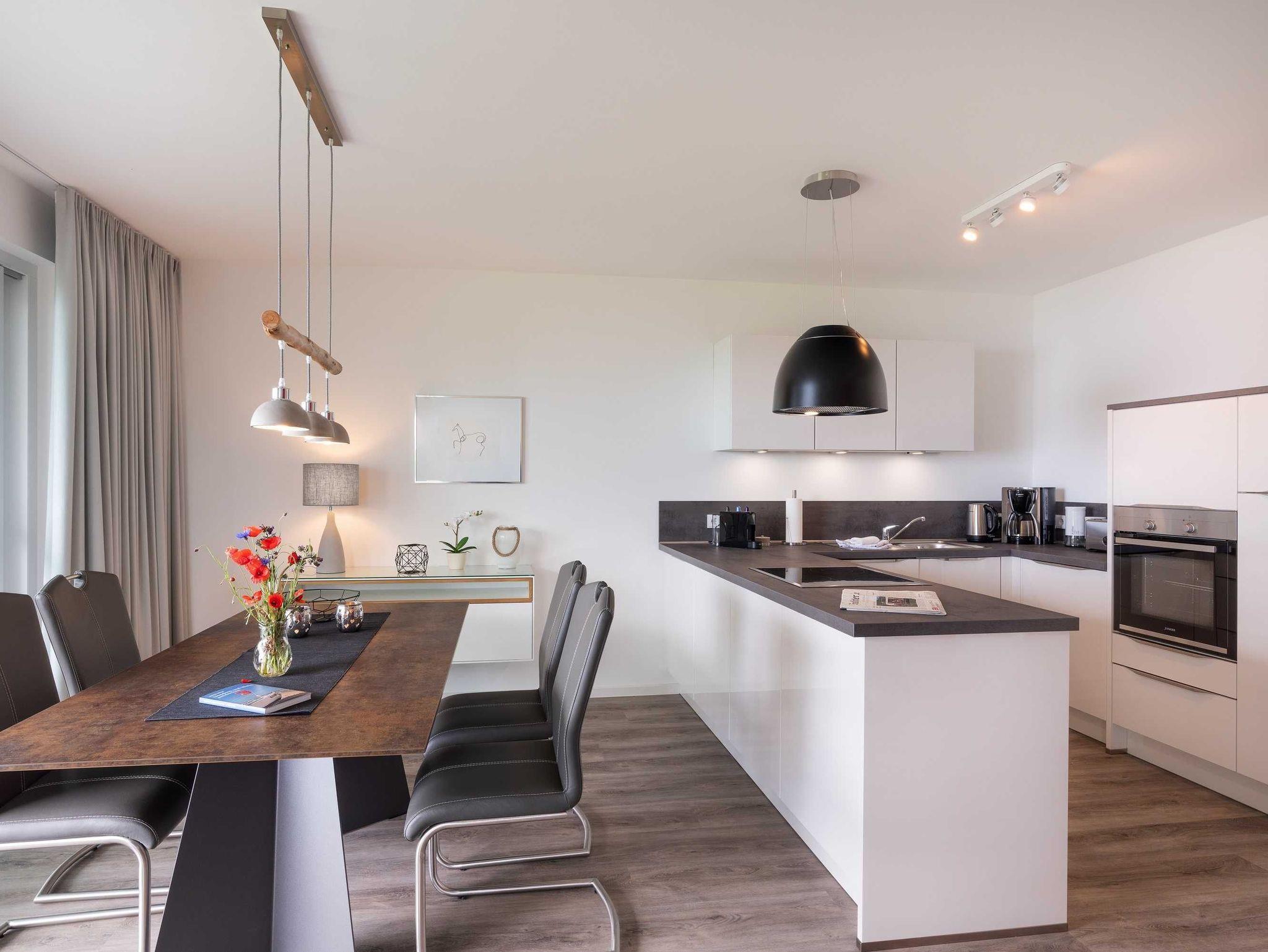 Diese luxuriöse 3-Zimmer-Wohnung im ersten Obergeschoss von Haus 5 (Aufzug vorhanden) mit Platz für maximal 4 Personen sowie einem Kleinkind bis 2 Jahre im Babybett verfügt über eine Wohnfläche von 101 m² und hat 2 Schlafzimmer sowie 2 voll ausgestattete Duschbäder. Der große Sonnenterrasse mit 17 m² liegt in idealer Süd-Ausrichtung. Die Wohnung ist modern eingerichtet mit offenem Wohn-Essbereich, großem Esstisch, Ledersofa sowie Smart-TV (inkl. Sky-Abo). Die hochwertig ausgestattete Küche, offen zum Wohnbereich, lässt keine Wünsche offen. Erholsamer Schlaf in den beiden Schlafzimmern mit Boxspringbetten und Smart-TV ist garantiert. Das Badezimmer en Suite ist mit einer begehbaren Dusche ausgestattet. Auf dem großen, überdachten Sonnenbalkon mit Essgruppe und zwei Relax-Sesseln, Fußhockern sowie einem Sonnenschirm können Sie die Seele baumeln lassen.