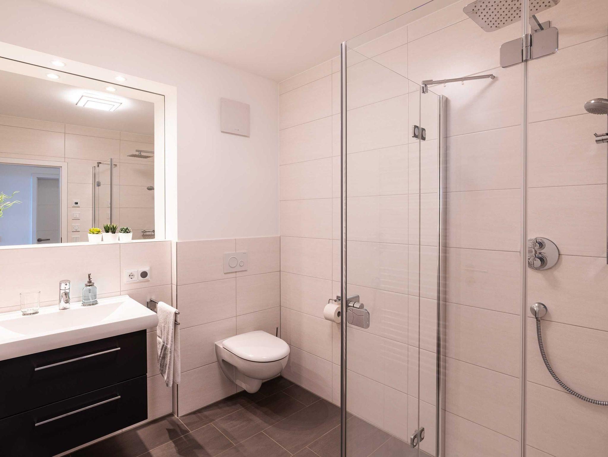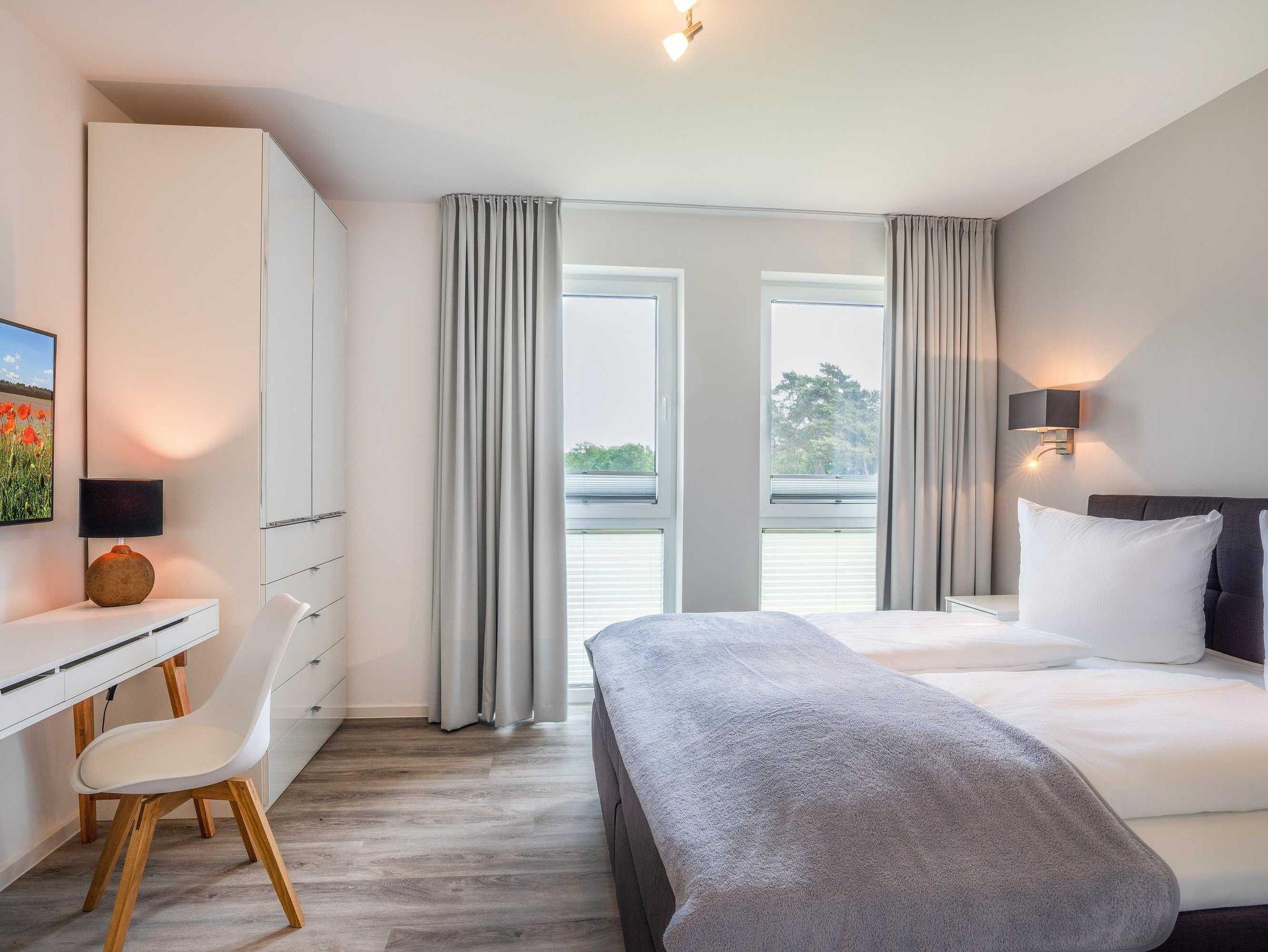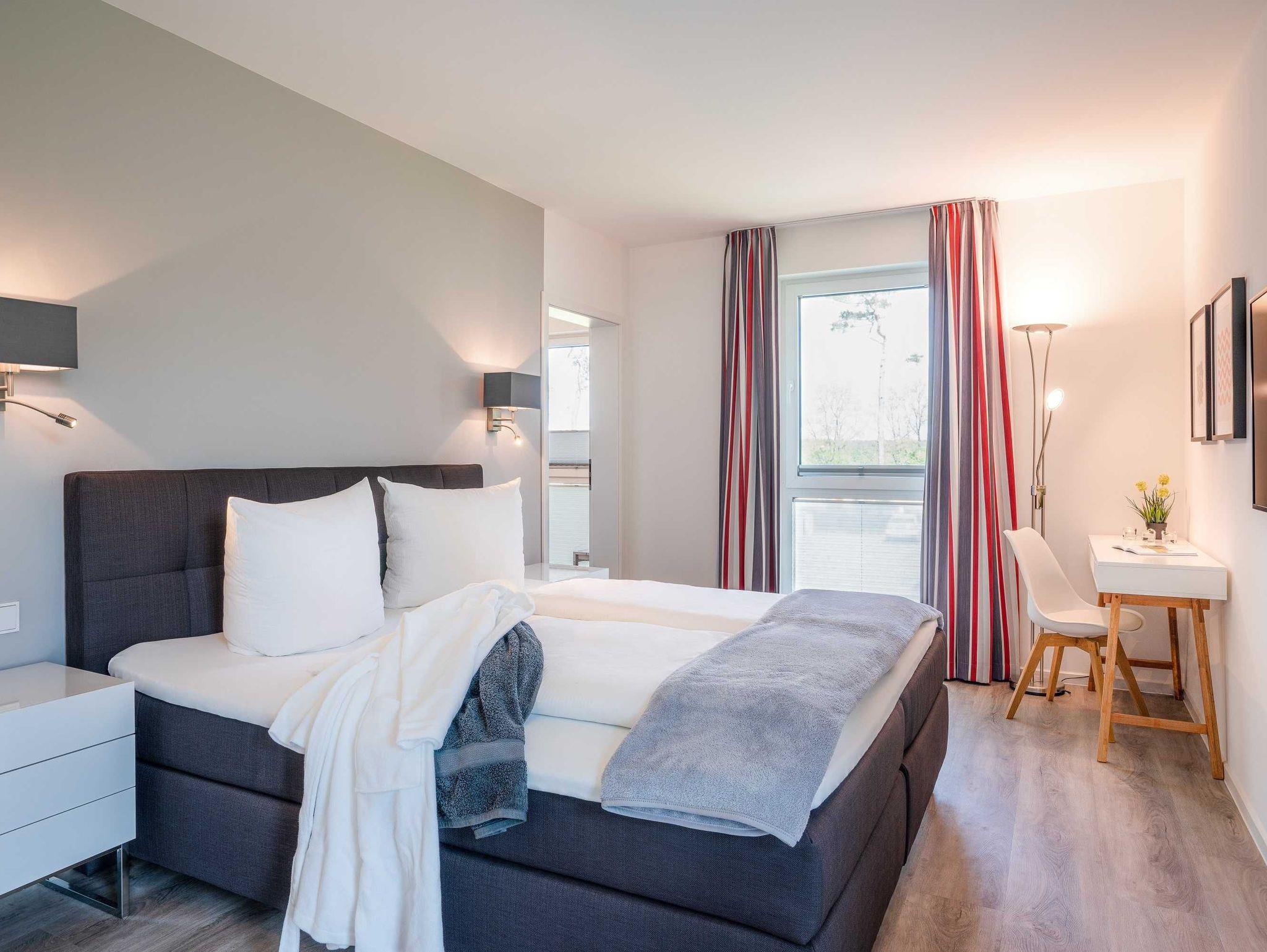 Diese luxuriöse 3-Zimmer-Wohnung im ersten Obergeschoss von Haus 5 (Aufzug vorhanden) mit Platz für maximal 4 Personen sowie einem Kleinkind bis 2 Jahre im Babybett verfügt über eine Wohnfläche von 101 m² und hat 2 Schlafzimmer sowie 2 voll ausgestattete Duschbäder. Der große Sonnenterrasse mit 17 m² liegt in idealer Süd-Ausrichtung. Die Wohnung ist modern eingerichtet mit offenem Wohn-Essbereich, großem Esstisch, Ledersofa sowie Smart-TV (inkl. Sky-Abo). Die hochwertig ausgestattete Küche, offen zum Wohnbereich, lässt keine Wünsche offen. Erholsamer Schlaf in den beiden Schlafzimmern mit Boxspringbetten und Smart-TV ist garantiert. Das Badezimmer en Suite ist mit einer begehbaren Dusche ausgestattet. Auf dem großen, überdachten Sonnenbalkon mit Essgruppe und zwei Relax-Sesseln, Fußhockern sowie einem Sonnenschirm können Sie die Seele baumeln lassen.