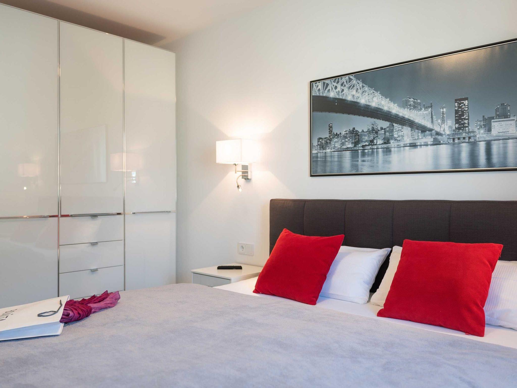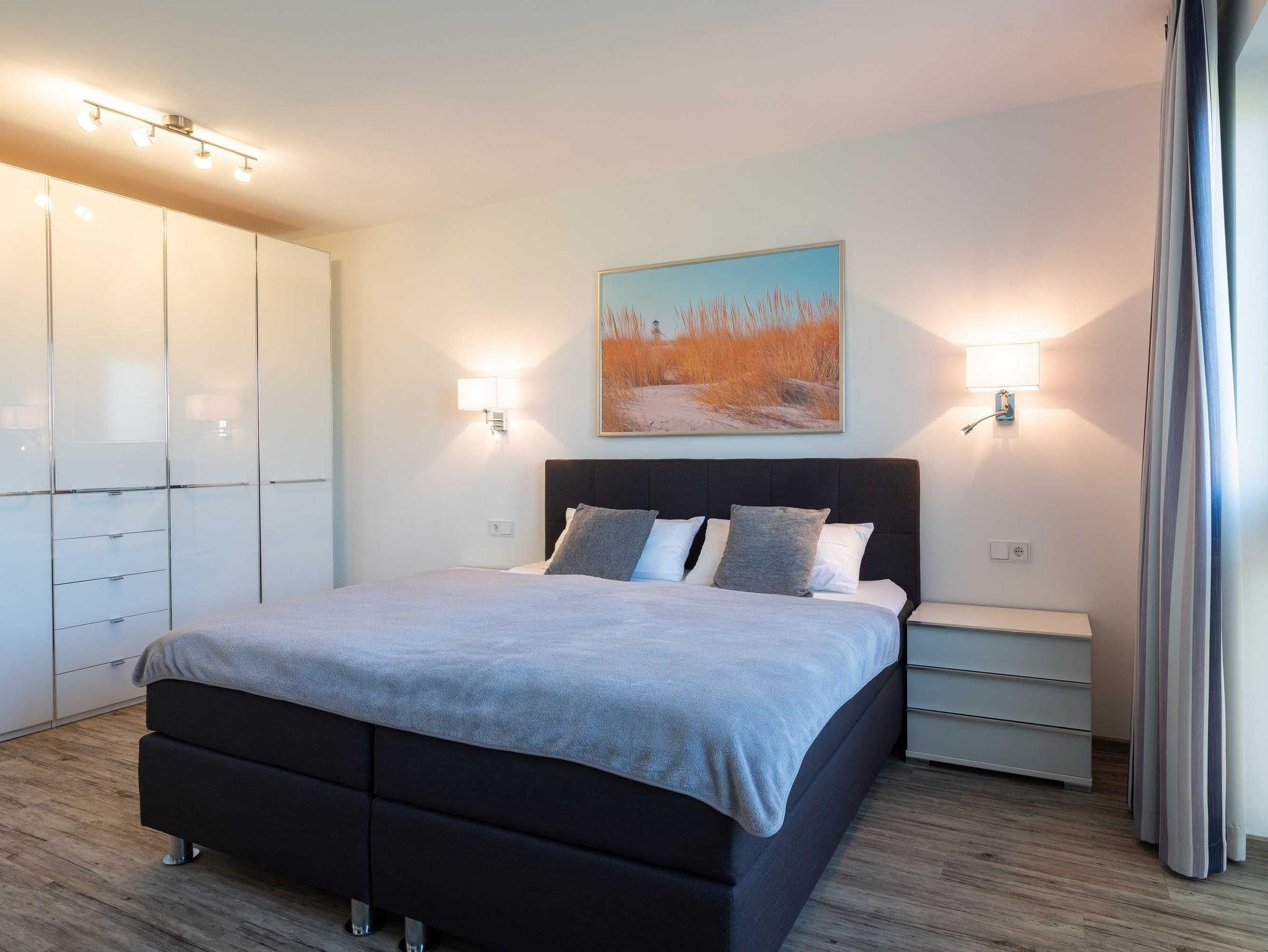 Diese luxuriöse 4-Zimmer-Wohnung im ersten Obergeschoss von Haus 3 (Aufzug vorhanden) mit Platz für maximal 6 Personen sowie einem Kleinkind bis 2 Jahre im Babybett verfügt über eine Wohnfläche von 119 m² und hat 3 Schlafzimmer sowie 2 voll ausgestattete Duschbäder. Die große Sonnenterrasse mit 17 m² liegt in idealer Süd-Ausrichtung. Die Wohnung ist modern eingerichtet mit offenem Wohn-Essbereich, großem Esstisch, Ledersofa sowie Smart-TV (inkl. Sky-Abo). Die hochwertig ausgestattete Küche, offen zum Wohnbereich, lässt keine Wünsche offen. Erholsamer Schlaf in den beiden Schlafzimmern mit Boxspringbetten und Smart-TV ist garantiert. Im dritten Schlafzimmer befindet sich ein bequemes Schlafsofa (Liegefläche: 1,80 x 2,00 m) und ein Smart-TV. Das Badezimmer en Suite ist mit einer begehbaren Dusche ausgestattet. Auf dem großen, überdachten Sonnenbalkon mit Essgruppe und zwei Relax-Sesseln, Fußhockern sowie einem Sonnenschirm können Sie die Seele baumeln lassen.