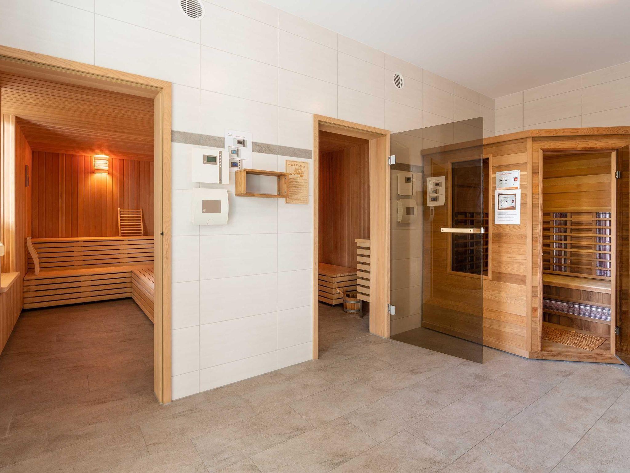 Im Souterrain des Nachbarhauses befindet sich auf 365 m² ein großer Freizeit-, Fitness- und Wellnessbereich (Biosauna, Finnische Sauna, Infrarotkabine, Fitnessraum, Massageraum, Ruheraum, Aufenthaltsraum, Spielzimmer für Kleinkinder, Billard, Tischtennis, Kicker), der Ihnen kostenlos zur Verfügung steht und die Interessen jeden Alters berücksichtigt.