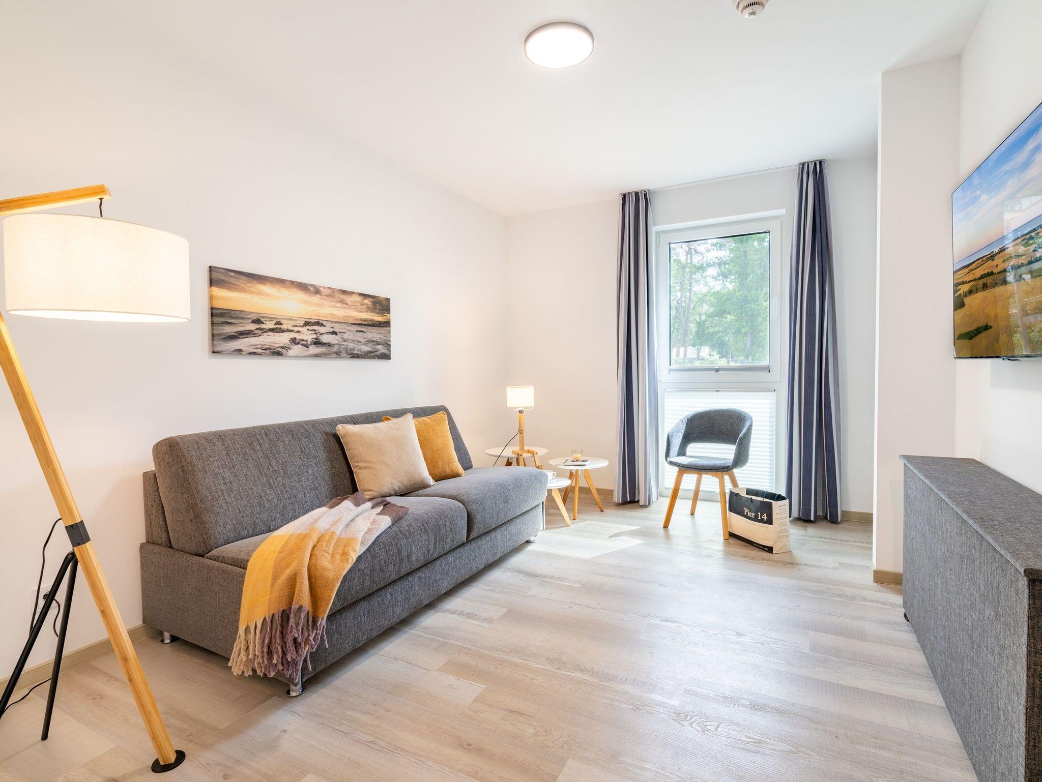 Ihre Gäste oder Kinder finden im dritten Schlafzimmer auf dem äußerst komfortablen Schlafsofa mit Lattenrost und Bultex-Matratze (160 x 200 cm) erholsamen Schlaf. Auch dieses Zimmer ist mit einem Kleiderschrank und einem Smart-TV ausgestattet.