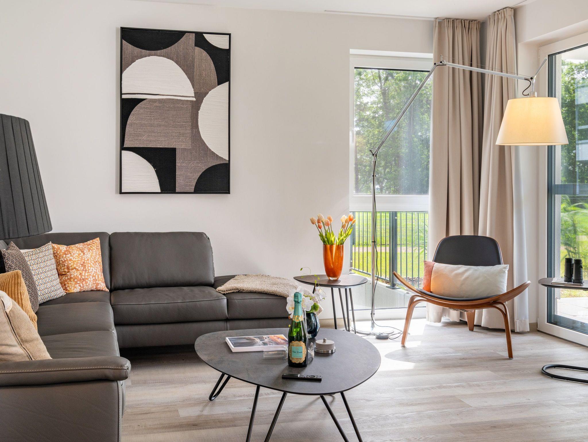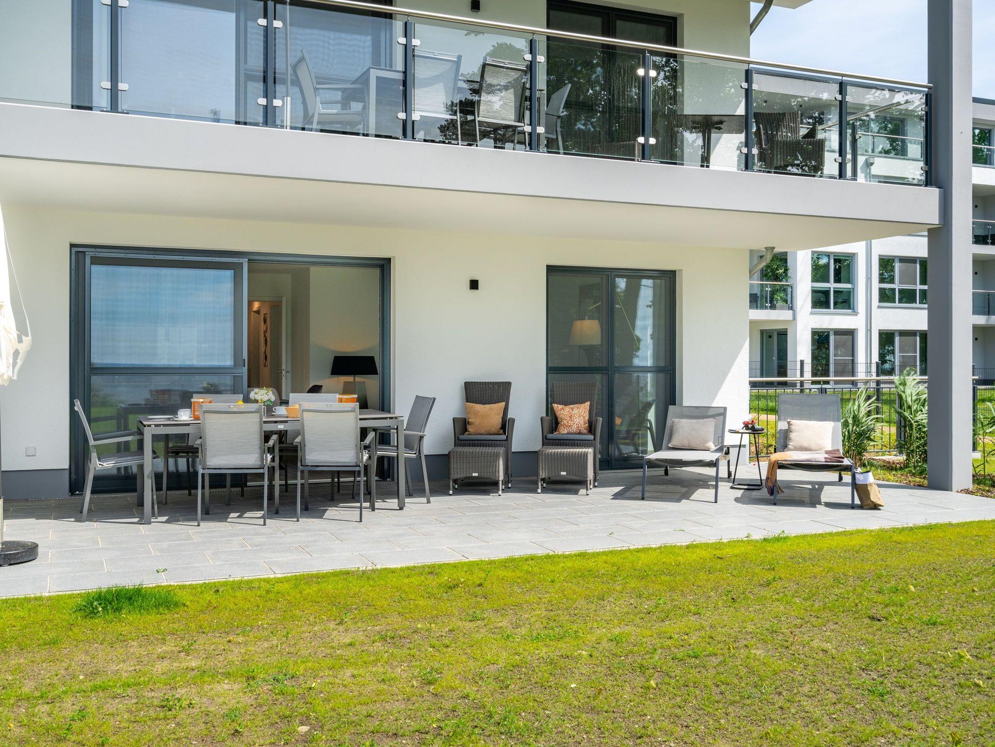 Moderne Terrassenwohnung mit Meerblick, Sauna, Fitnessraum und Spielplatz auf Usedom, ideal für entspannte Familienurlaube.