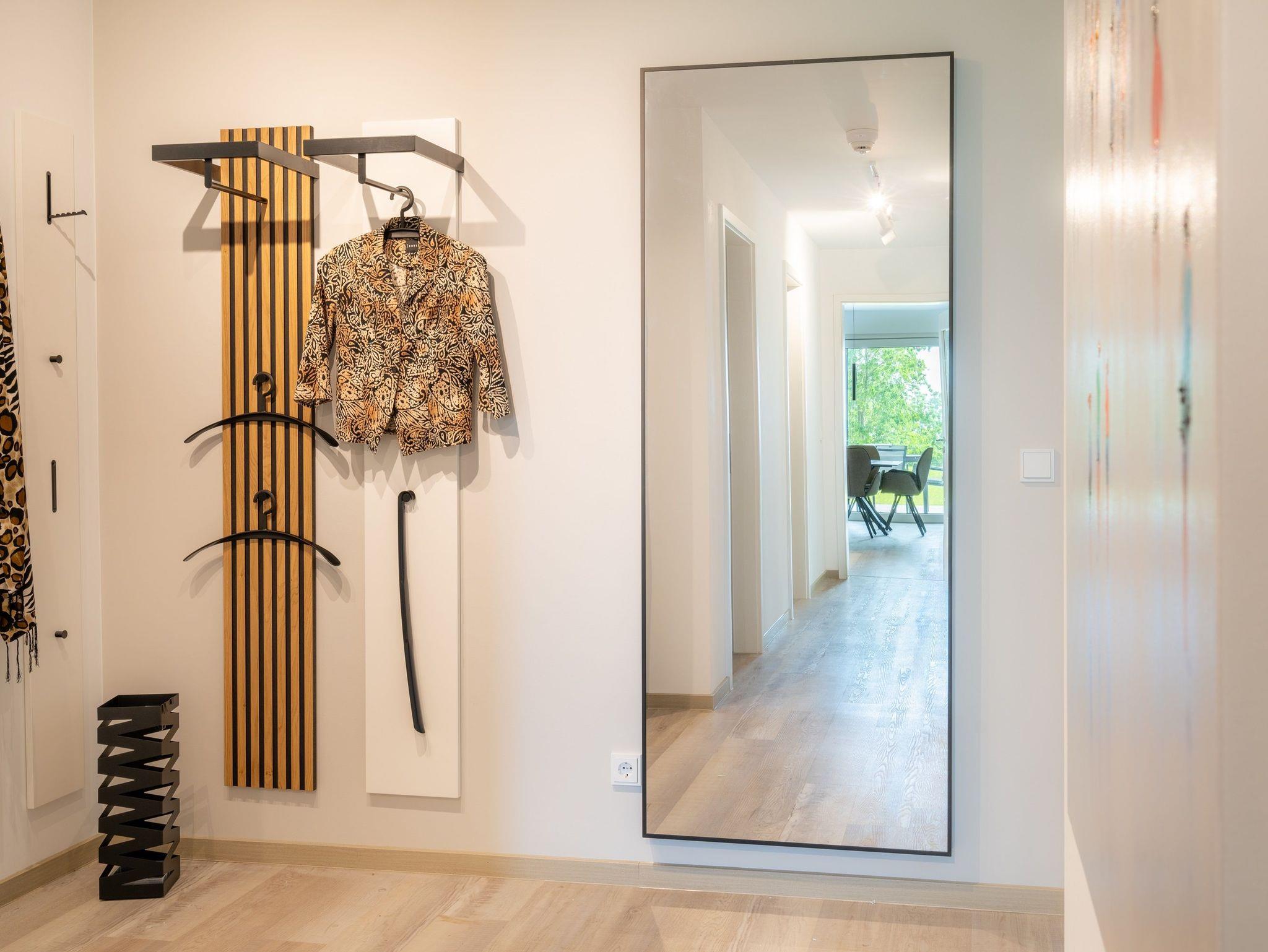 Informationen für Gäste mit Mobilitätseinschränkung: Der Zugang vom Carportstellplatz bis zum Hauseingang ist barrierefrei gestaltet. Direkt vor dem Haus befindet sich eine Kurzzeitparkfläche, die für Be- und Entladevorgänge genutzt werden kann. Die Distanz von der Carportanlage bis zur Hauseingangstür beträgt etwa 30 Meter. Die Breite der Haustür beträgt 100 cm und weist eine Schwelle von etwa 1,5 cm Höhe auf. Der Aufzug im Treppenhaus bedient alle Etagen des Hauses, einschließlich des Freizeit- und Saunabereichs im Untergeschoss. Die Türbreite des Aufzugs beträgt 90 cm, die Tiefe liegt bei 130 cm. Die schwellenlose Wohnungstür weist eine Breite von 90 cm auf. Die Breiten der schwellenlosen Zimmertüren liegen bei 80 cm (Ausnahme: Türbreite von der Abstellkammer beträgt 70 cm). Der schwellenlose Duscheingang im en suite Badezimmer weist eine Breite von 90 cm auf, die Tiefe liegt bei 200 cm. Auf Wunsch kann ein Duschhocker kostenfrei zur Verfügung gestellt werden. Die Waschtische sind nicht unterfahrbar und Haltegriffe sind nicht in den Badezimmern vorhanden. Der Duscheingang im zweiten Badezimmer weist eine Breite von 90 cm auf. Die Höhe der Duschtasse beträgt 1 cm. Die Betten weisen eine Höhe von 65 cm auf und sind unterfahrbar (max. 10 cm). Die Terrassenschiebetür lässt sich auf eine Breite von 130 cm öffnen, die Höhe der Schwelle beträgt 1,5 cm. Die Sauna im Untergeschoss ist schwellenlos erreichbar. Die Schwelle am Saunaeingang beträgt 10 cm, die Breite der Saunatür beträgt 60 cm. Die Breite der Tür zum Ruheraum beträgt 90 cm und weist eine Schwelle von etwa 2 cm auf.