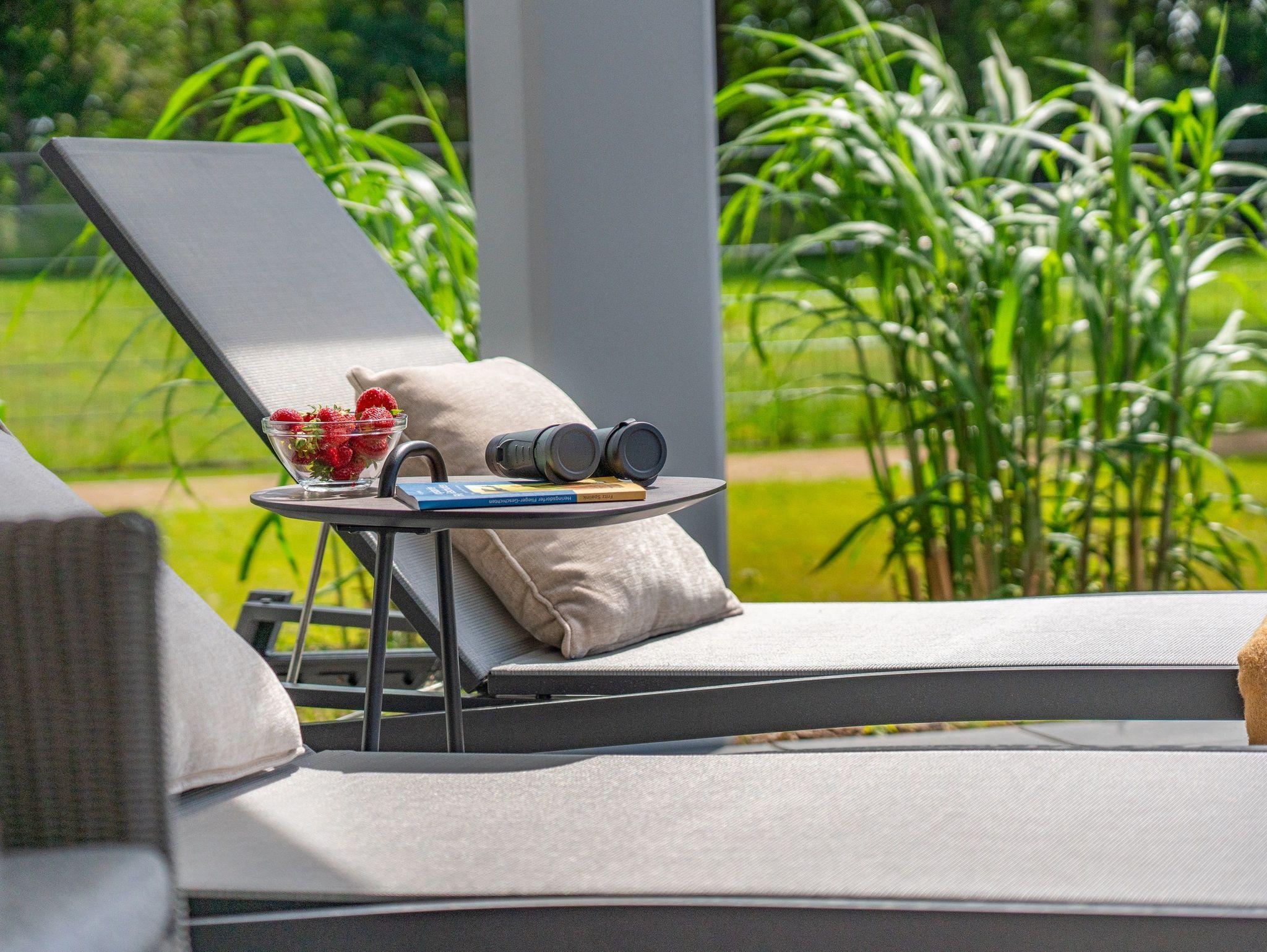 Die 20 m² große, überdachte Sonnenterrasse bietet reichlich Platz für Entspannung und Geselligkeit. Ein großer Esstisch mit sechs Stühlen lädt zu gemeinsamen Mahlzeiten ein, während die gemütliche Sitzgruppe mit zwei verstellbaren Relaxsesseln samt Fußhockern perfekte Plätze für entspannte Stunden bieten. Sonnenanbeterinnen und Sonnenanbeter können es sich auf den zwei bequemen Sonnenliegen gemütlich machen und ausgiebige Sonnenbäder genießen.