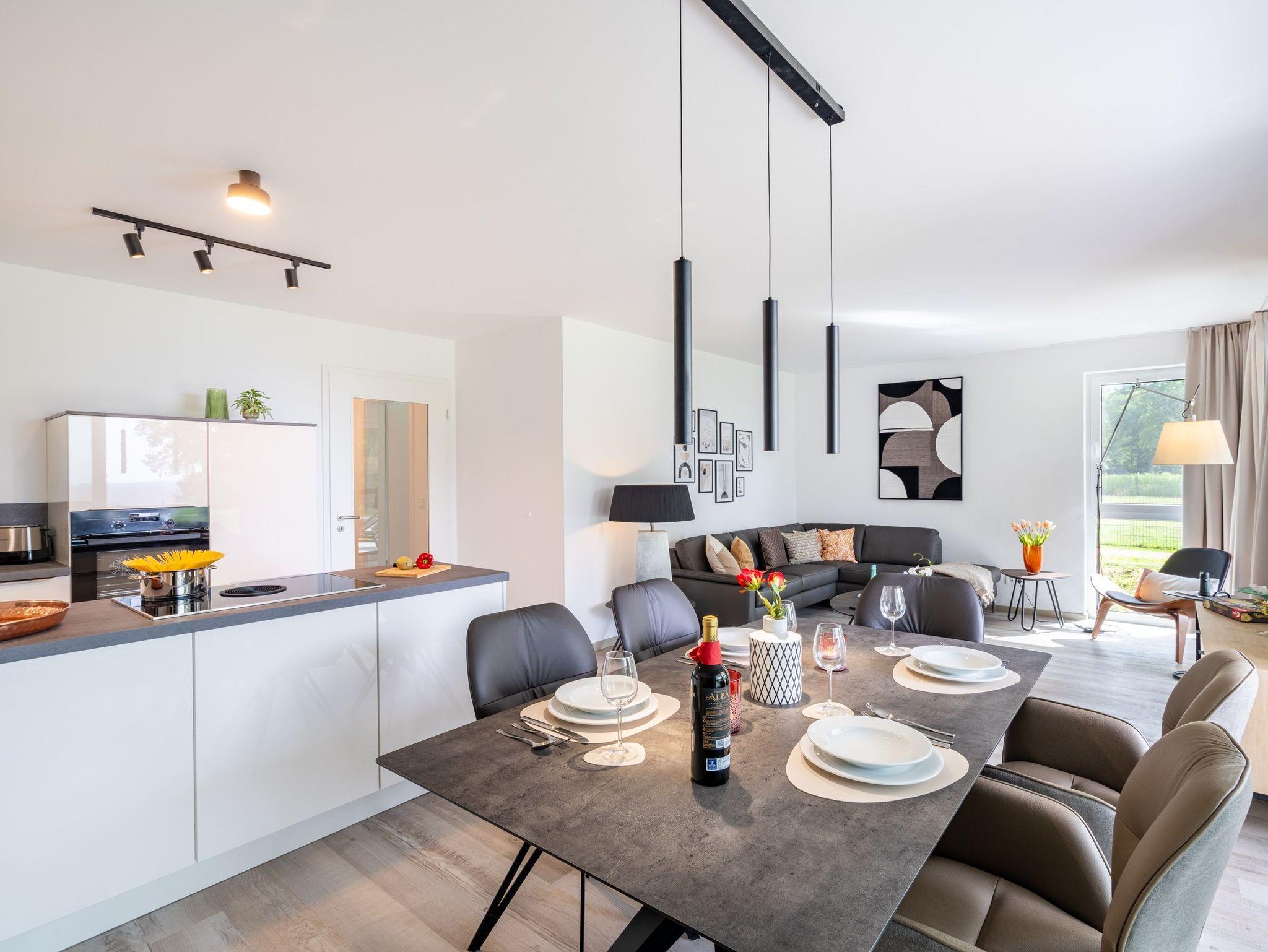 Eine Essgruppe mit Lederstühlen, ein bequemes Eckledersofa und ein Ledersessel vervollständigen die hochwertige und geschmackvolle Einrichtung.