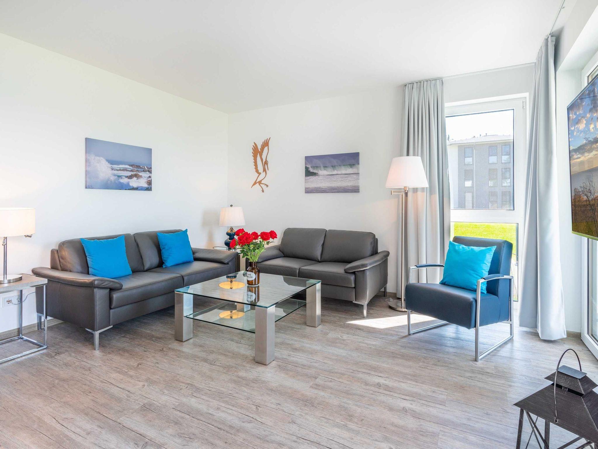 Diese luxuriöse 4-Zimmer-Wohnung im Erdgeschoss von Haus 7 mit Platz für maximal 6 Personen verfügt über eine Wohnfläche von 100 m² und hat 3 Schlafzimmer sowie 2 voll ausgestattete Duschbäder. Die große Sonnenterrasse mit 21 m² liegt in idealer Süd-Ausrichtung. Die Wohnung ist modern eingerichtet mit offenem Wohn-Essbereich, großem Esstisch, Ledersofa sowie Smart-TV (inkl. Sky-Abo). Die hochwertig ausgestattete Küche, offen zum Wohnbereich, lässt keine Wünsche offen. Erholsamer Schlaf in den beiden Schlafzimmern mit Boxspringbetten und Smart-TV ist garantiert. Im dritten Schlafzimmer befindet sich ein bequemes Schlafsofa (Liegefläche: 1,60 x 2,00 m) und ein Smart-TV. Das Badezimmer en Suite ist mit einer begehbaren Dusche ausgestattet. Auf der großen, überdachten Sonnenterrasse mit Essgruppe und jeweils zwei Relax-Sesseln samt Fußhockern, Sonnenschirm und Sonnenliegen können Sie die Seele baumeln lassen.