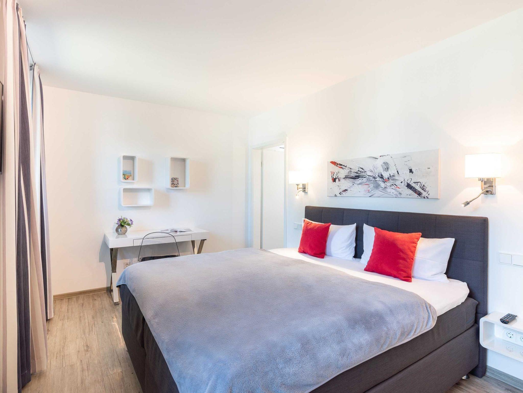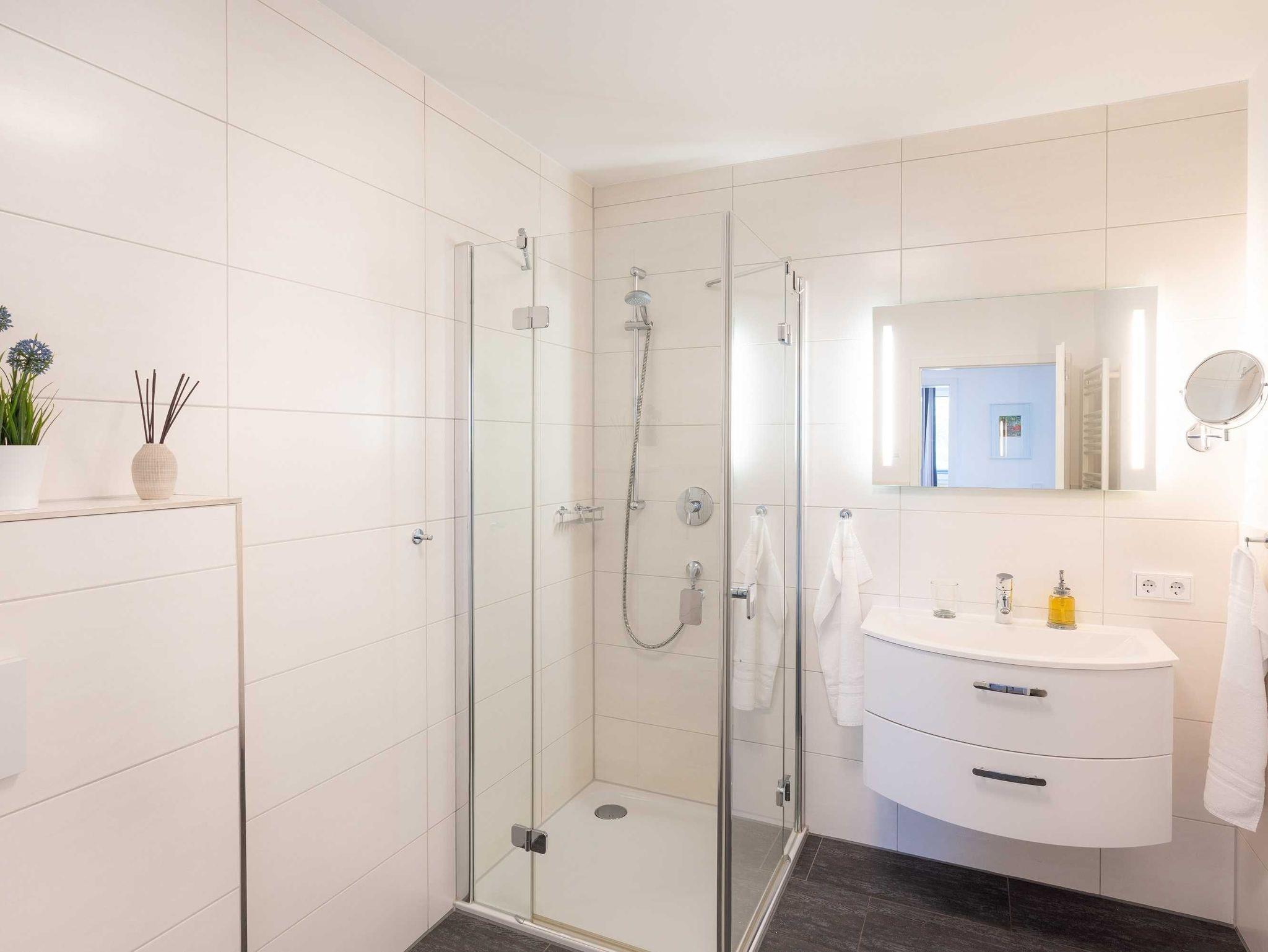 Diese lichtdurchflutete, helle 3-Zimmer-Wohnung im obersten Geschoss von Haus 1 (Aufzug vorhanden) mit Platz für maximal 4 Personen sowie einem Kleinkind bis 2 Jahre im Babybett verfügt über eine Wohnfläche von 94 m² und hat 2 Schlafzimmer sowie 2 voll ausgestattete Duschbäder. Die große Sonnenterrasse mit 17 m² liegt in idealer Süd-Ausrichtung. Die Wohnung ist modern eingerichtet mit offenem Wohn-Essbereich, großem Esstisch, Ledersofa sowie Flat-TV (inkl. Sky-Abo). Die hochwertig ausgestattete Küche, offen zum Wohnbereich, lässt keine Wünsche offen. Erholsamer Schlaf in den beiden Schlafzimmern mit Boxspringbetten und Flat-TV ist garantiert. Das Badezimmer en Suite ist mit einer Duschtasse ausgestattet. Auf der großen, überdachten Sonnenterrasse mit Essgruppe und jeweils zwei Relax-Sesseln mit Fußhockern sowie einem Sonnenschirm können Sie die Seele baumeln lassen.