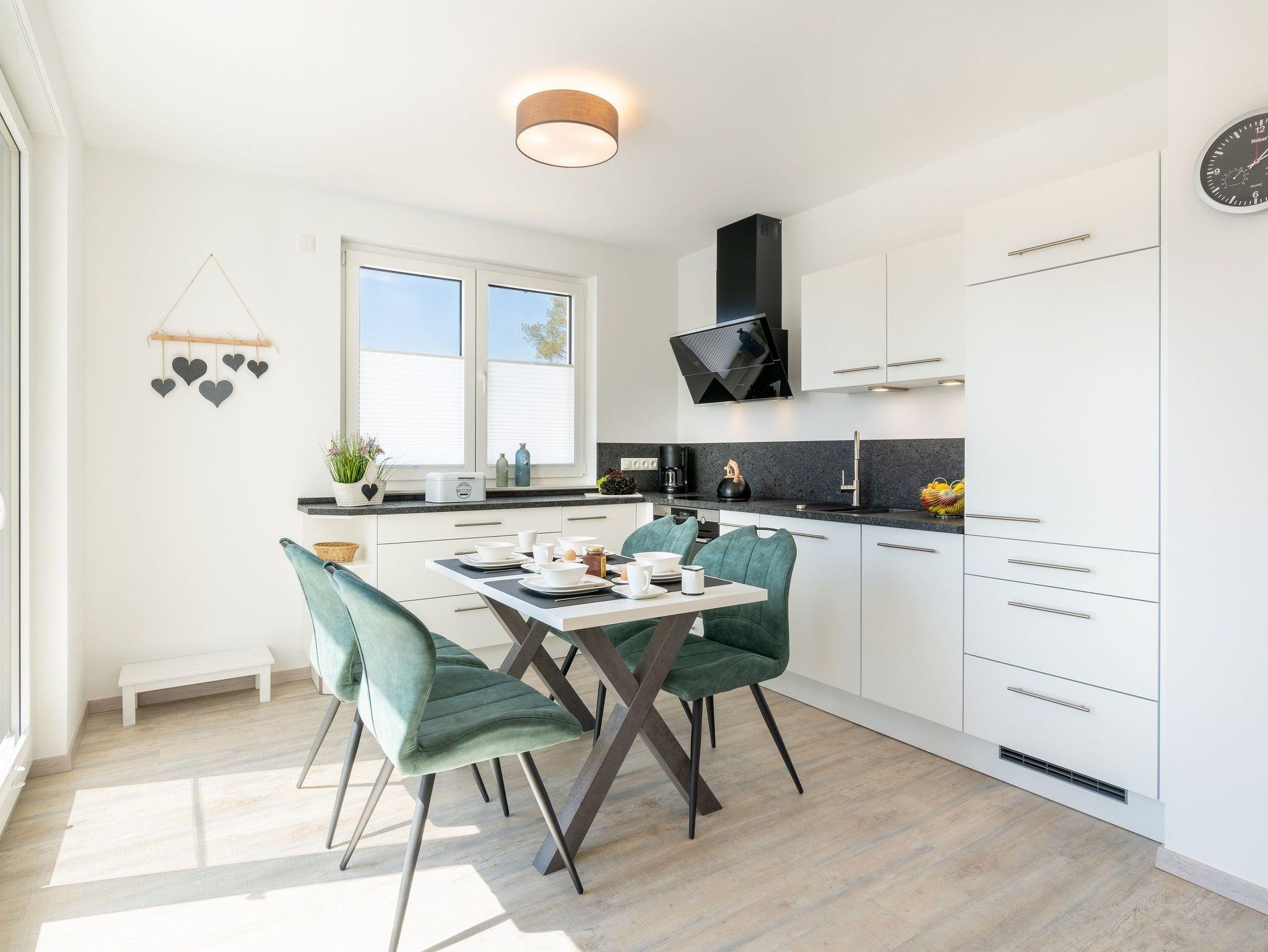 Die Küchenzeile verfügt über hochwertige Geräte wie Herd, Kaffeemaschine, Backofen, Kühlschrank mit Gefrierfach sowie Spülmaschine. Ausreichend Geschirr, Besteck sowie Töpfe und Pfannen befinden sich in den Schränken. Am Esstisch finden Sie vor einem erholsamen Urlaubstag zu einem gemeinsamen Frühstück zusammen.