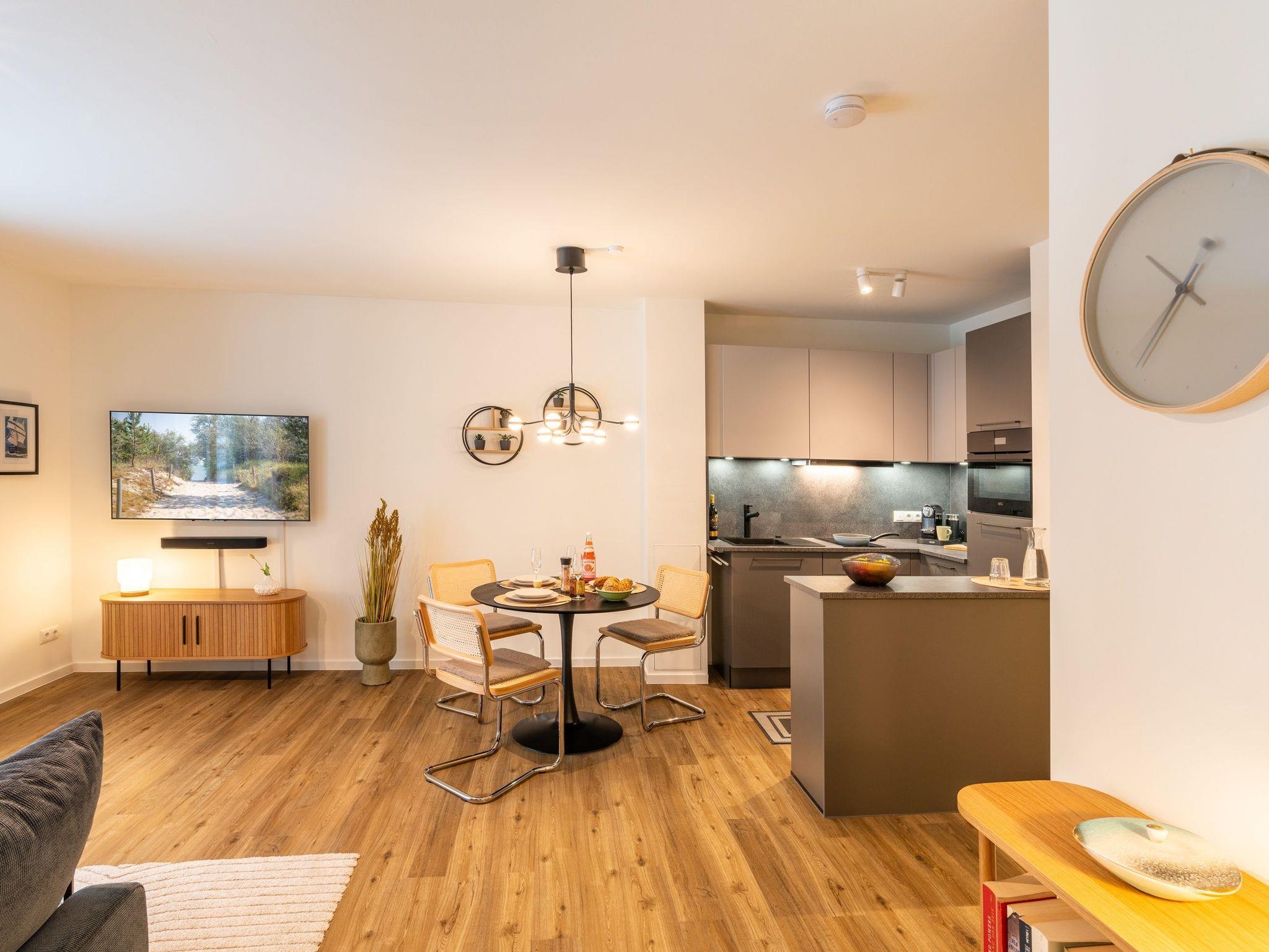 Auf einer Wohnfläche von 61 m² finden drei Erwachsene und ein Kind bis 14 Jahre in dieser modern eingerichteten Ferienwohnung ausreichend Platz für einen entspannten Urlaub am Stettiner Haff auf Usedom.