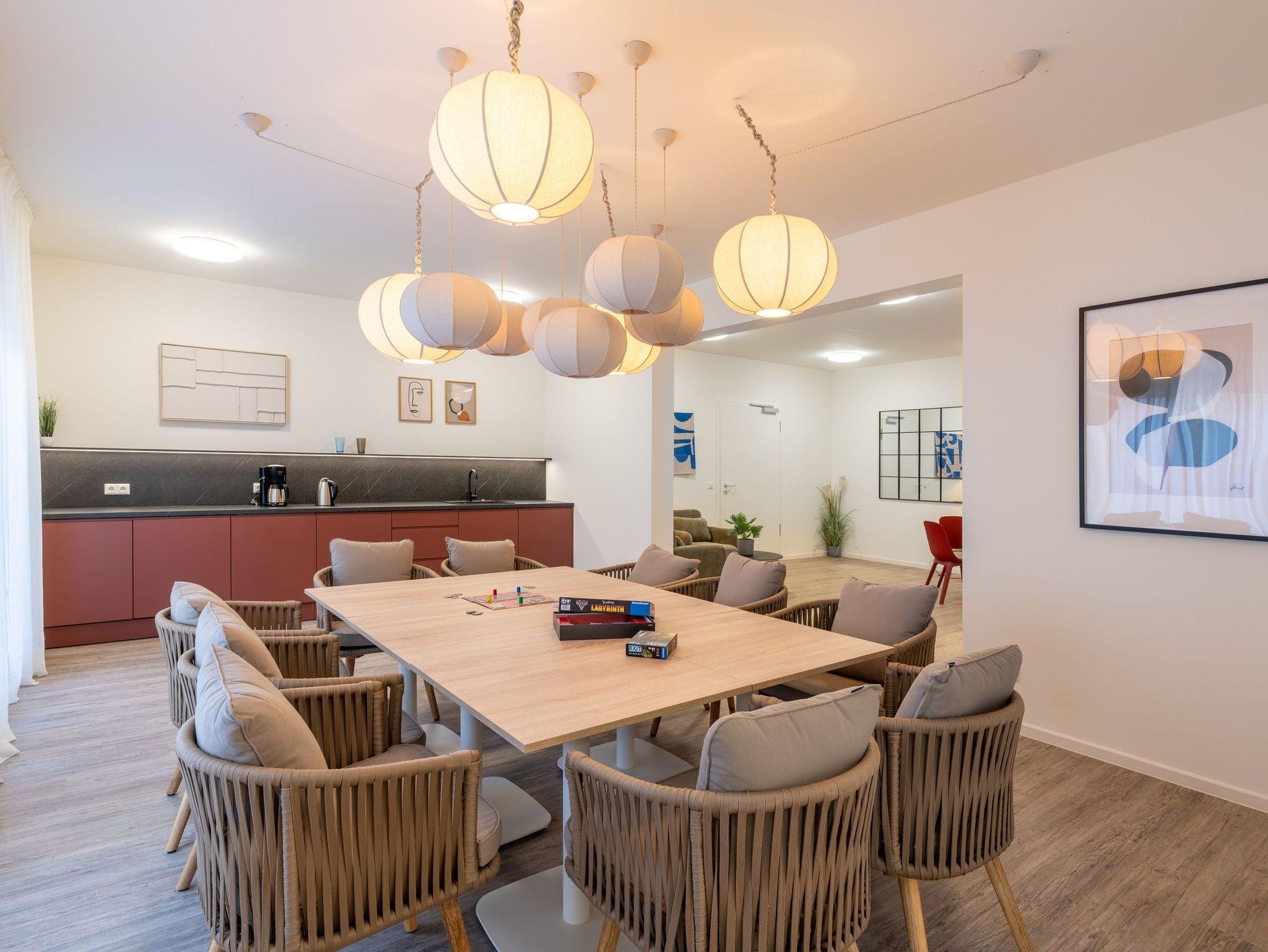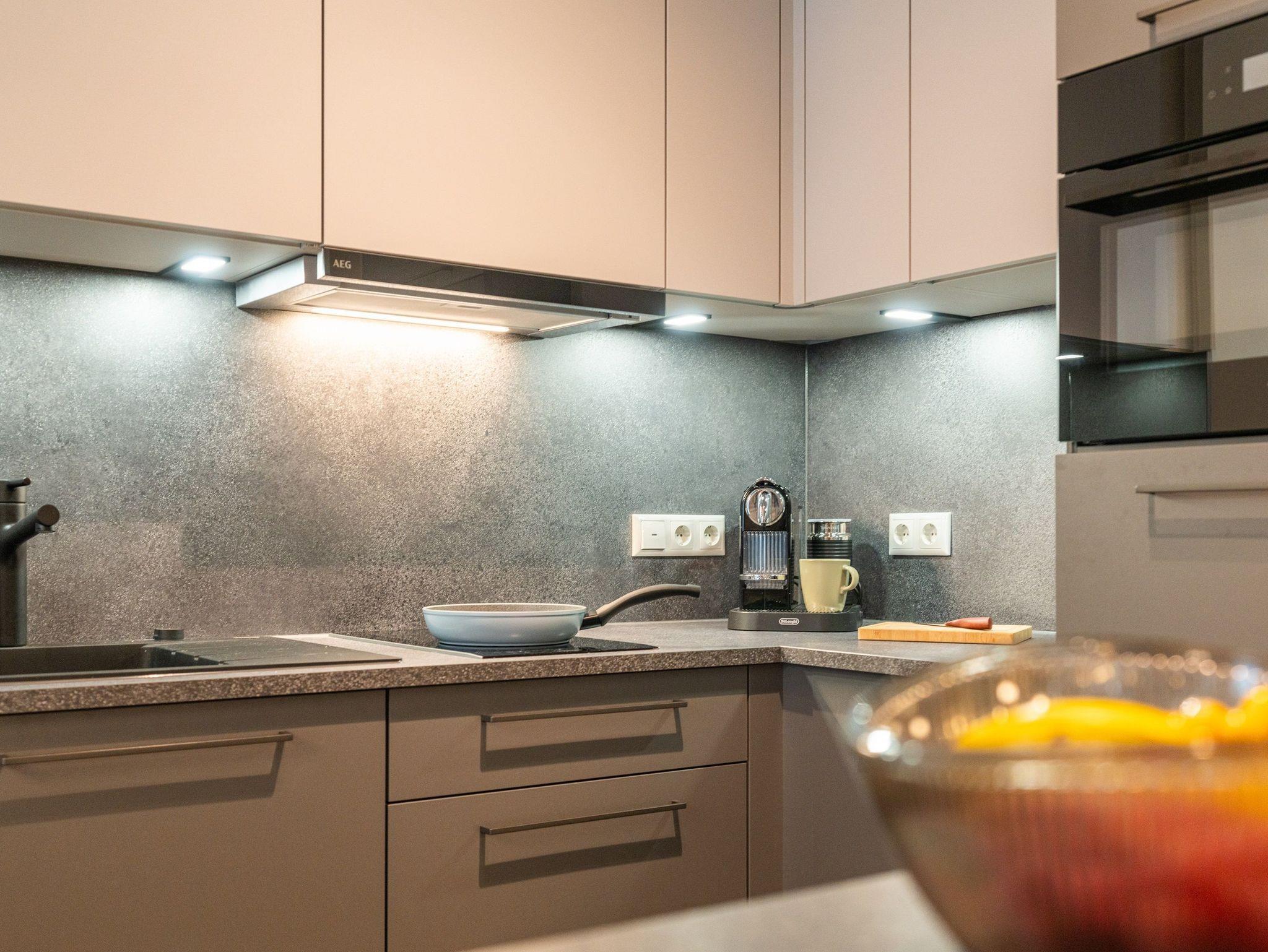 Die Küchenzeile verfügt über hochwertige Geräte wie Herd, Backofen mit integrierter Mikrowelle, 2-Platten-Induktionskochfeld, Kaffeefiltermaschine, Kühlschrank mit Gefrierfach, Nespressomaschine mit Milchaufschäumer sowie Spülmaschine. Ausreichend Geschirr, Besteck sowie Töpfe und Pfannen befinden sich in den Schränken. Am Esstisch finden Sie vor einem erholsamen Urlaubstag zu einem gemeinsamen Frühstück zusammen.