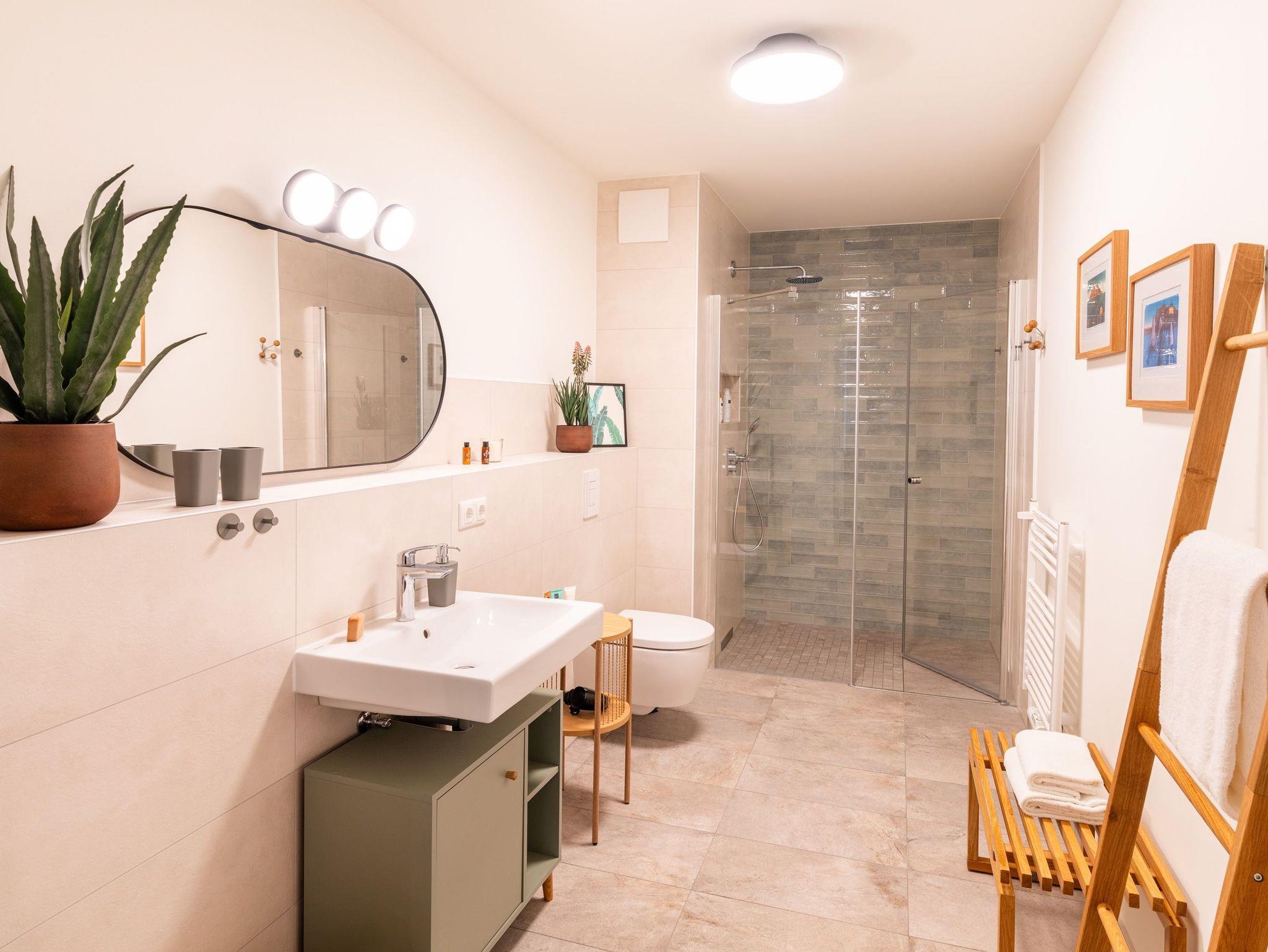 Das vollausgestattete Badezimmer verfügt über eine ebenerdige Dusche, WC, Waschtischanlage sowie Fön.