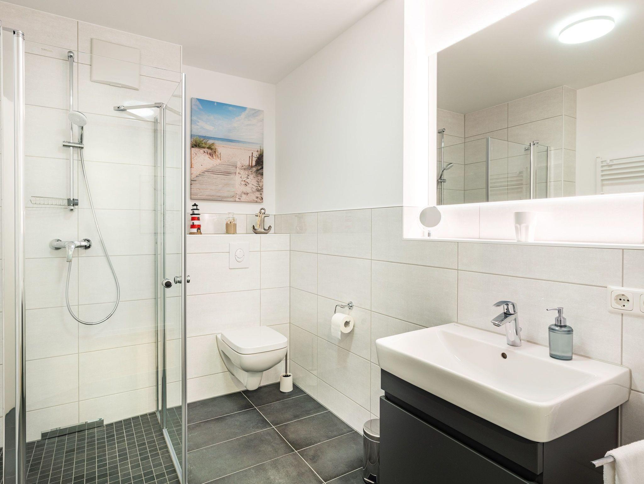 Die beiden vollausgestatteten Badezimmer verfügen jeweils über eine ebenerdige Dusche, WC, Waschtischanlage sowie Fön.