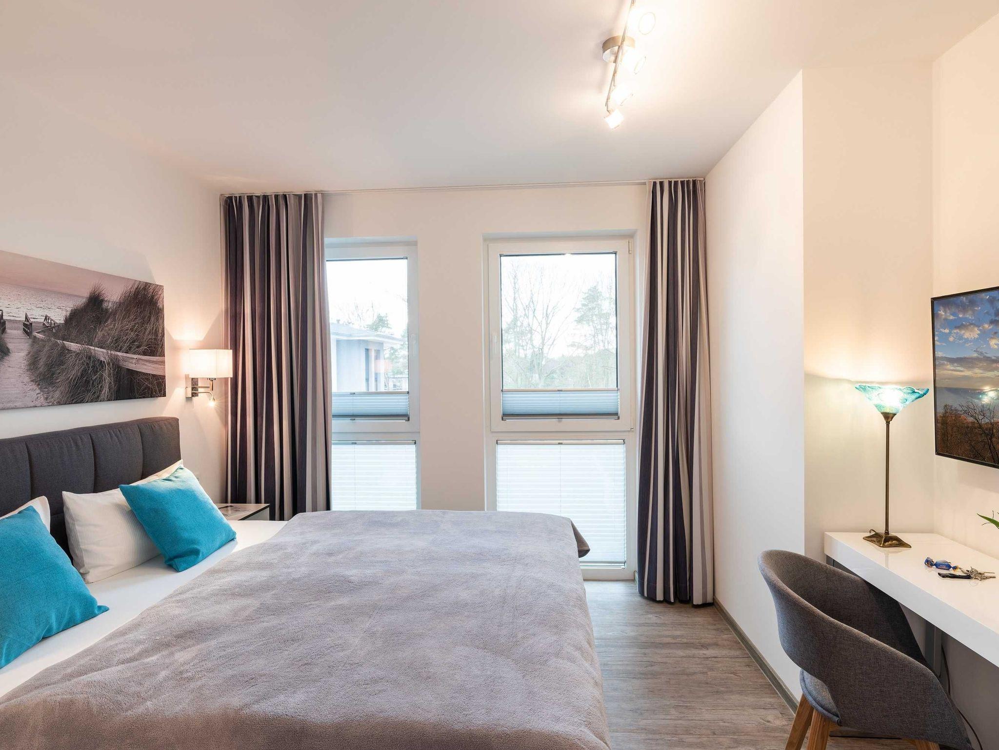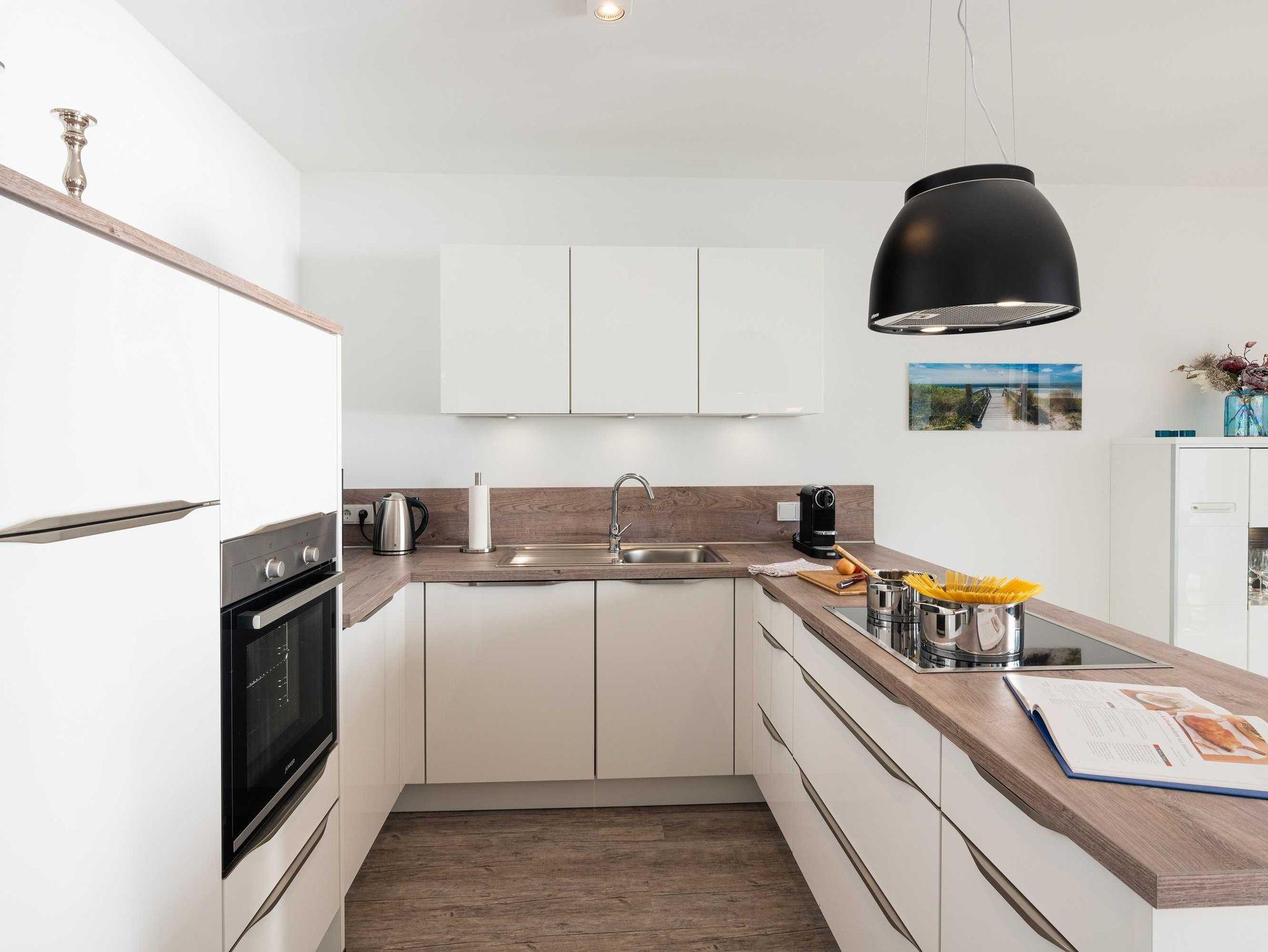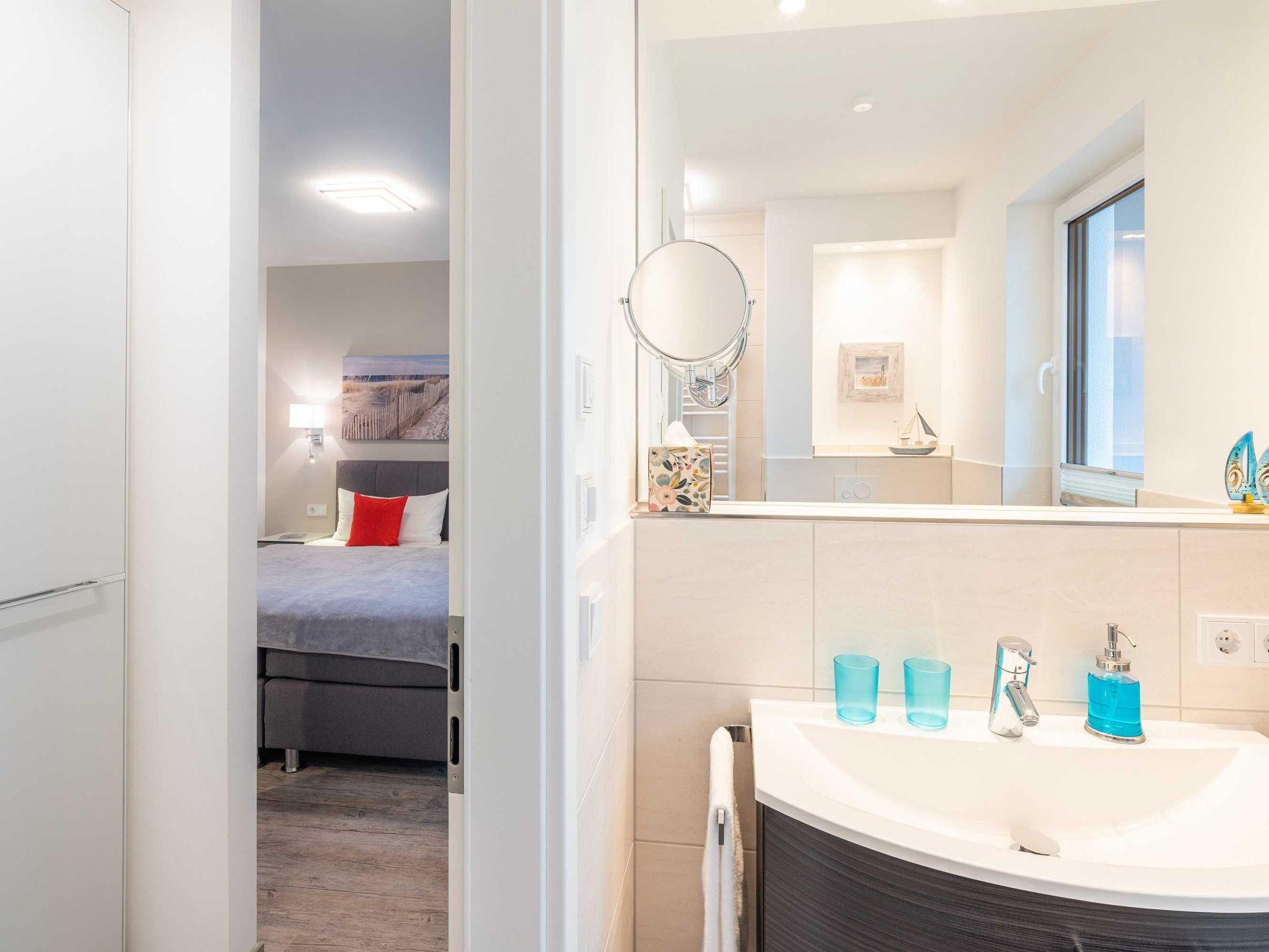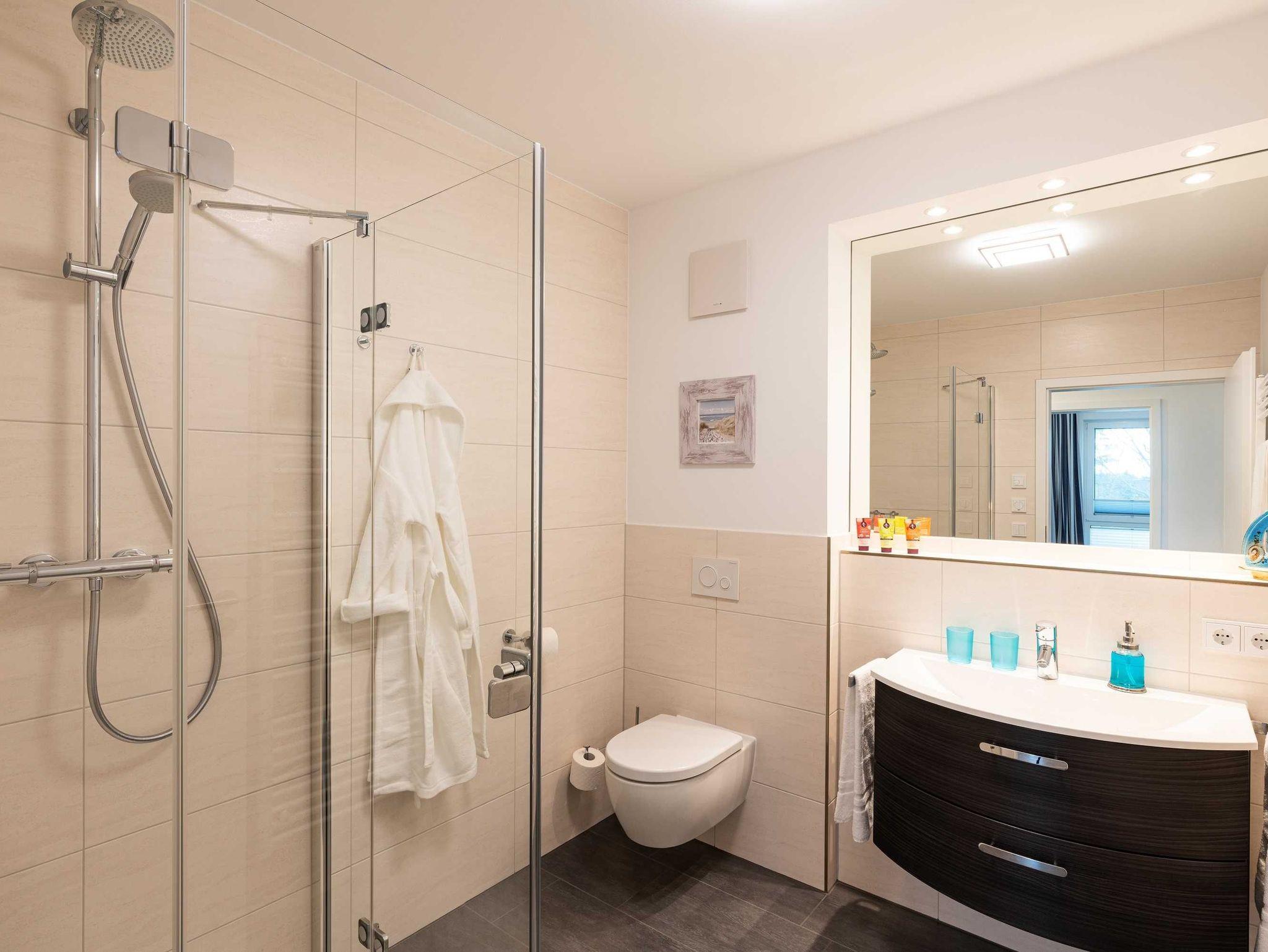 Diese lichtdurchflutete, helle 4-Zimmer-Wohnung im obersten Geschoss von Haus 6 (Aufzug vorhanden) mit Platz für maximal 6 Personen verfügt über eine Wohnfläche von 100 m² und hat 3 Schlafzimmer sowie 2 voll ausgestattete Duschbäder. Die große Sonnenterrasse mit 17 m² liegt in idealer Süd-Ausrichtung. Die Wohnung ist modern eingerichtet mit offenem Wohn-Essbereich, großem Esstisch, Ledersofa sowie Smart-TV (inkl. Sky-Abo). Die hochwertig ausgestattete Küche, offen zum Wohnbereich, lässt keine Wünsche offen. Erholsamer Schlaf in den beiden Schlafzimmern mit Boxspringbetten und Smart-TV ist garantiert. Im dritten Schlafzimmer befindet sich ein bequemes Schlafsofa (Liegefläche: 1,60 x 2,00 m) und ein Smart-TV. Das Badezimmer en Suite ist mit einer begehbaren Dusche ausgestattet. Auf der großen, überdachten Sonnenterrasse mit Essgruppe und jeweils zwei Relax-Sesseln und Fußhockern sowie einem Sonnenschirm können Sie die Seele baumeln lassen.