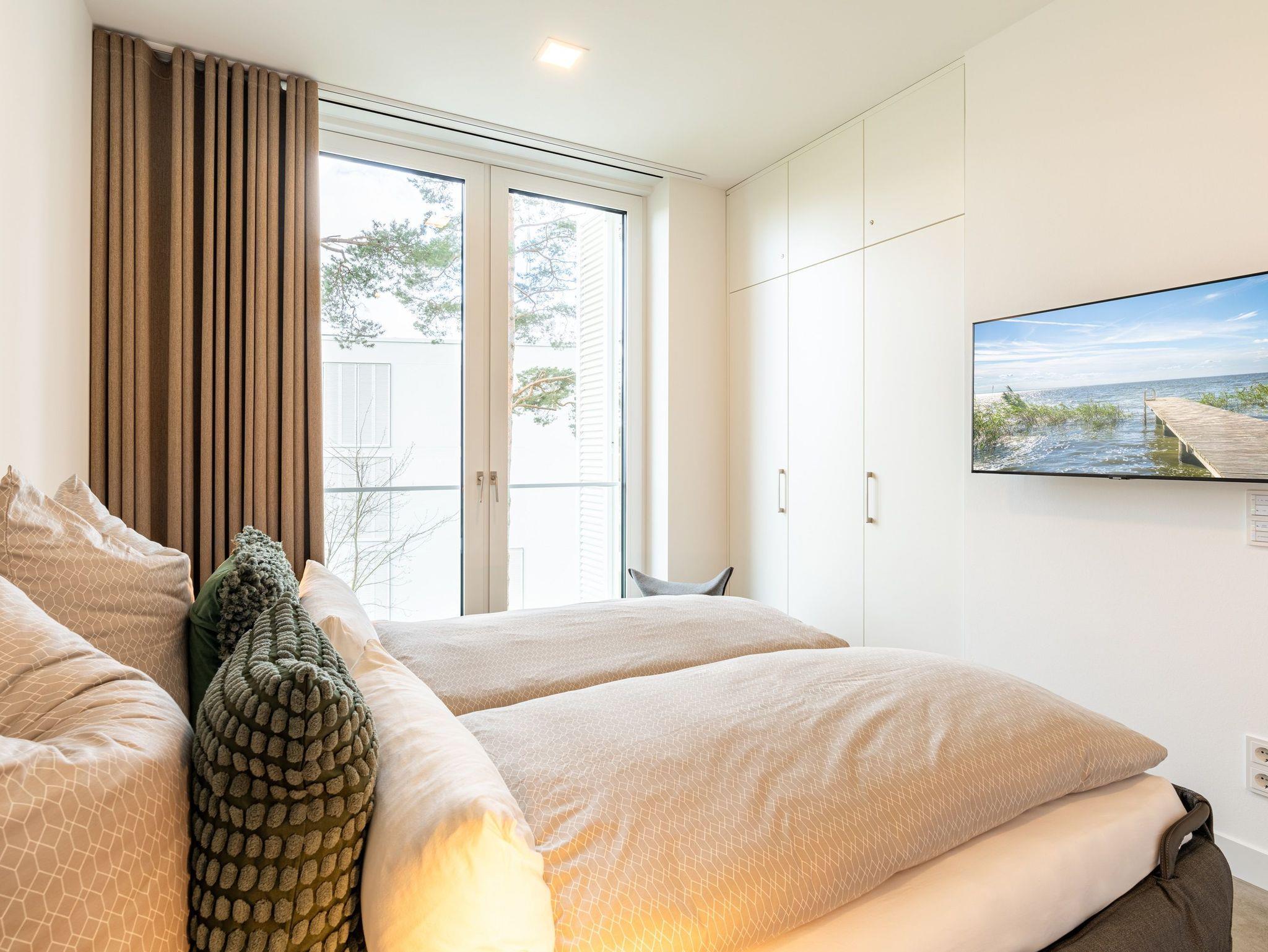 Das barrierefreie, in 2023/24 erbaute Apartment mit 109 qm mit Lanai und Haffblick im ersten Obergeschoss verfügt über kostenfreies WLAN, zwei Schlafzimmer (Platz für vier Personen plus Kleinkind im Babybett), ein Wohnzimmer, drei internetfähige Flachbild-TVs, eine voll-ausgestattete Küche mit Kühl- und Gefrierschrank, Backofen und Mikrowelle sowie Weinkühlschrank. Im Hauptschlafzimmer steht ein großes Doppelbett (180 x 200 cm), während das andere Schlafzimmer ein Schlafsofa mit einer vollwertigen Federkernmatratze (160 x 200 cm) bietet. Die beiden Badezimmer sind mit einer ebenerdigen Dusche ausgestattet, ein Badezimmer ist im en Suite-Style. Zusätzlich befindet sich auf dem Balkon mit idealer Süd-Ausrichtung eine eigene private Sauna. Handtücher und Bettwäsche sind im Preis enthalten, ebenso die Nutzung einer wohnungseigenen Waschmaschine. Zudem wird ein Sauna-Set mit kuscheligem Bademantel sowie einem Saunahandtuch angeboten.