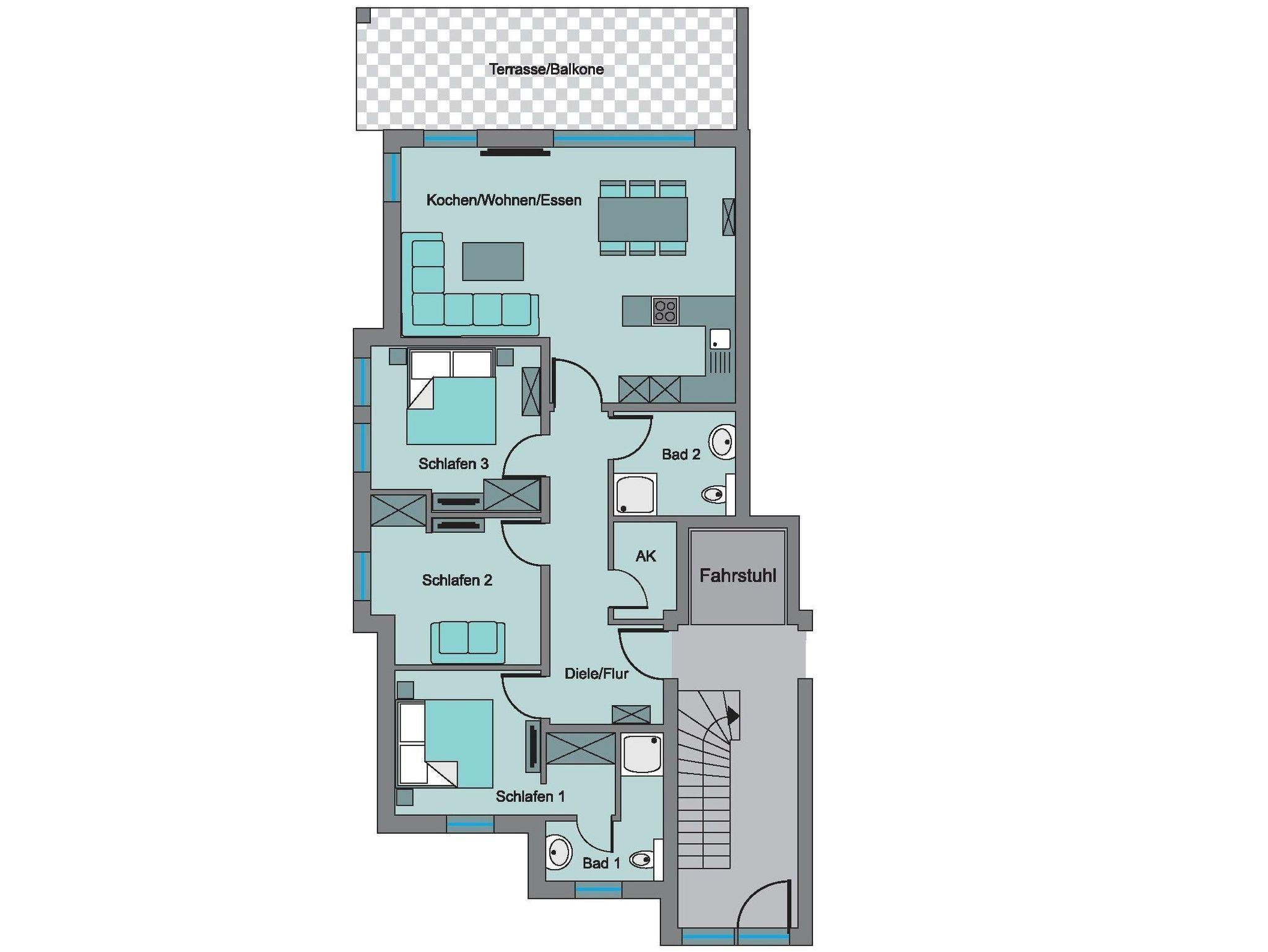 Die barrierefreie und sonnendurchflutete 4-Zimmer-Ferienwohnung liegt im ersten Obergeschoss des 8-Parteienhauses. Ein Aufzug ist vorhanden, der jede Etage anfährt.