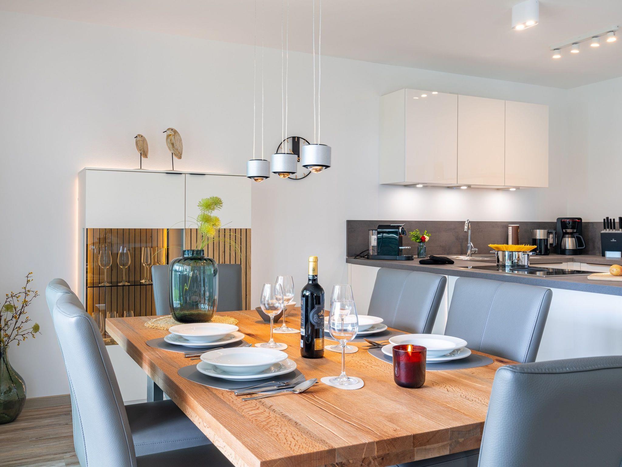 Eine Essgruppe mit Lederstühlen, ein bequemes Eckledersofa und ein Ledersessel vervollständigen die hochwertige und geschmackvolle Einrichtung.