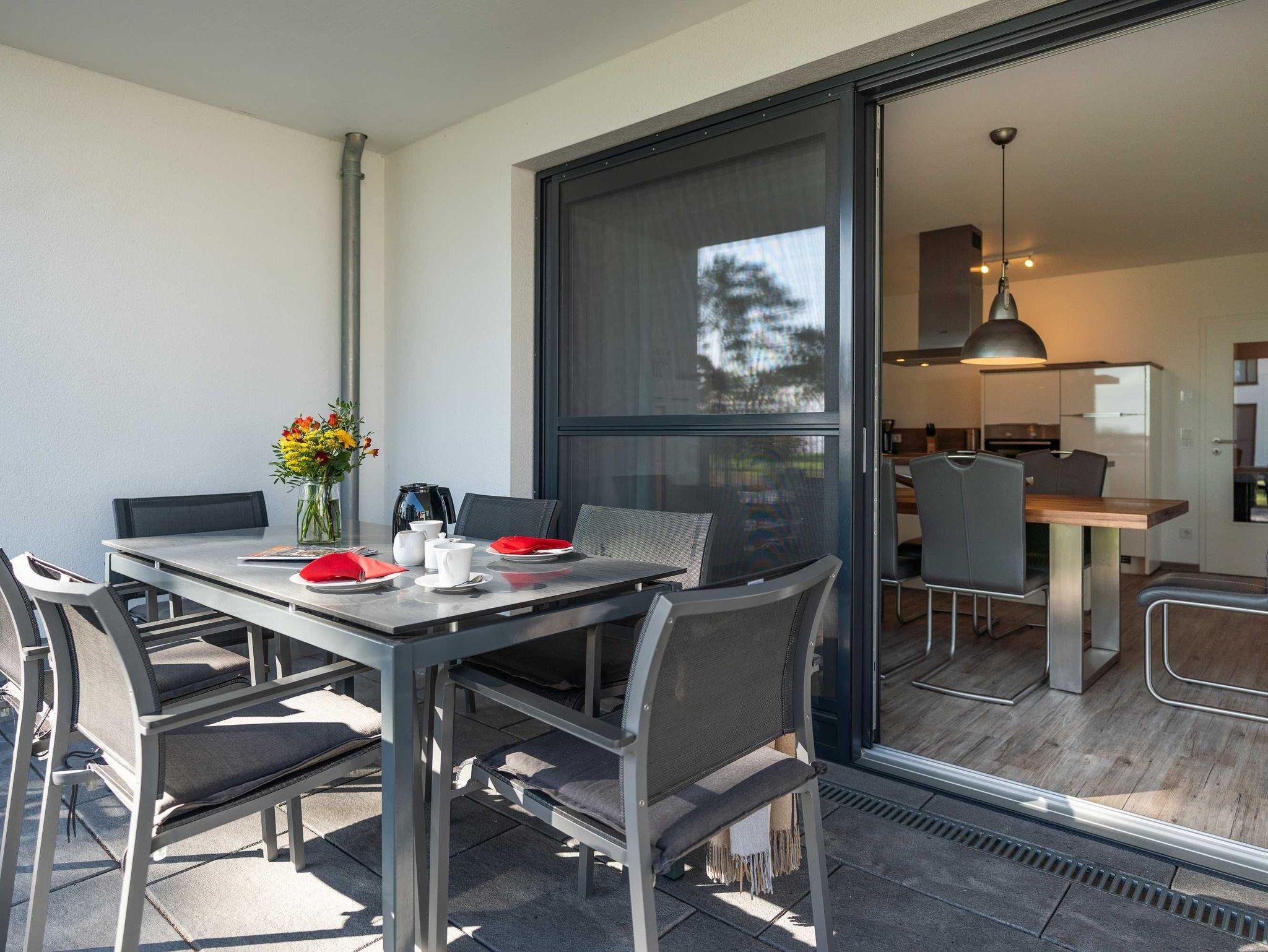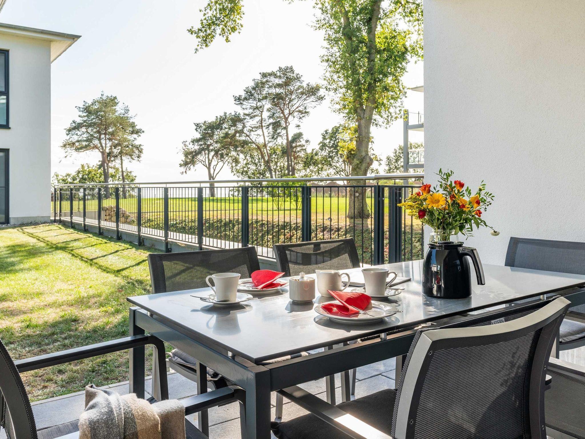 Erleben Sie Ruhe und Komfort in der luxuriösen Terrassenwohnung Inselreich auf Usedom mit traumhaftem Blick aufs Stettiner Haff.