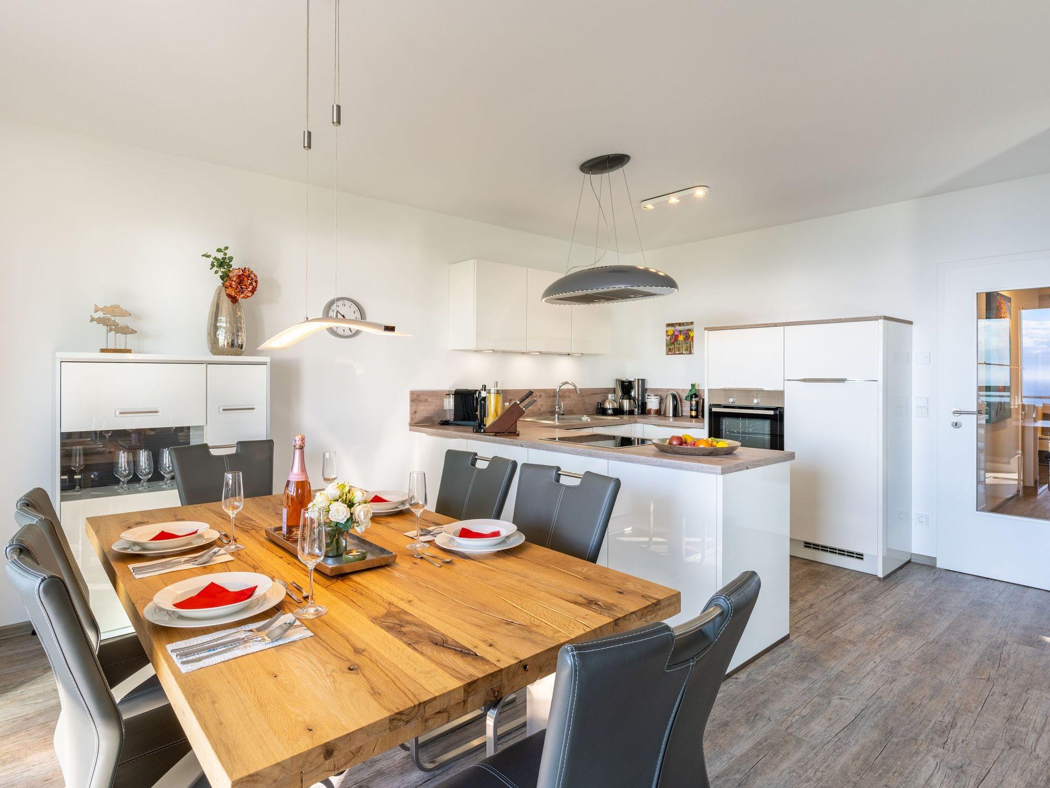 Die Wohnung ist modern eingerichtet mit offenem Wohn-Essbereich, großem Esstisch, Ledersofa sowie Smart-TV (inkl. Sky-Abo).