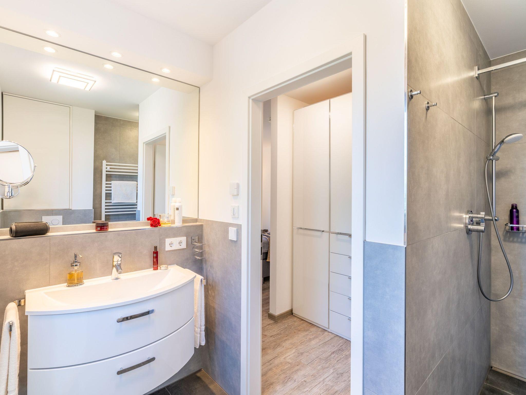 Das Badezimmer en suite ist mit einer begehbaren Dusche ausgestattet. Auf dem überdachten Sonnenbalkon mit Essgruppe und zwei Relax-Sesseln, Fußhockern sowie einem Sonnenschirm können Sie die Seele baumeln lassen.