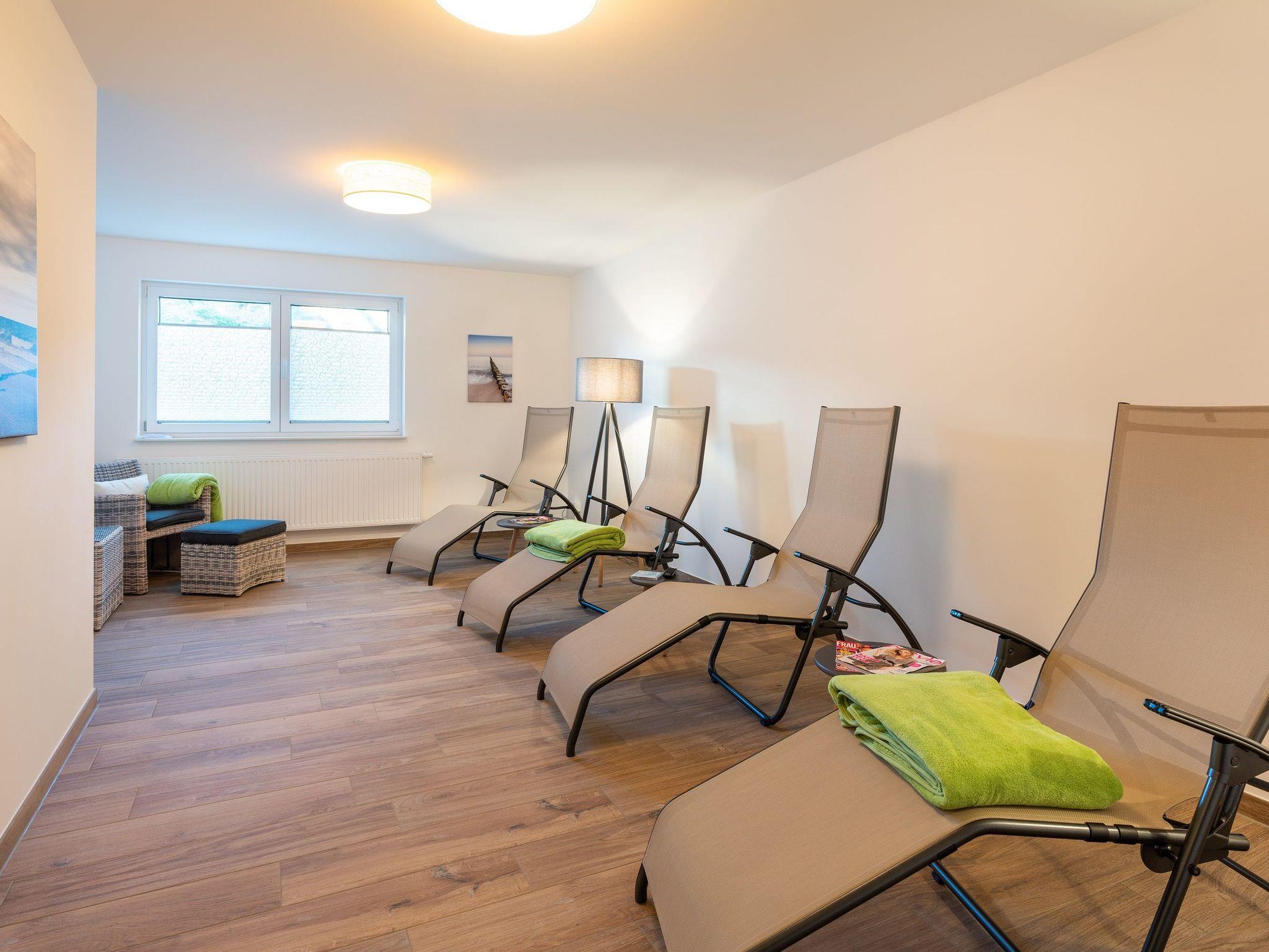Die Wellness- und Freizeitbereiche (Sauna, Infrarotkabine, Ruheraum, Fitnessraum mit Tischtennisplatte) befinden sich im Souterrain des Hauses und können kostenlos genutzt werden.