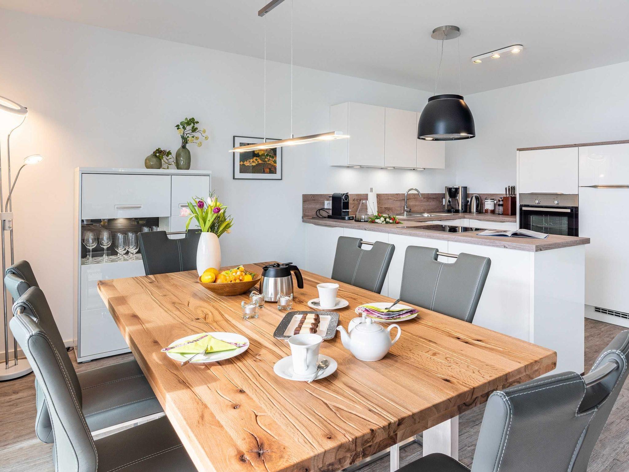 Diese lichtdurchflutete, helle 4-Zimmer-Wohnung im obersten Geschoss von Haus 6 (Aufzug vorhanden) mit Platz für maximal 6 Personen verfügt über eine Wohnfläche von 100 m² und hat 3 Schlafzimmer sowie 2 voll ausgestattete Duschbäder. Die große Sonnenterrasse mit 17 m² liegt in idealer Süd-Ausrichtung. Die Wohnung ist modern eingerichtet mit offenem Wohn-Essbereich, großem Esstisch, Ledersofa sowie Smart-TV (inkl. Sky-Abo). Die hochwertig ausgestattete Küche, offen zum Wohnbereich, lässt keine Wünsche offen. Erholsamer Schlaf in den beiden Schlafzimmern mit Boxspringbetten und Smart-TV ist garantiert. Im dritten Schlafzimmer befindet sich ein bequemes Schlafsofa (Liegefläche: 1,60 x 2,00 m) und ein Smart-TV. Das Badezimmer en Suite ist mit einer begehbaren Dusche ausgestattet. Auf der großen, überdachten Sonnenterrasse mit Essgruppe und jeweils zwei Relax-Sesseln und Fußhockern sowie einem Sonnenschirm können Sie die Seele baumeln lassen.
