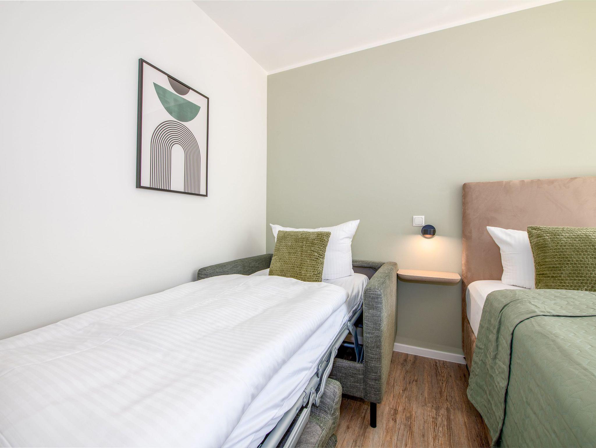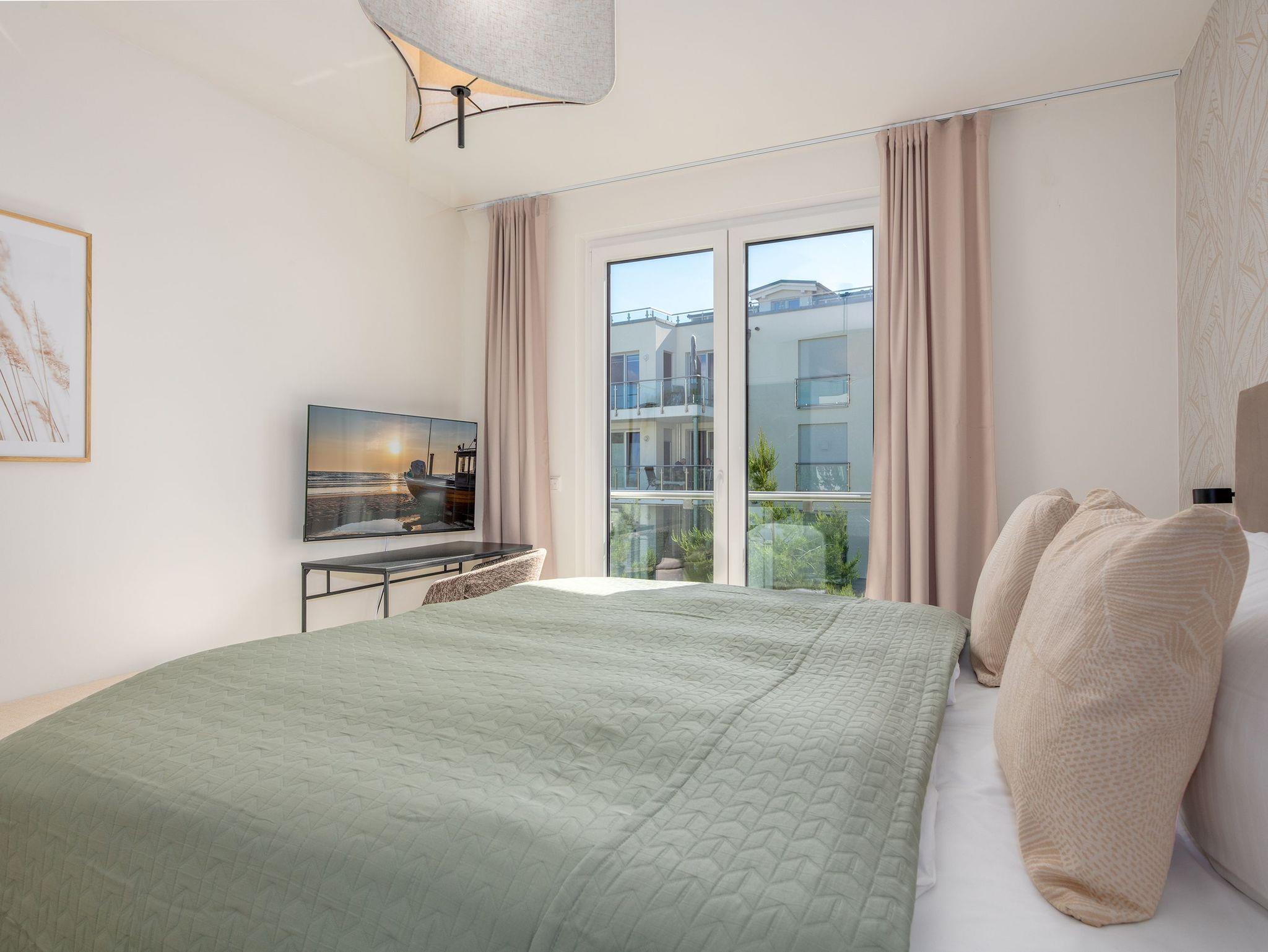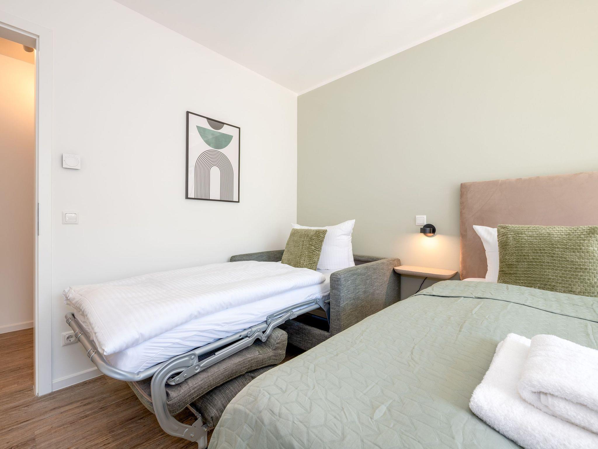 Zwei Schlafzimmer mit hochwertigen Doppelbetten (1,80m x 2,00m) sorgen für erholsame Nächte. Beide Schlafzimmer haben einen Smart-TV. In einem der Zimmer steht zusätzlich ein ausklappbarer Schlafsessel ( 0,8m x 2,00m) für eine fünfte Person bereit. Zwei moderne Bäder ergänzen das Wohnkonzept.