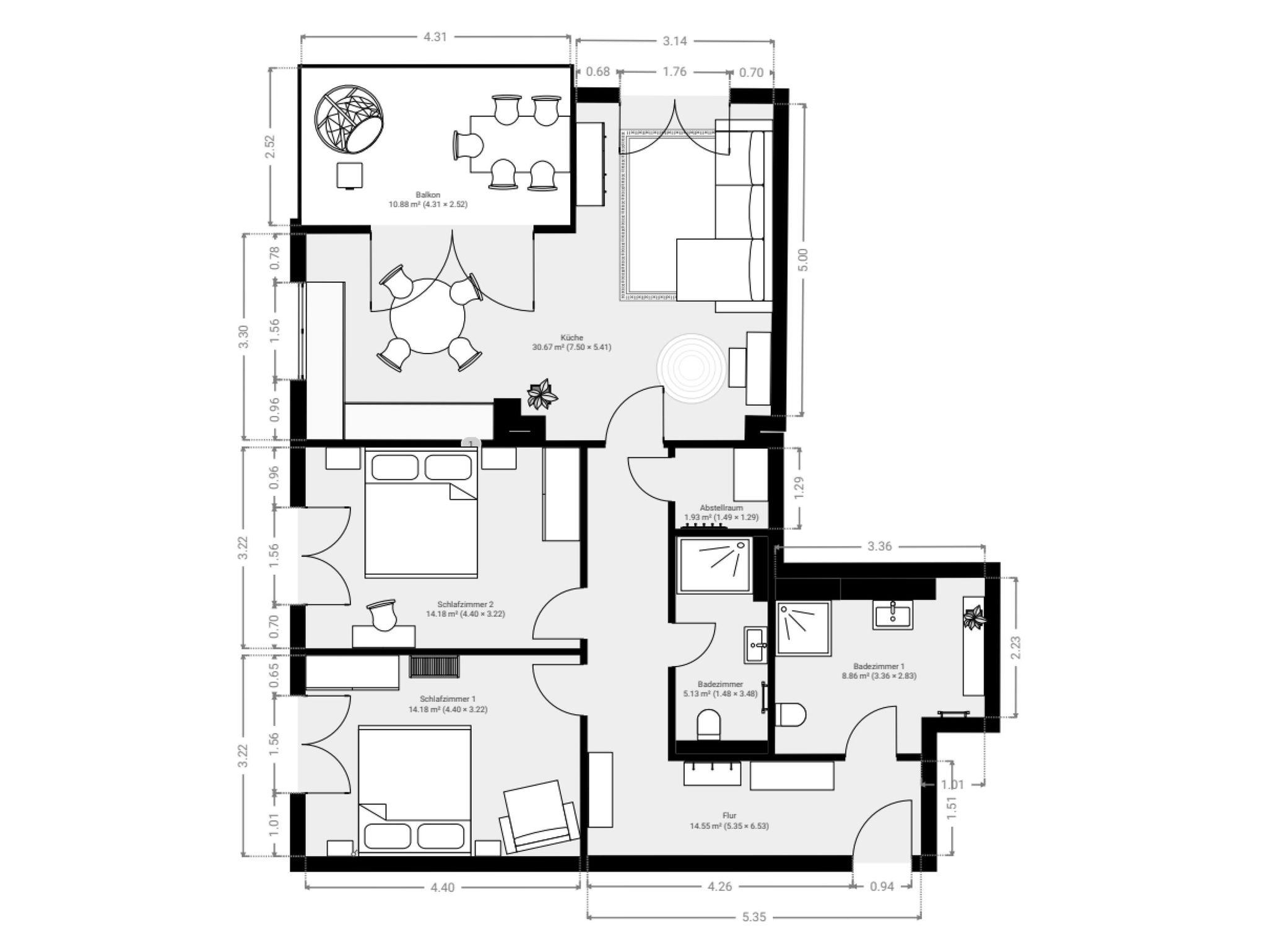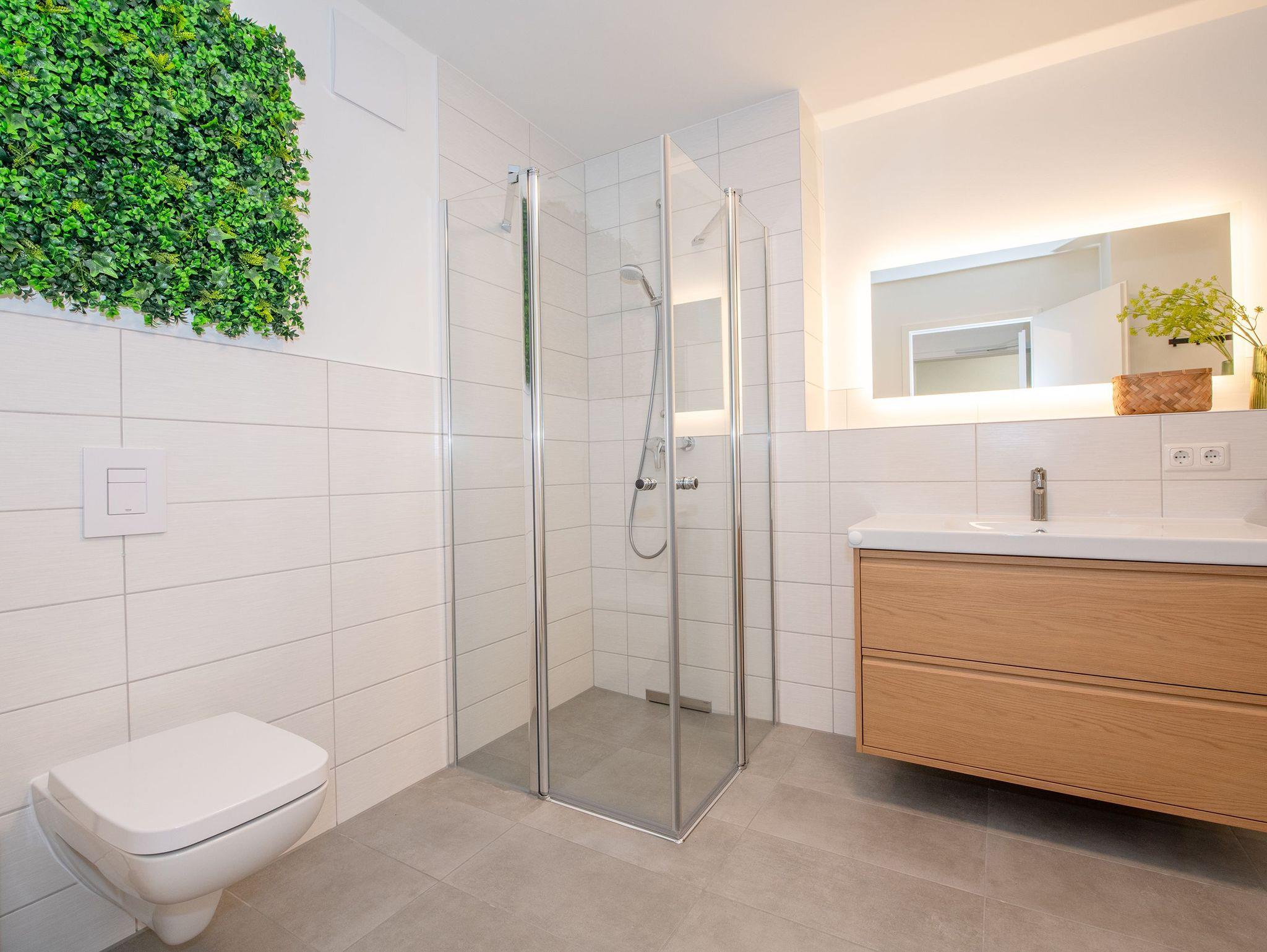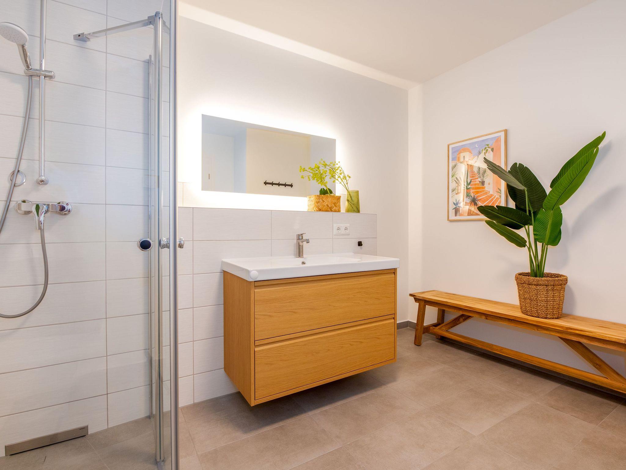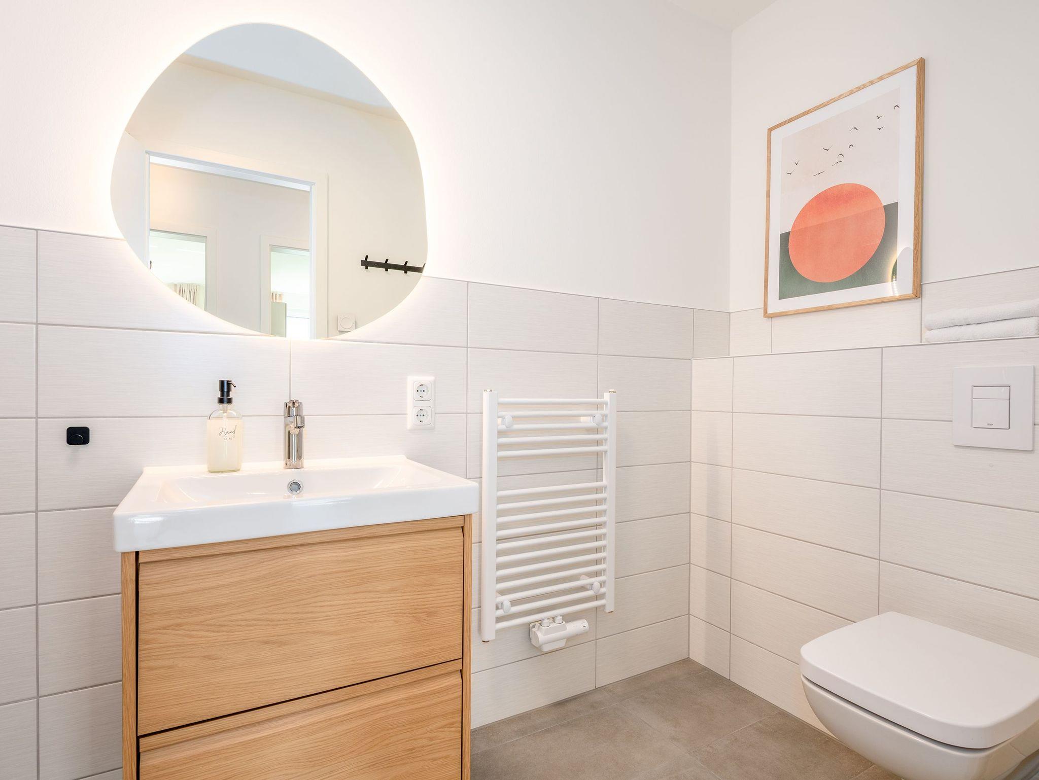 Zwei Schlafzimmer mit hochwertigen Doppelbetten (1,80m x 2,00m) sorgen für erholsame Nächte. Beide Schlafzimmer haben einen Smart-TV. In einem der Zimmer steht zusätzlich ein ausklappbarer Schlafsessel ( 0,8m x 2,00m) für eine fünfte Person bereit. Zwei moderne Bäder ergänzen das Wohnkonzept.