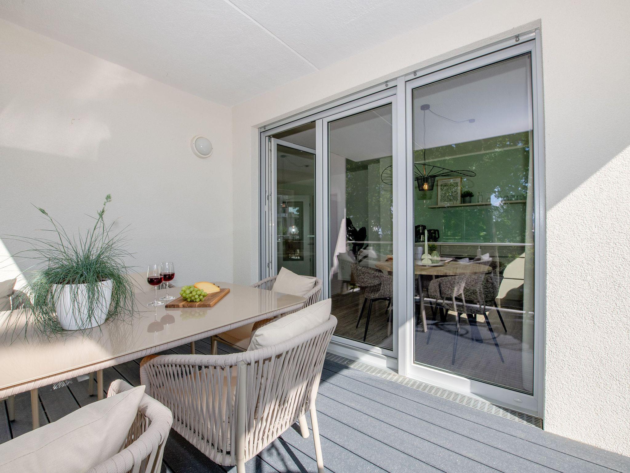 Der offene Wohnbereich mit gemütlichem Sofa, Smart-TV und kleiner Kinderspielecke bietet viel Raum zum Entspannen. Die angrenzende Küche ist komplett ausgestattet und ideal für gemeinsames Kochen. Vom Wohnbereich aus gelangen Sie auf den sonnigen Balkon, der mit bequemen Sitzmöbeln mit Blick auf das Stettiner Haff zum Frühstücken, Lesen oder Verweilen im Freien einlädt.