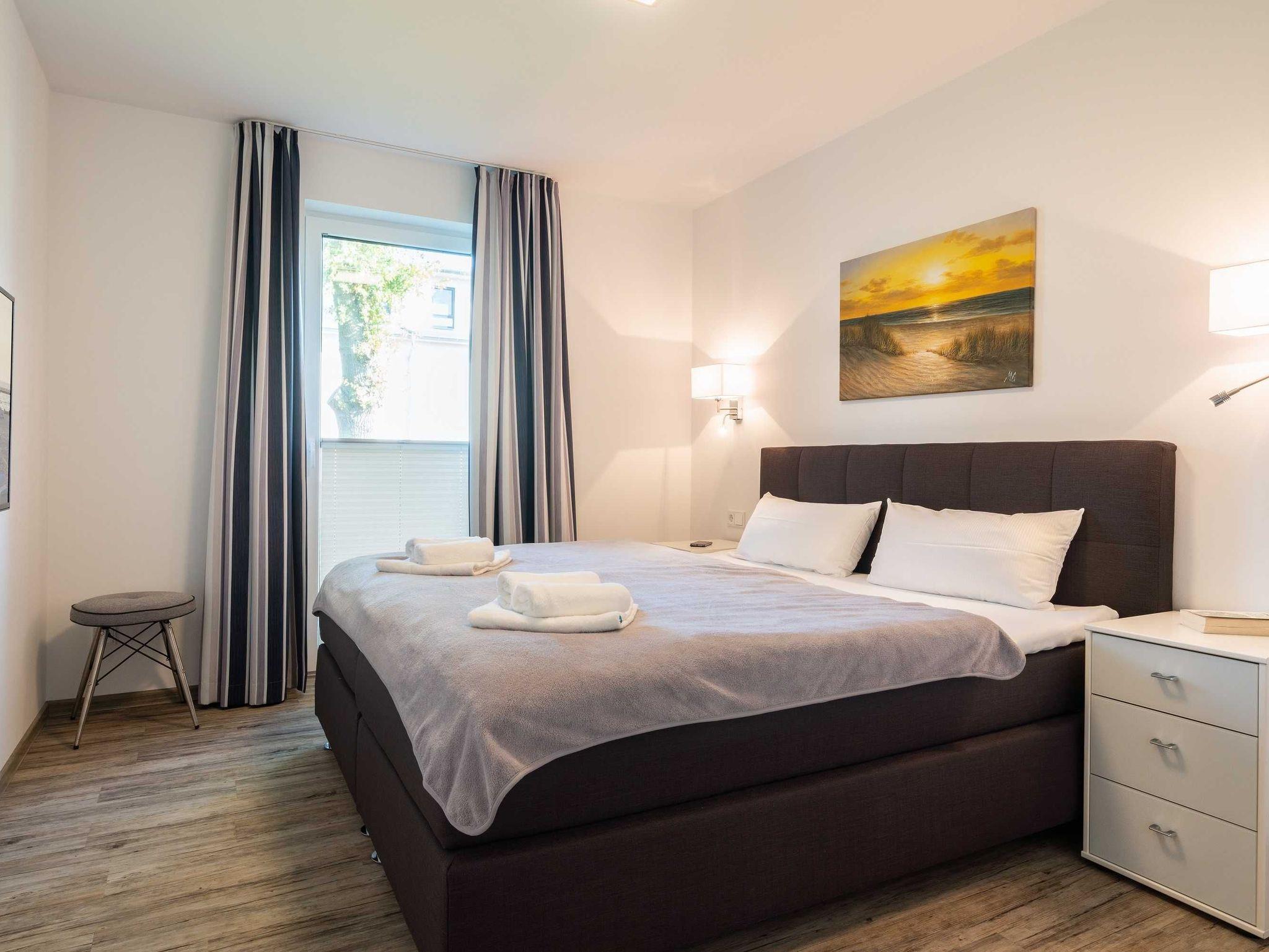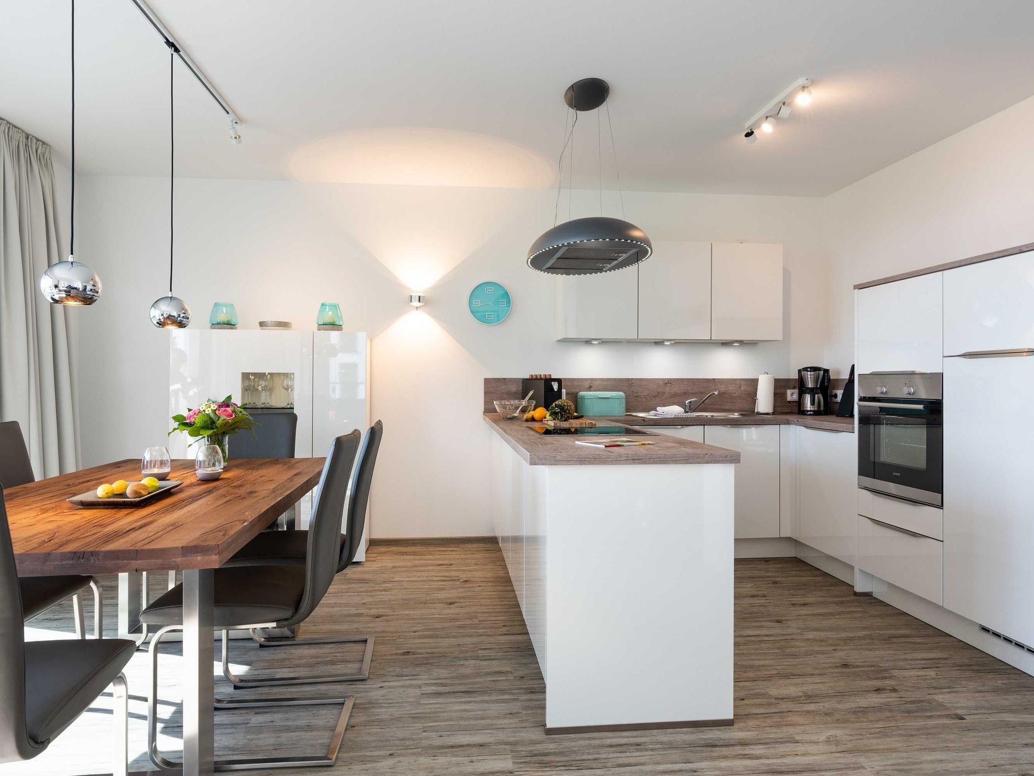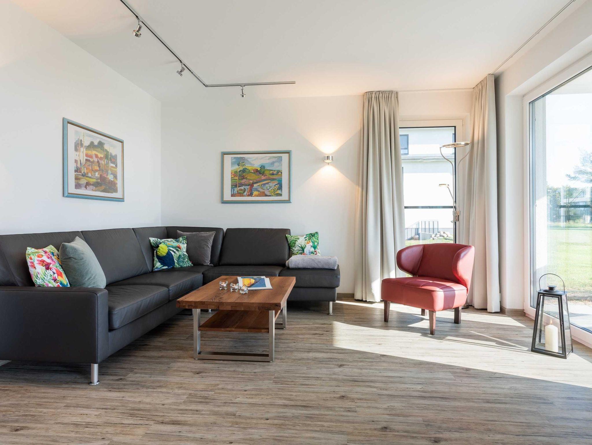 Diese luxuriöse 4-Zimmer-Wohnung im Erdgeschoss von Haus 4 mit Platz für maximal 6 Personen sowie einem Kleinkind bis 2 Jahre im Babybett verfügt über eine Wohnfläche von 119 m² und hat 3 Schlafzimmer sowie 2 voll ausgestattete Duschbäder. Die große Sonnenterrasse mit 21 m² liegt in idealer Süd-Ausrichtung. Die Wohnung ist modern eingerichtet mit offenem Wohn-Essbereich, großem Esstisch, Ledersofa sowie Smart-TV (inkl. Sky-Abo). Die hochwertig ausgestattete Küche, offen zum Wohnbereich, lässt keine Wünsche offen. Erholsamer Schlaf in den beiden Schlafzimmern mit Boxspringbetten und Smart-TV ist garantiert. Im dritten Schlafzimmer befindet sich ein bequemes Schlafsofa (Liegefläche: 1,80 x 2,00 m) und ein Smart-TV. Das Badezimmer en Suite ist mit einer begehbaren Dusche ausgestattet. Auf der großen, überdachten Sonnenterrasse mit Essgruppe und jeweils zwei Relax-Sesseln, Fußhockern, Sonnenschirm und Sonnenliegen können Sie die Seele baumeln lassen.