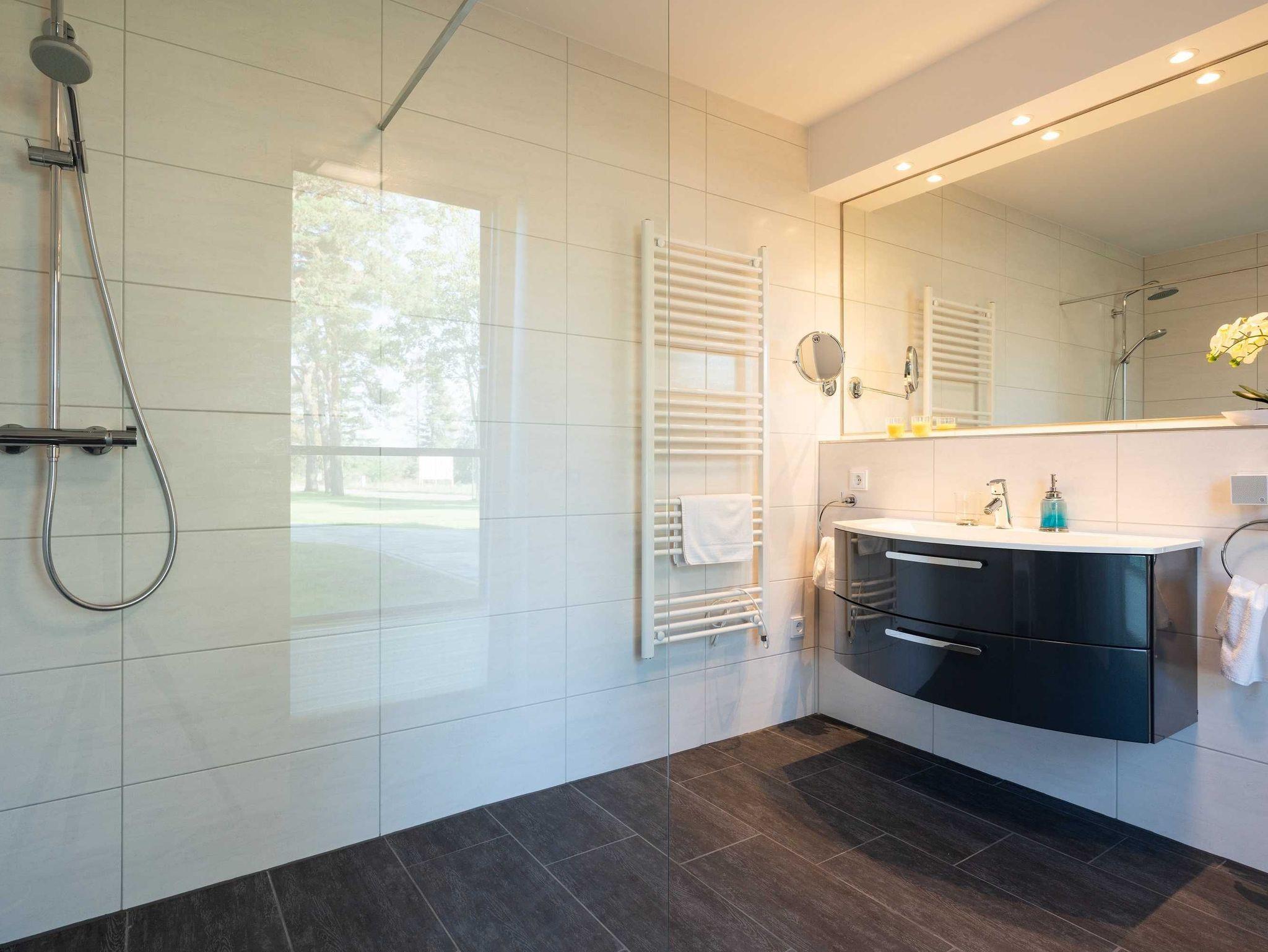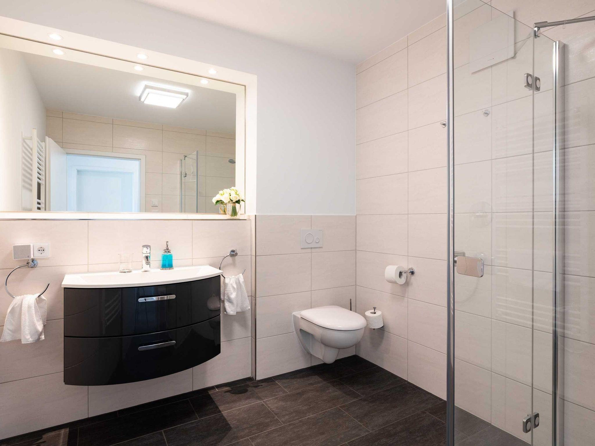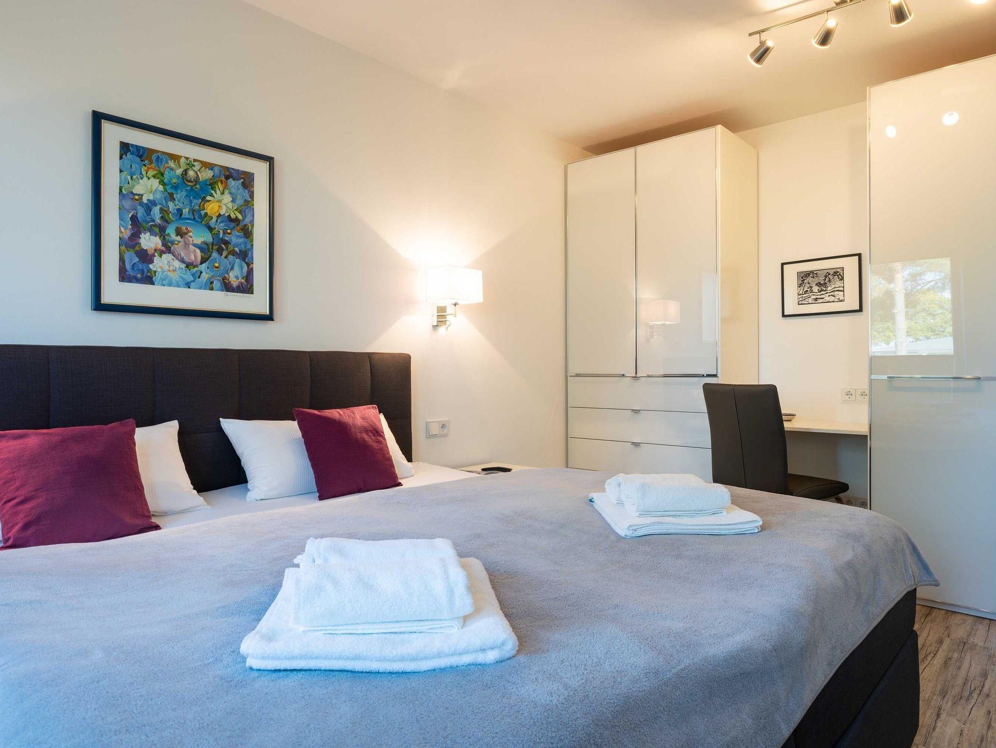 Diese luxuriöse 4-Zimmer-Wohnung im Erdgeschoss von Haus 4 mit Platz für maximal 6 Personen sowie einem Kleinkind bis 2 Jahre im Babybett verfügt über eine Wohnfläche von 119 m² und hat 3 Schlafzimmer sowie 2 voll ausgestattete Duschbäder. Die große Sonnenterrasse mit 21 m² liegt in idealer Süd-Ausrichtung. Die Wohnung ist modern eingerichtet mit offenem Wohn-Essbereich, großem Esstisch, Ledersofa sowie Smart-TV (inkl. Sky-Abo). Die hochwertig ausgestattete Küche, offen zum Wohnbereich, lässt keine Wünsche offen. Erholsamer Schlaf in den beiden Schlafzimmern mit Boxspringbetten und Smart-TV ist garantiert. Im dritten Schlafzimmer befindet sich ein bequemes Schlafsofa (Liegefläche: 1,80 x 2,00 m) und ein Smart-TV. Das Badezimmer en Suite ist mit einer begehbaren Dusche ausgestattet. Auf der großen, überdachten Sonnenterrasse mit Essgruppe und jeweils zwei Relax-Sesseln, Fußhockern, Sonnenschirm und Sonnenliegen können Sie die Seele baumeln lassen.