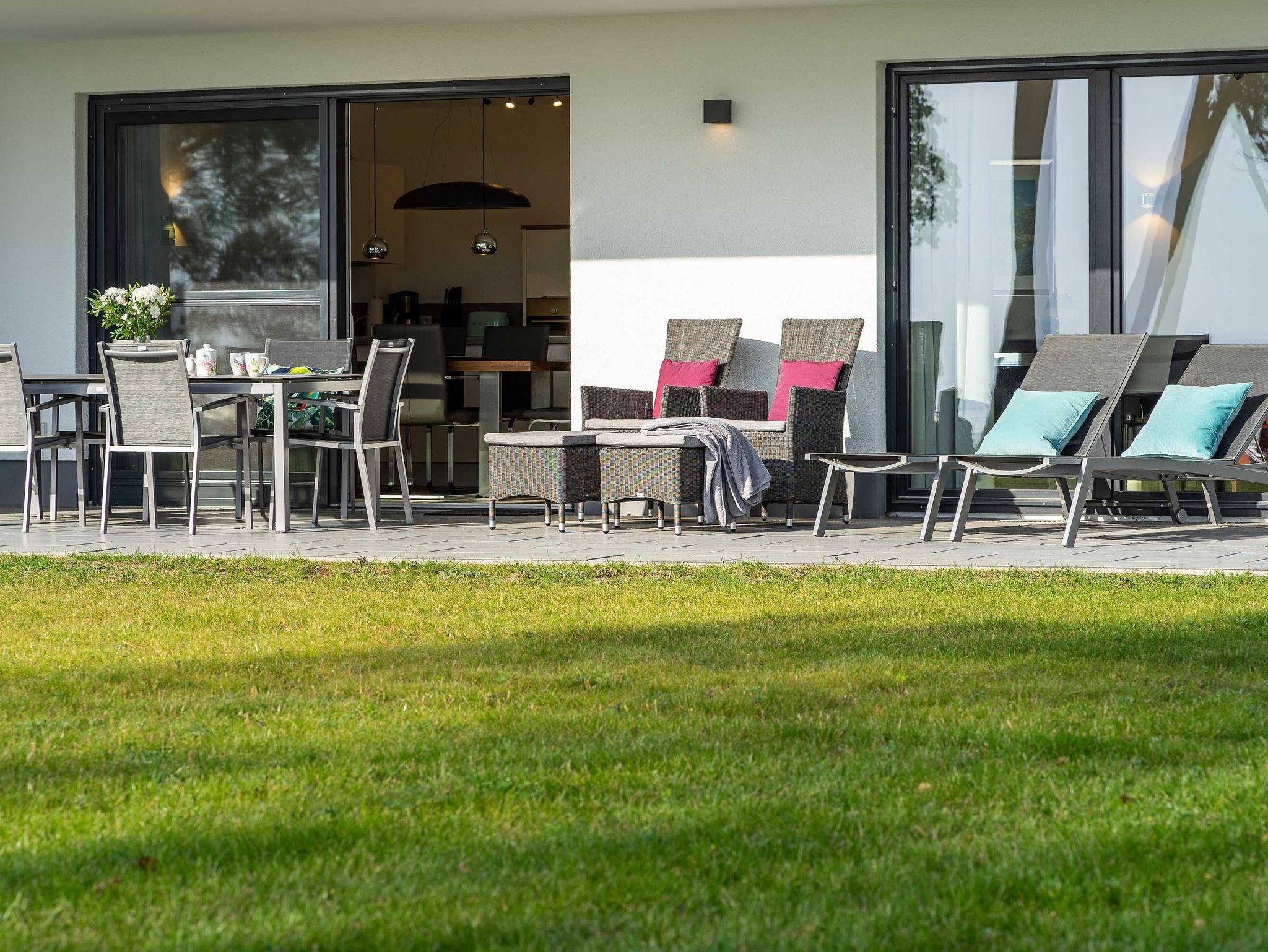 Unsere sieben Ferienhäuser sind auf die Haffküste ausgerichtet. Sie stehen auf einer weitflächigen Außenanlage, umgeben von ebenen Rasenflächen und angelegten Gehwegen, zueinander. Unsere Anlage erstreckt sich bis direkt an die Steilküste, an der einzelne Sitzgruppen mit einem endlosen Blick über das Haff zum Entspannen einladen.