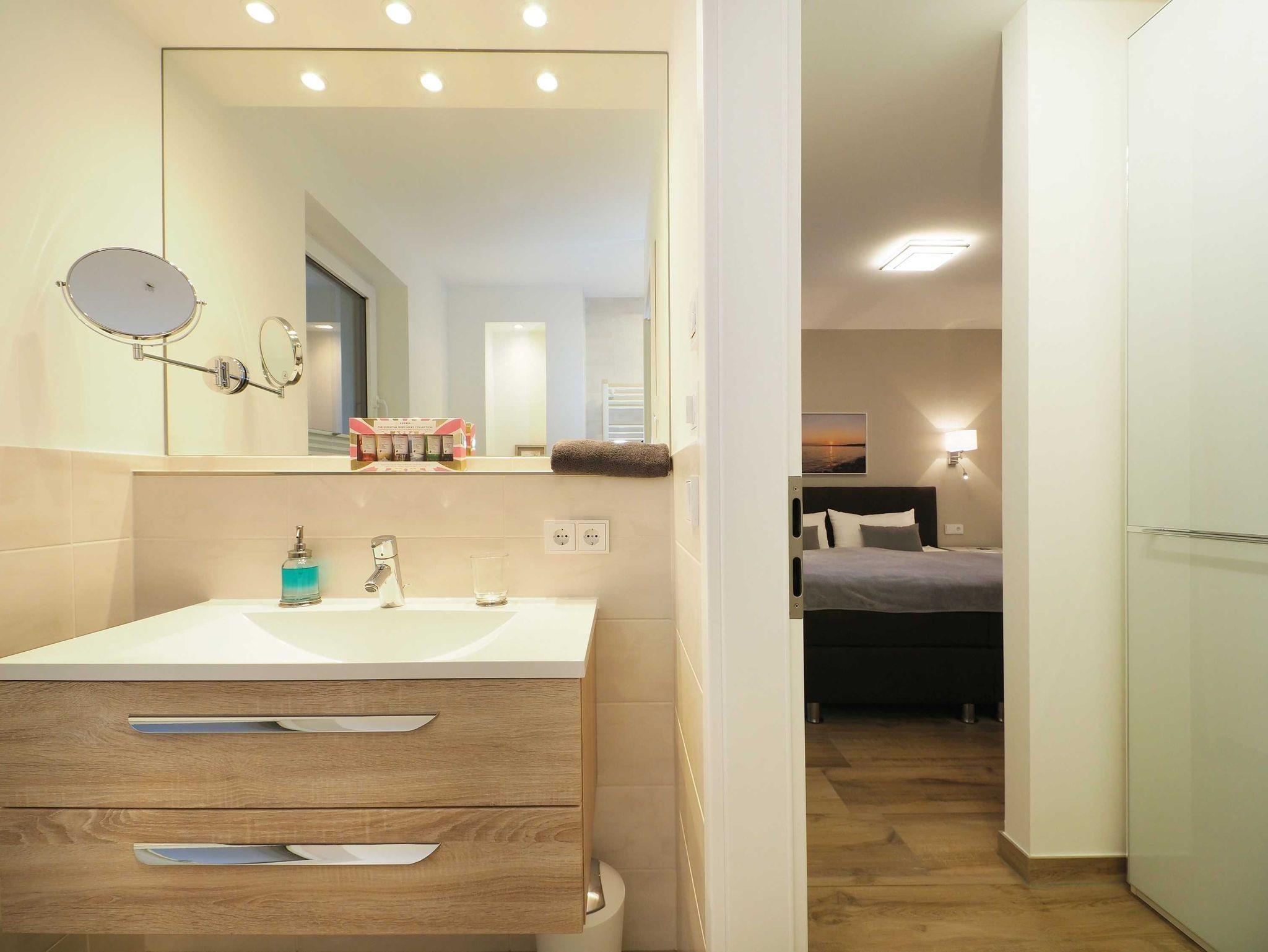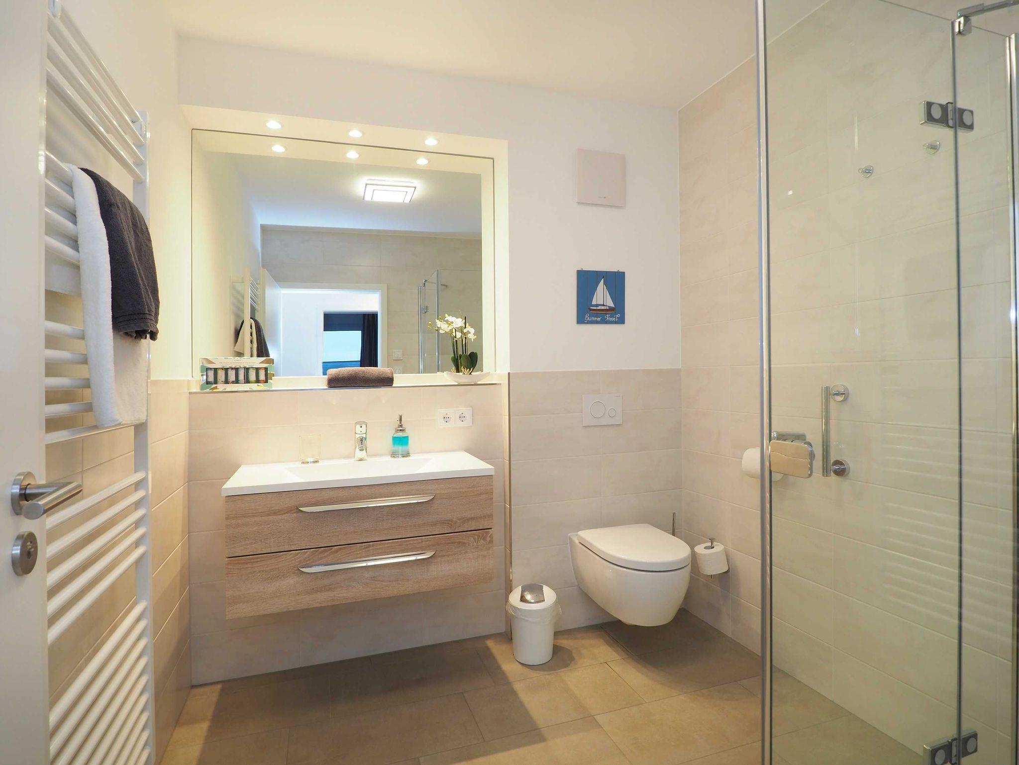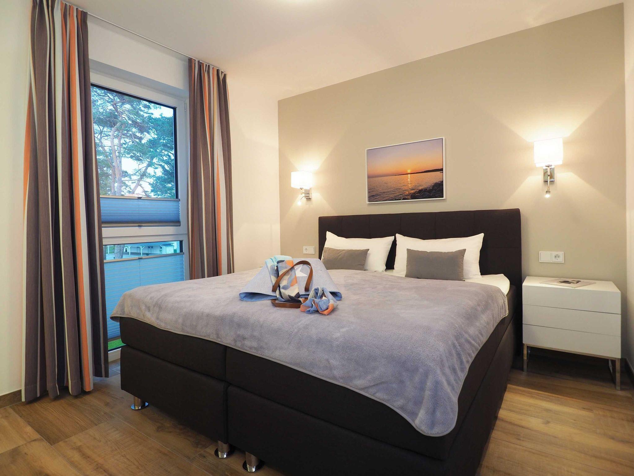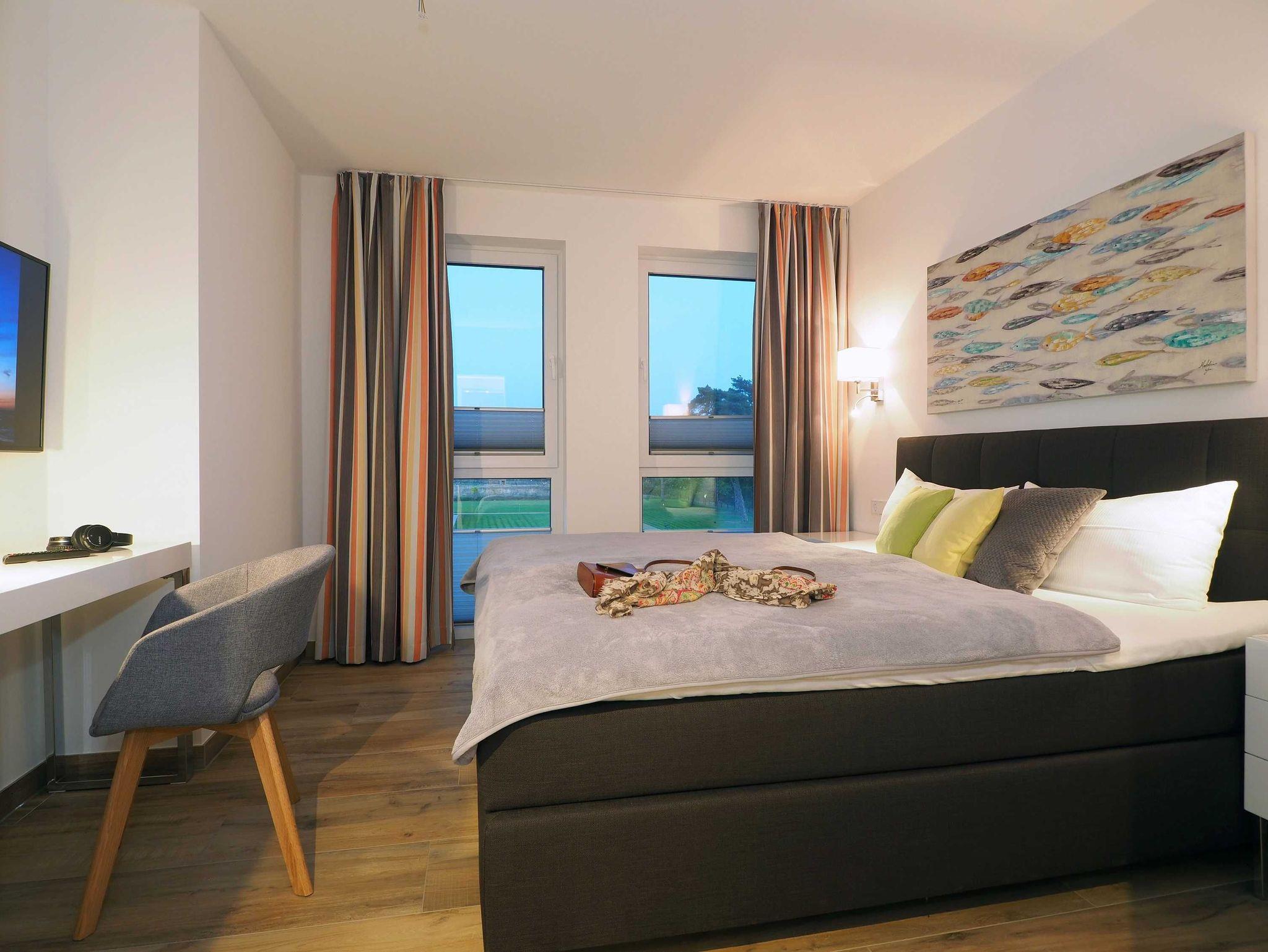 Diese lichtdurchflutete, helle 4-Zimmer-Wohnung im obersten Geschoss von Haus 5 (Aufzug vorhanden) mit Platz für maximal 6 Personen verfügt über eine Wohnfläche von 100 m² und hat 3 Schlafzimmer sowie 2 voll ausgestattete Duschbäder. Die große Sonnenterrasse mit 17 m² liegt in idealer Süd-Ausrichtung. Die Wohnung ist modern eingerichtet mit offenem Wohn-Essbereich, großem Esstisch, Ledersofa sowie Smart-TV (inkl. Sky-Abo). Die hochwertig ausgestattete Küche, offen zum Wohnbereich, lässt keine Wünsche offen. Erholsamer Schlaf in den beiden Schlafzimmern mit Boxspringbetten und Smart-TV ist garantiert. Im dritten Schlafzimmer befindet sich ein bequemes Schlafsofa (Liegefläche: 1,60 x 2,00 m), Schreibtisch und Smart-TV. Das Badezimmer en Suite ist mit einer begehbaren Dusche ausgestattet. Auf dem großen, überdachten Sonnenbalkon mit Essgruppe und zwei Relax-Sesseln, Fußhockern sowie einem Sonnenschirm können Sie die Seele baumeln lassen.