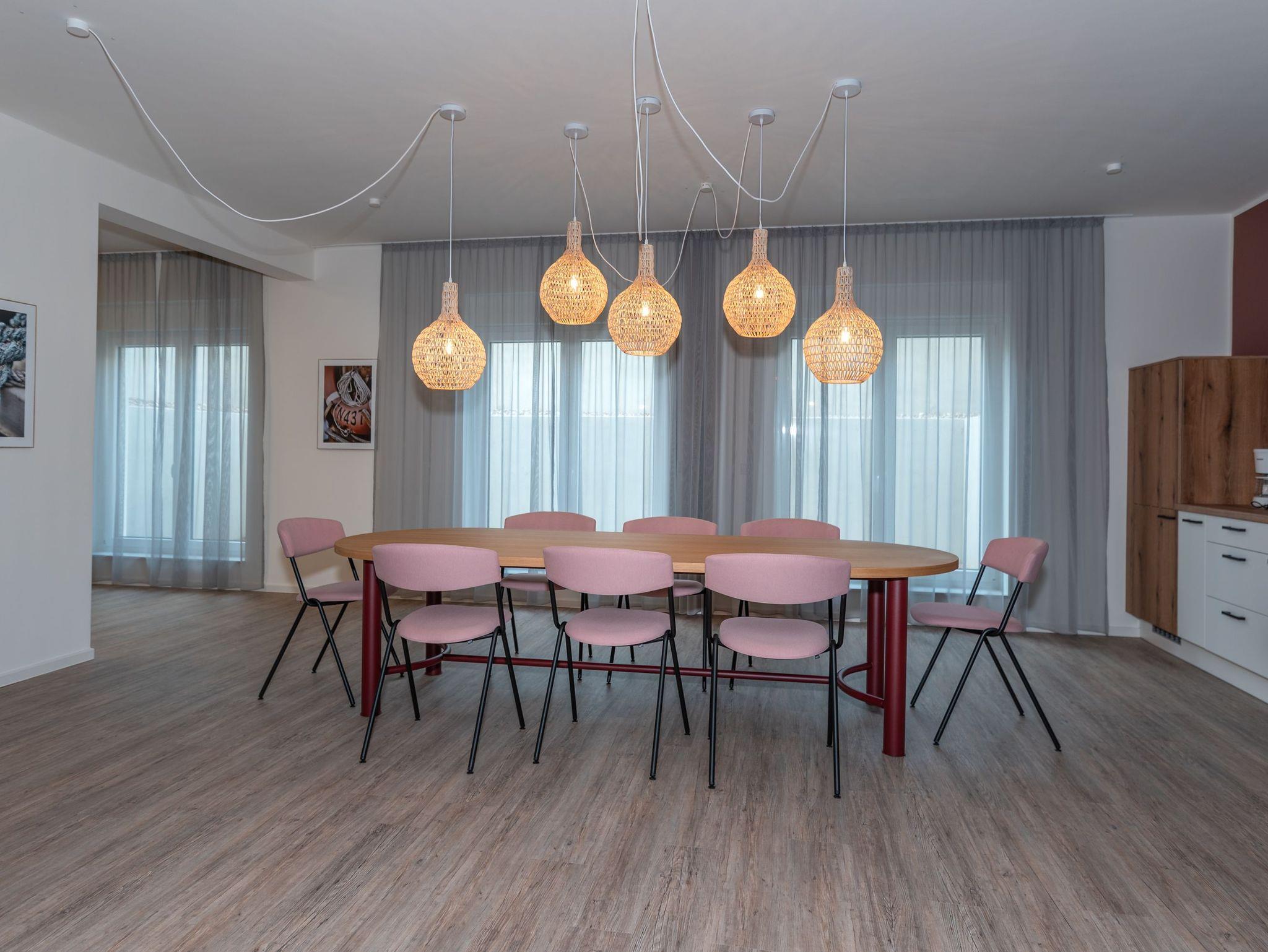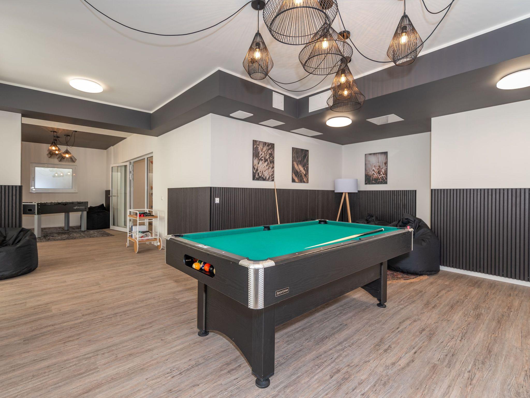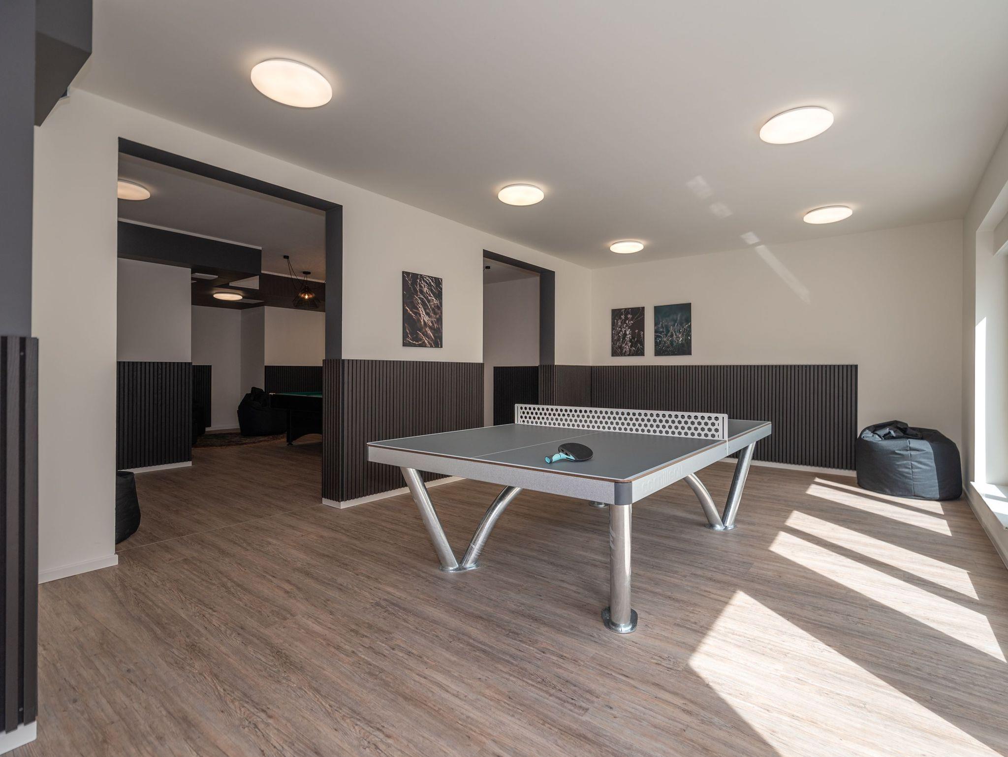 Der hauseigene Wellnessbereich im Dachgeschoss umfasst drei Saunen, einen gemütlichen Ruheraum und eine Dachterrasse mit beeindruckendem Ausblick. Ein Gemeinschaftsbereich im Nebengebäude bietet Freizeitmöglichkeiten wie Billard, Tischkicker, Airhockey und Tischtennis, eine Spielecke für Kinder und einen Fitnessraum. Beides kann kostenfrei genutzt werden.