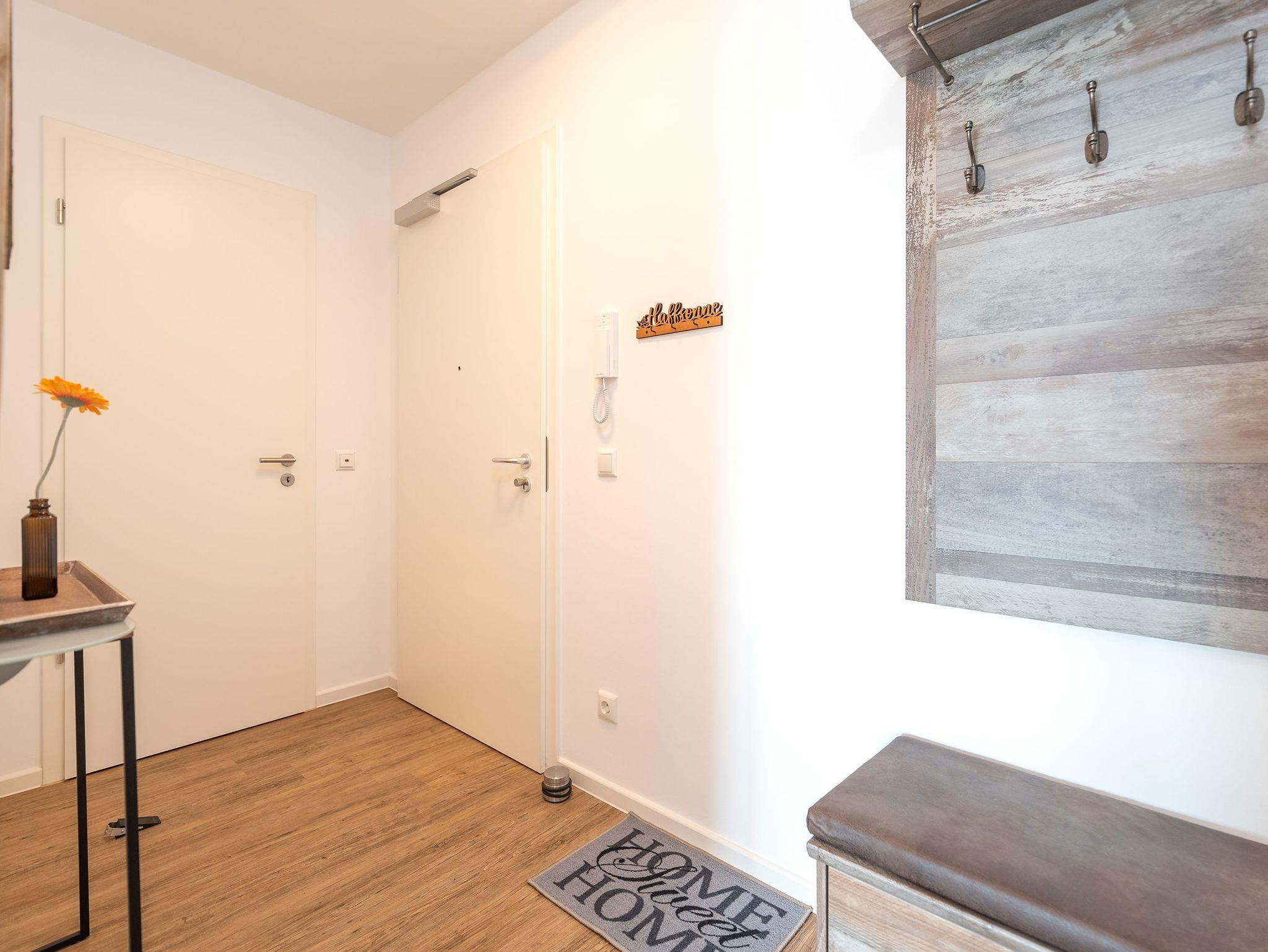 Das sonnige und helle Appartement Haffsonne ist hochwertig und modern im Ostseeflair eingerichtet. Freuen Sie sich auf die lichtdurchfluteten Räumlichkeiten, die liebevolle Dekoration und viel Komfort. Diese Ferienwohnung verfügt über eine Wohnfläche von 65 m² und befindet sich im zweiten Obergeschoss des Gebäudes (Aufzug vorhanden). Bis zu 3 Personen + ein Kleinkind haben in diesem Feriendomizil ausreichend Platz für einen entspannten Urlaub. Ihr Vierbeiner darf sich hier auch willkommen fühlen.