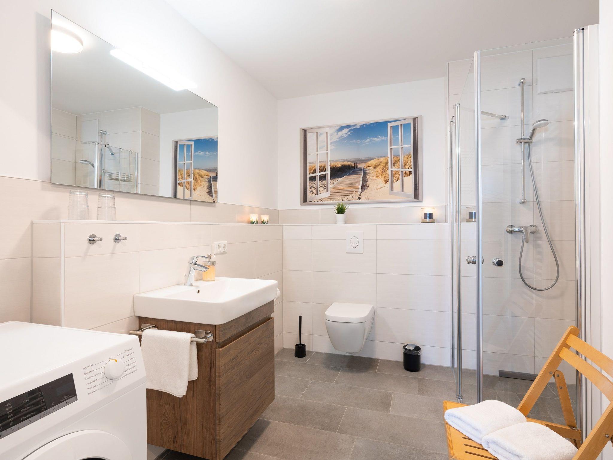 Im großen Badezimmer befindet sich eine Waschmaschine zur freien Verfügung.