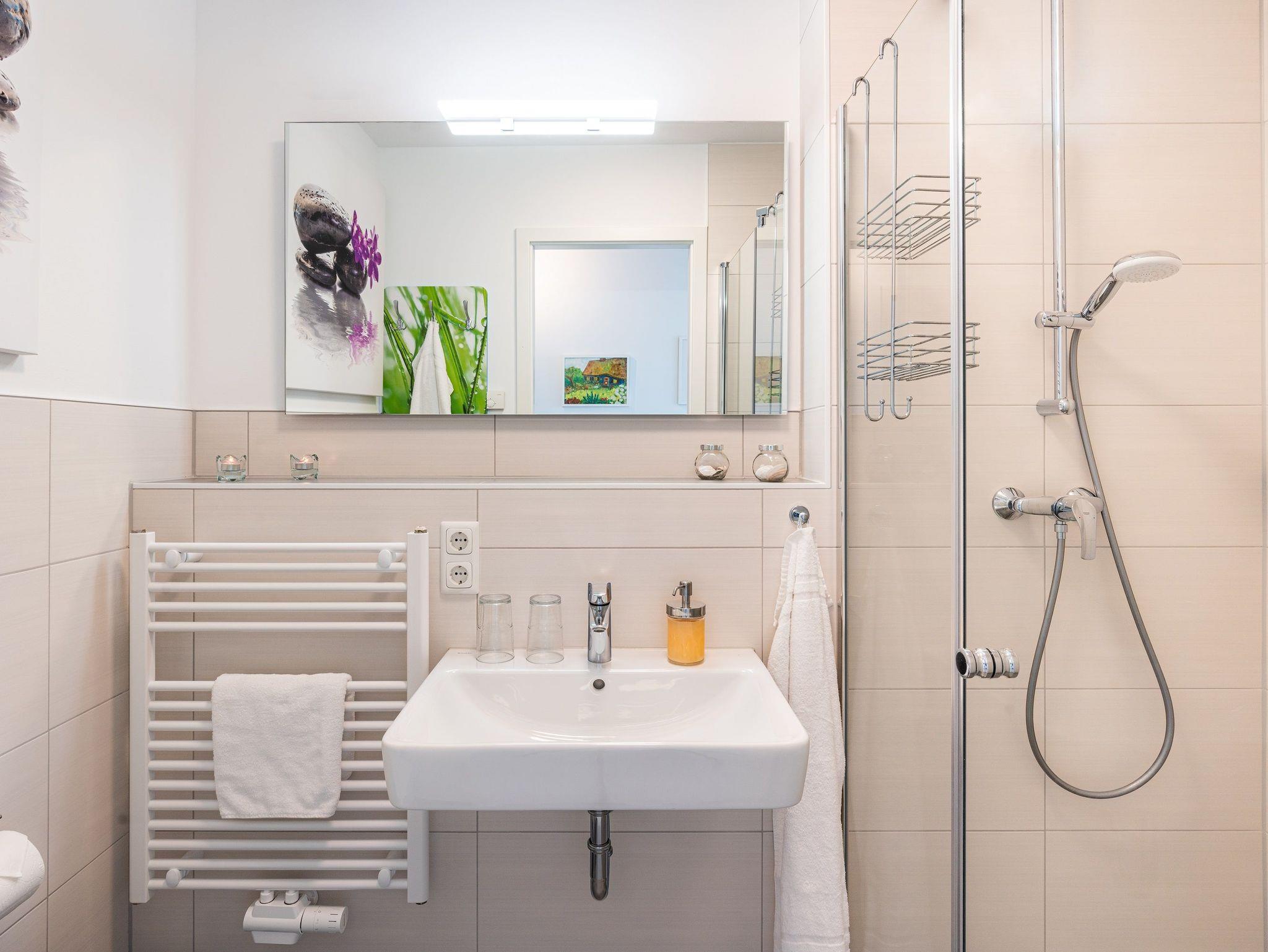 Die beiden vollausgestatteten Badezimmer verfügen jeweils über eine ebenerdige Dusche, WC, Waschtischanlage sowie Fön.