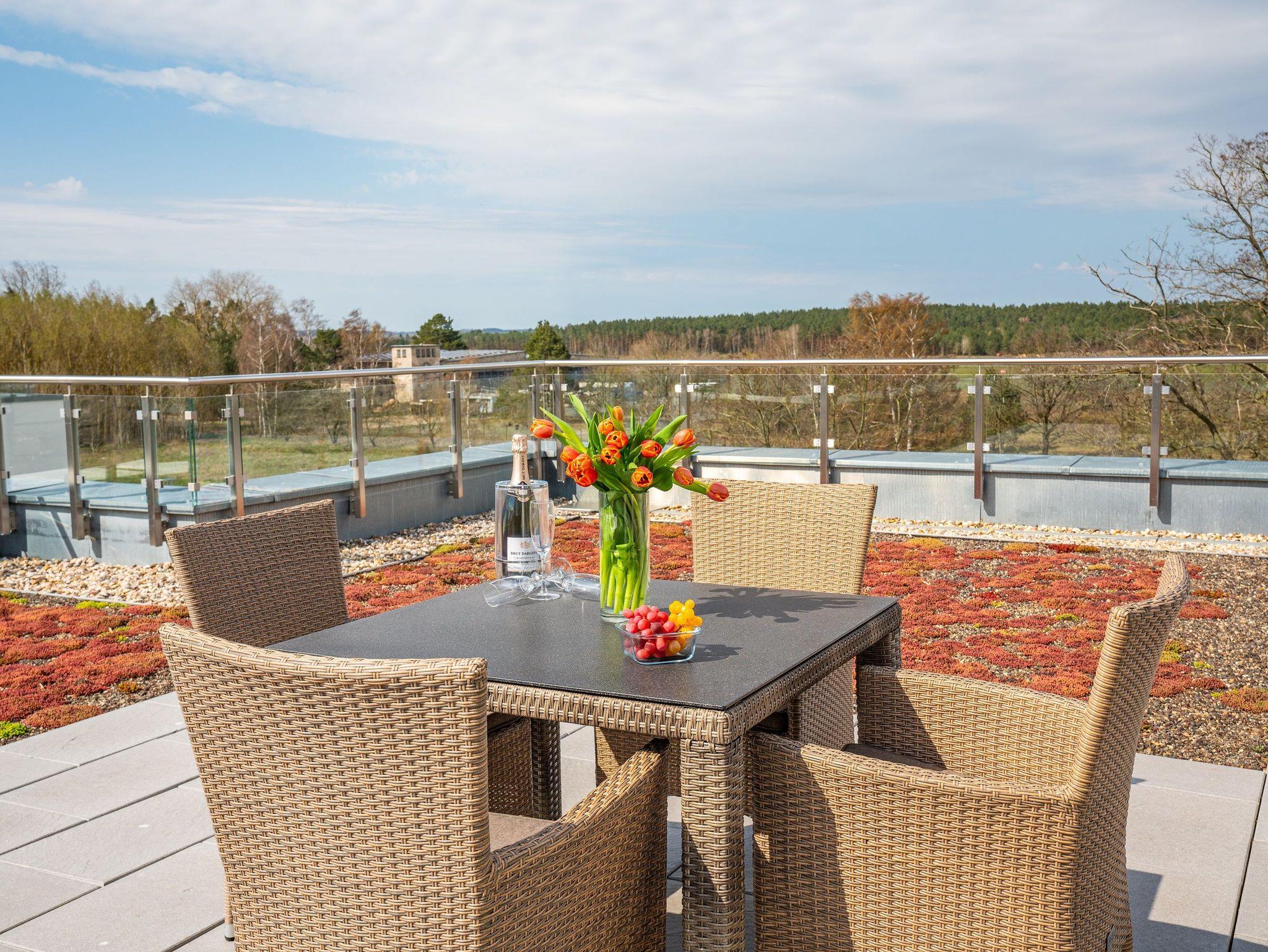 Weit ab von der Hektik und den Besuchermassen öffentlicher Wellnessangebote, finden Sie im Dachgeschoss des Hauses auf 190 m² die Ruhe, die Sie sich verdient haben. Entspannen Sie im hauseigenen, kostenfreien Wellnessbereich mit zwei Saunen und gemütlichem Ruheraum. Genießen Sie die klare Ostseeluft auf der großen angrenzenden Dachterrasse.