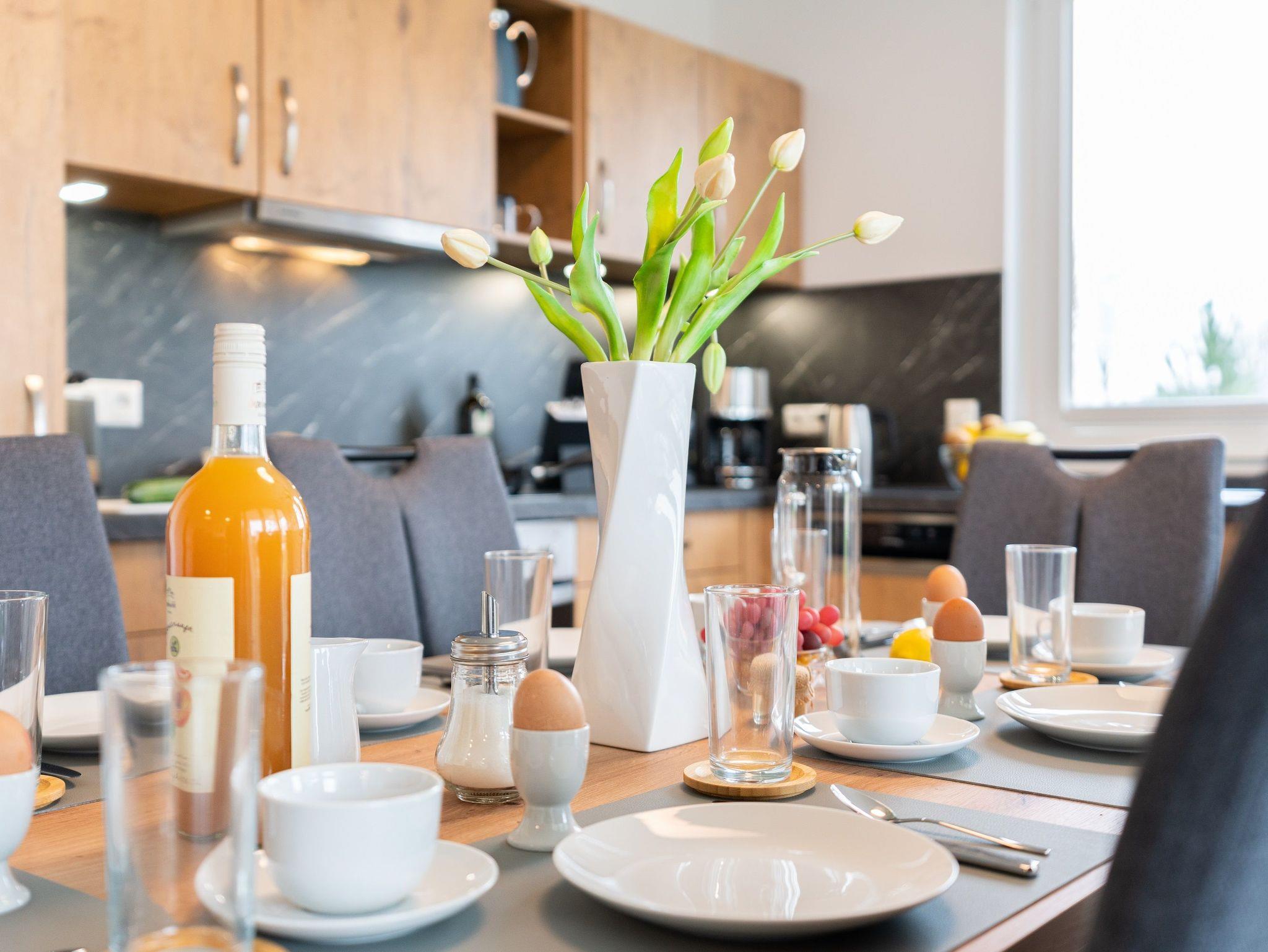 Die Küchenzeile verfügt über hochwertige Geräte wie Herd, Backofen, Kühl- und Gefrierfach, Kaffeemaschine, Nespresso-Maschine sowie Spülmaschine. Ausreichend Geschirr, Besteck sowie Töpfe und Pfannen befinden sich in den Schränken. Am großen Esstisch finden Sie vor einem erholsamen Urlaubstag zu einem gemeinsamen Frühstück zusammen.