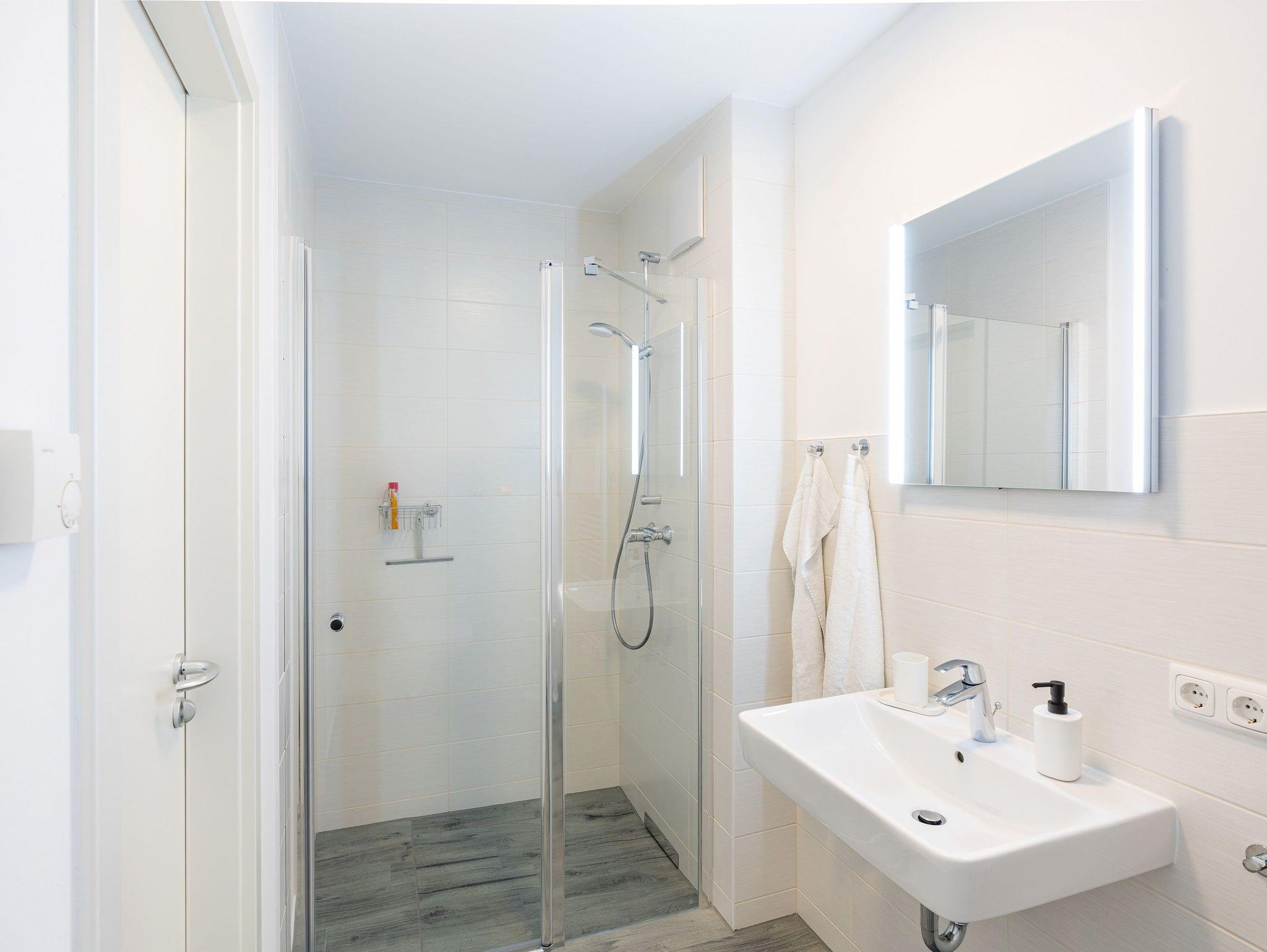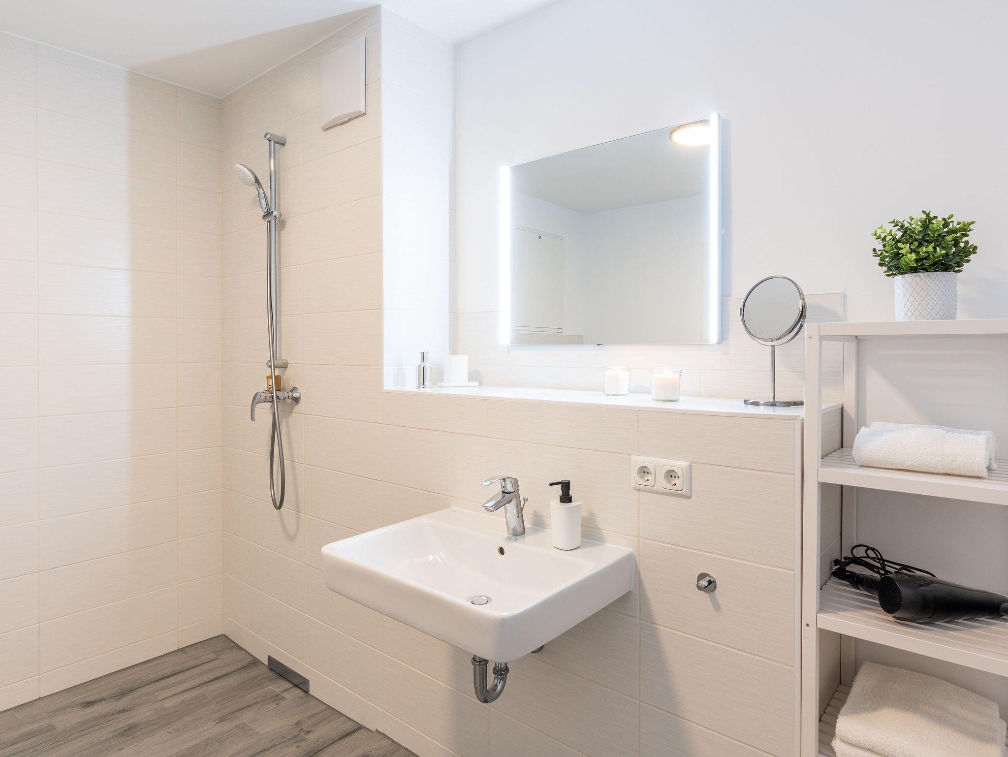 Die beiden vollausgestatteten Badezimmer verfügen jeweils über eine ebenerdige Dusche, WC, Waschtischanlage sowie Fön.