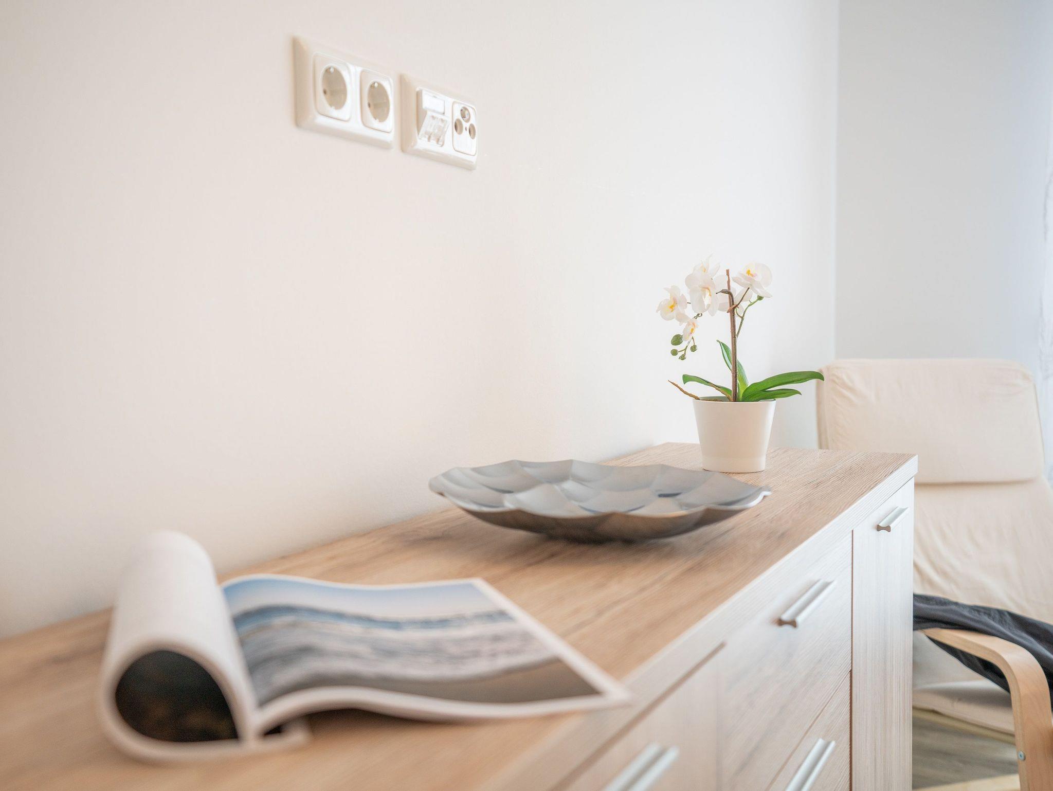 Informationen für Gäste mit Mobilitätseinschränkung: Der Zugang vom Parkplatz zum Hauseingang ist barrierefrei. Die Distanz vom Parkplatz zur Haustür beträgt etwa 30 Meter. Die Breite der Haustür beträgt 100 cm. Die Dichtigkeitsschwelle der Haustür ist etwa 1,5 cm hoch. Der Aufzug im Treppenhaus fährt jede Etage, auch die Saunalandschaft im Obergeschoss, an. Die Türbreite des Aufzugs beträgt 90 cm, die Tiefe beträgt 130 cm. Die Wohnungstür weist eine Breite von 90 cm auf. Die Breiten der Zimmertüren liegen bei 80 cm (Ausnahme: Türbreite von der Abstellkammer beträgt 70 cm). Im Badezimmer beträgt die Breite des Duscheingangs etwa 100 cm (faltbare Duschtür). Die Duschkabine hat eine Maße von 120 x 120 cm. Auf Wunsch kann ein Duschhocker kostenfrei zur Verfügung gestellt werden. Der Waschtisch ist unterfahrbar. Haltegriffe sind nicht vorhanden. Das Bett weist eine Höhe von 55 cm auf und ist nicht unterfahrbar. Die Terrassentür im Wohnzimmer ist zweiflügelig und lässt sich auf eine Breite von etwa 160 cm öffnen. Im Schlafzimmer lässt das an der Terrassentür befindliche Fliegengitterschiebeelement die Tür auf eine Breite von etwa 70 cm öffnen. Die Schwelle von der gepflasterten Terrasse zur Rasenkante beträgt etwa 15 cm. Der Saunabereich im Dachgeschoss ist mit dem Aufzug erreichbar. Im Dachgeschoss ist eine Sauna mit dem Rollstuhl befahrbar, die Türbreite beträgt 90 cm. Für das Betreten der Dachterrassen müssen zwei Stufen passiert werden. Das Betreten des Südbalkons im Dachgeschoss ist barrierefrei möglich. Die Freizeitbereiche im Untergeschoss des Nachbarhauses sind komplett barrierefrei gestaltet. Die Türbreiten liegen bei 90 cm.