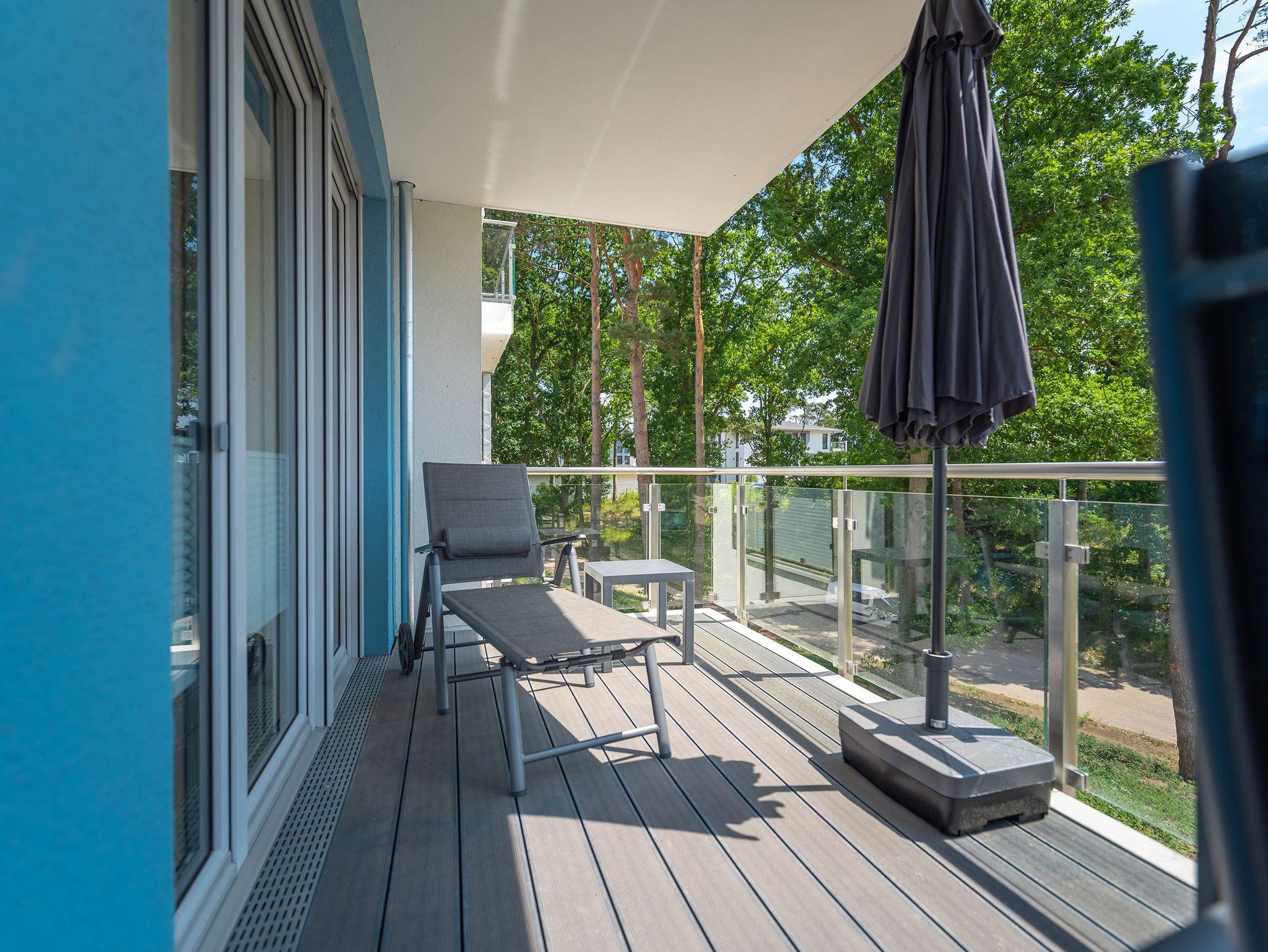 Modernes Apartment mit Südbalkon und Seeblick auf Usedom, inklusive Wellnessbereich und Freizeitmöglichkeiten.