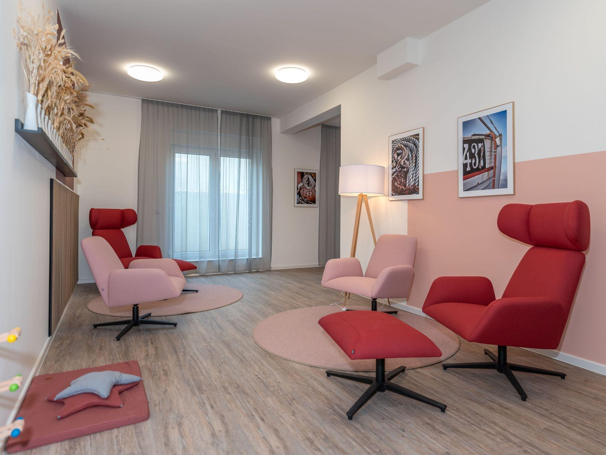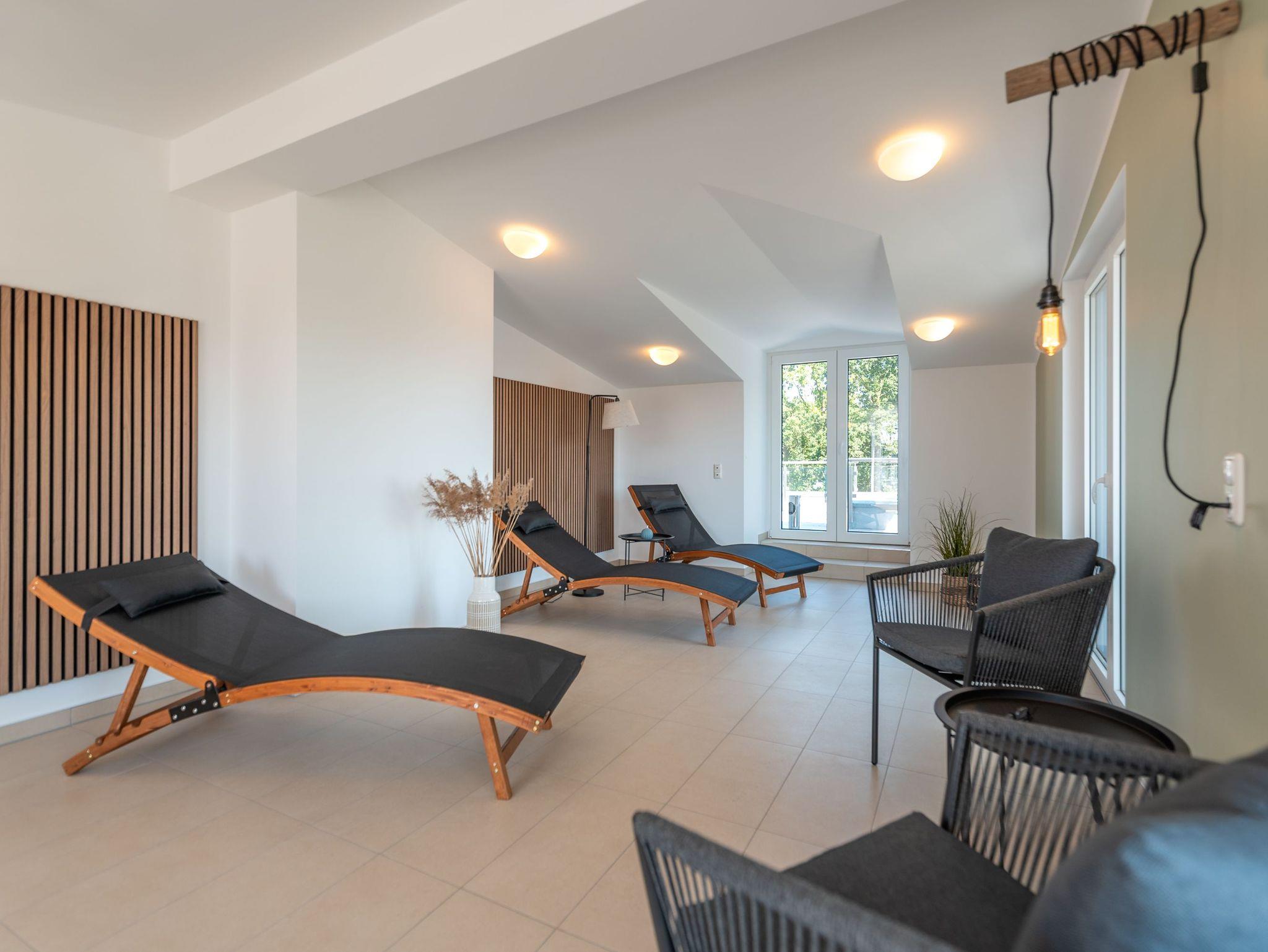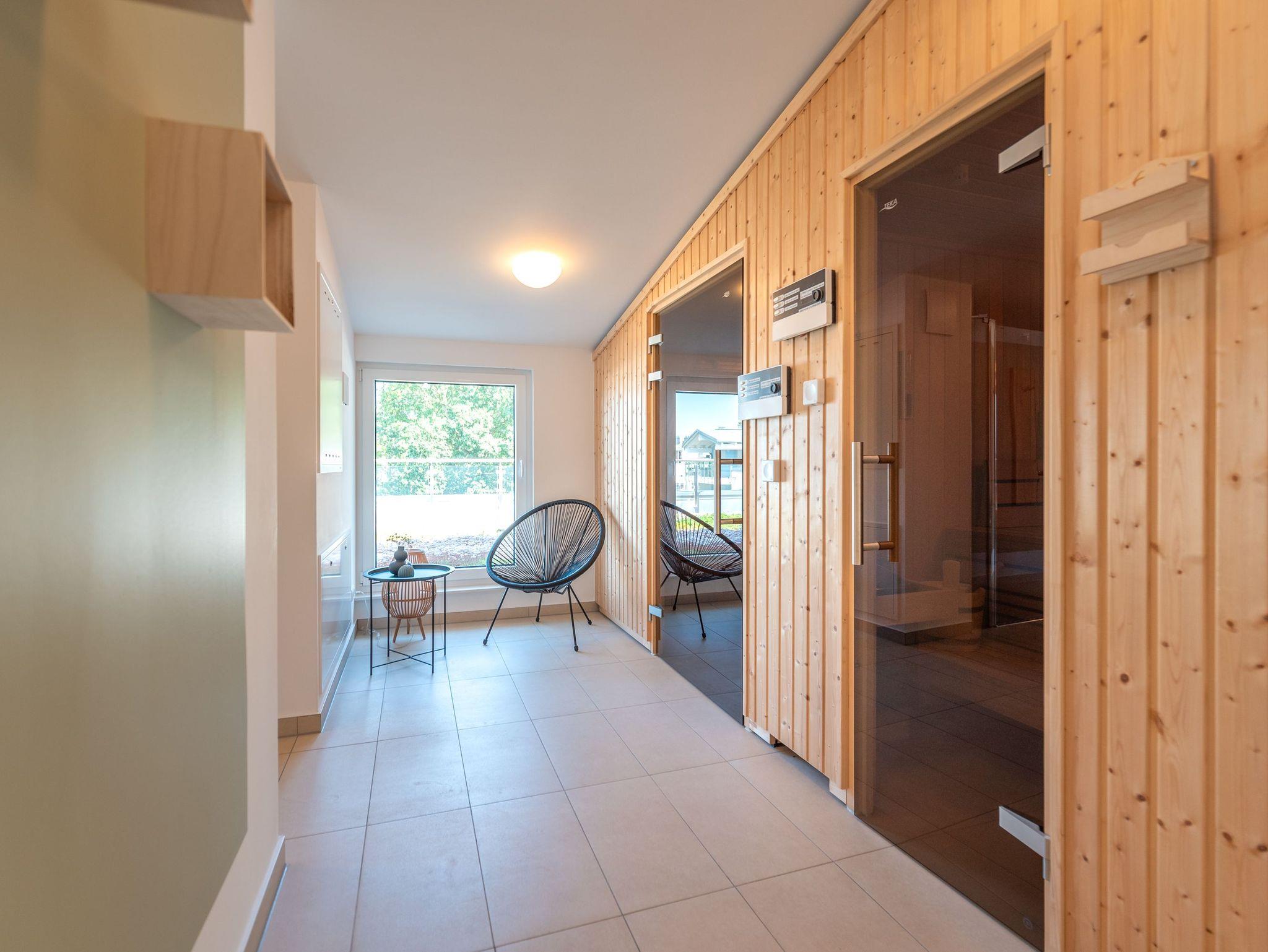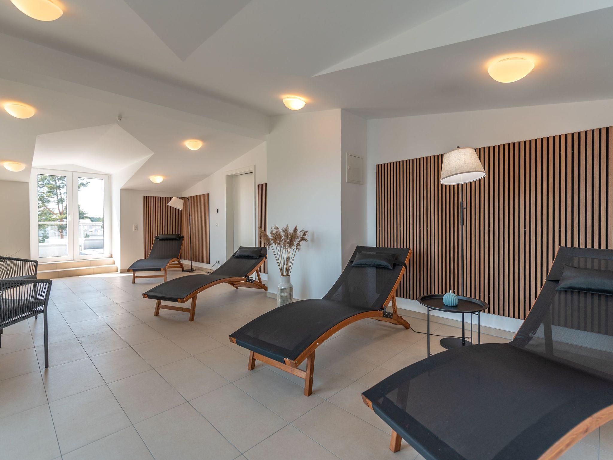 Der hauseigene Wellnessbereich im Dachgeschoss umfasst drei Saunen, einen gemütlichen Ruheraum und eine Dachterrasse mit beeindruckendem Ausblick. Ein Gemeinschaftsbereich im Nebengebäude bietet Freizeitmöglichkeiten wie Billard, Tischkicker, Airhockey und Tischtennis, eine Spielecke für Kinder und einen Fitnessraum.