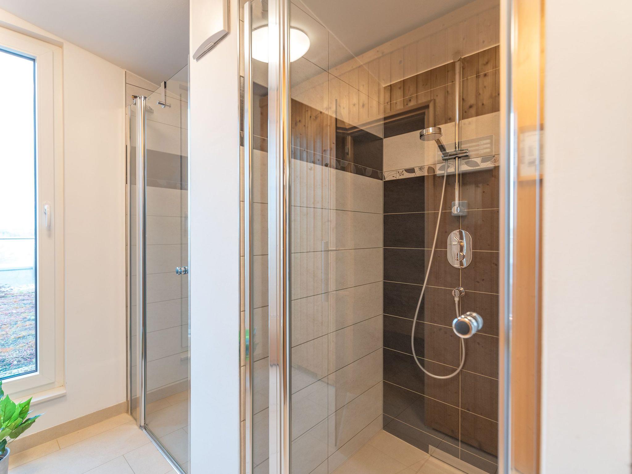 Das Badezimmer ist modern gestaltet mit einer ebenerdigen Dusche, WC, einem Waschtisch mit Spiegel, Fön und einer Handtuchheizung. Kostenfreies WLAN ist in der gesamten Wohnung verfügbar.