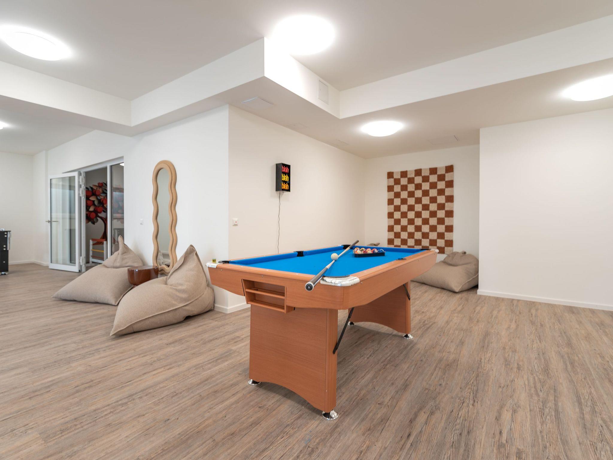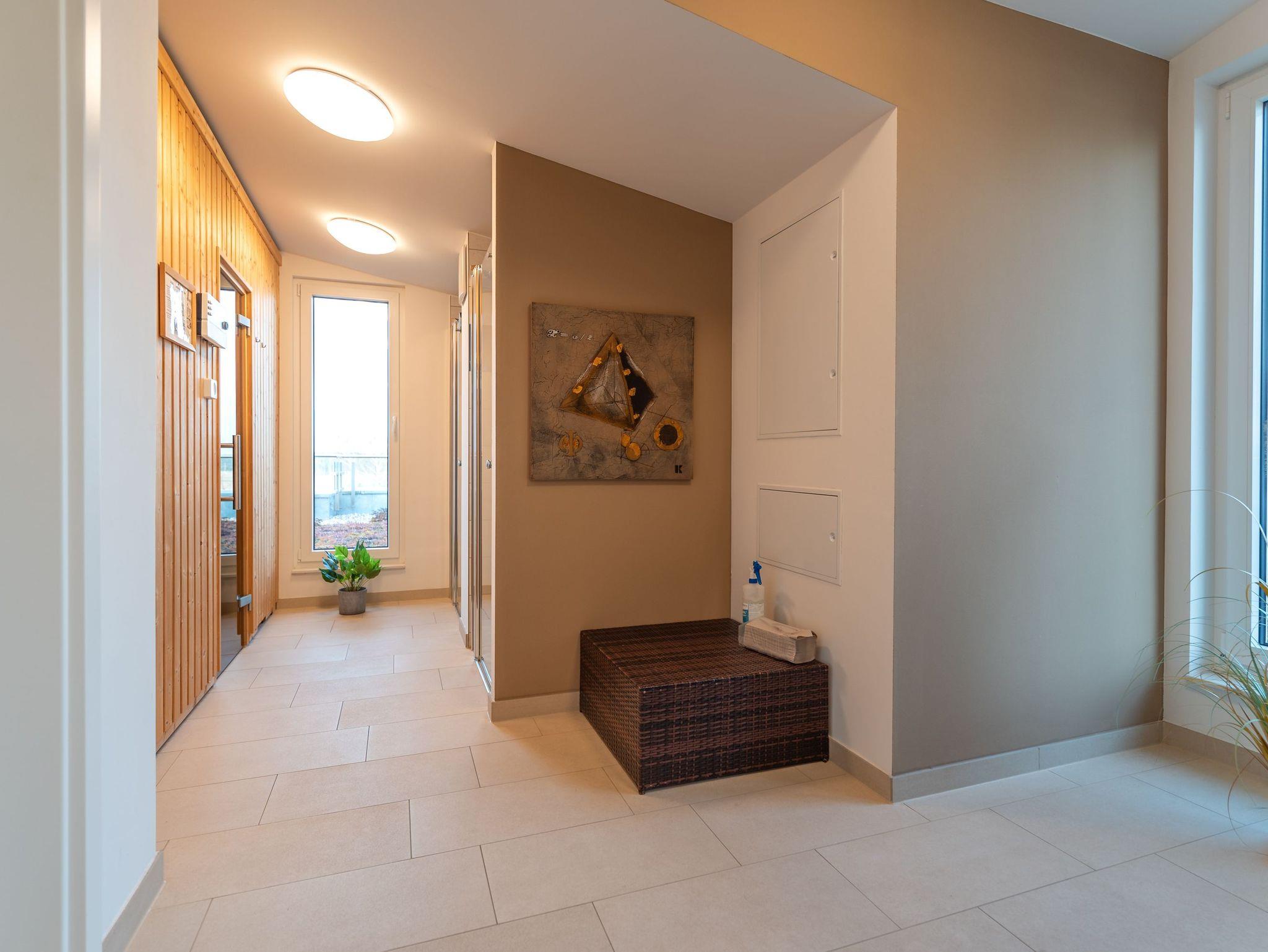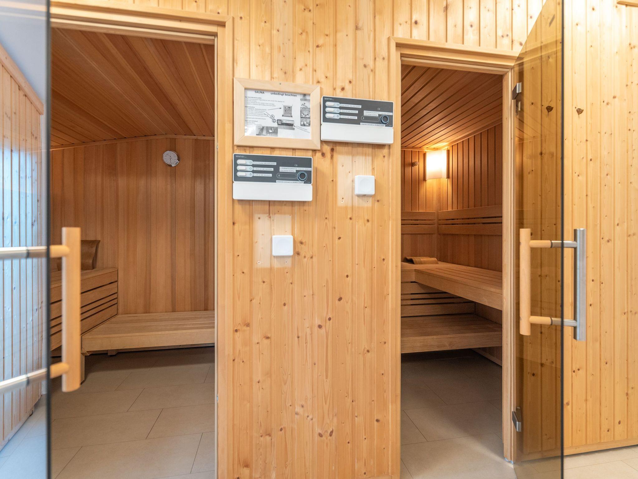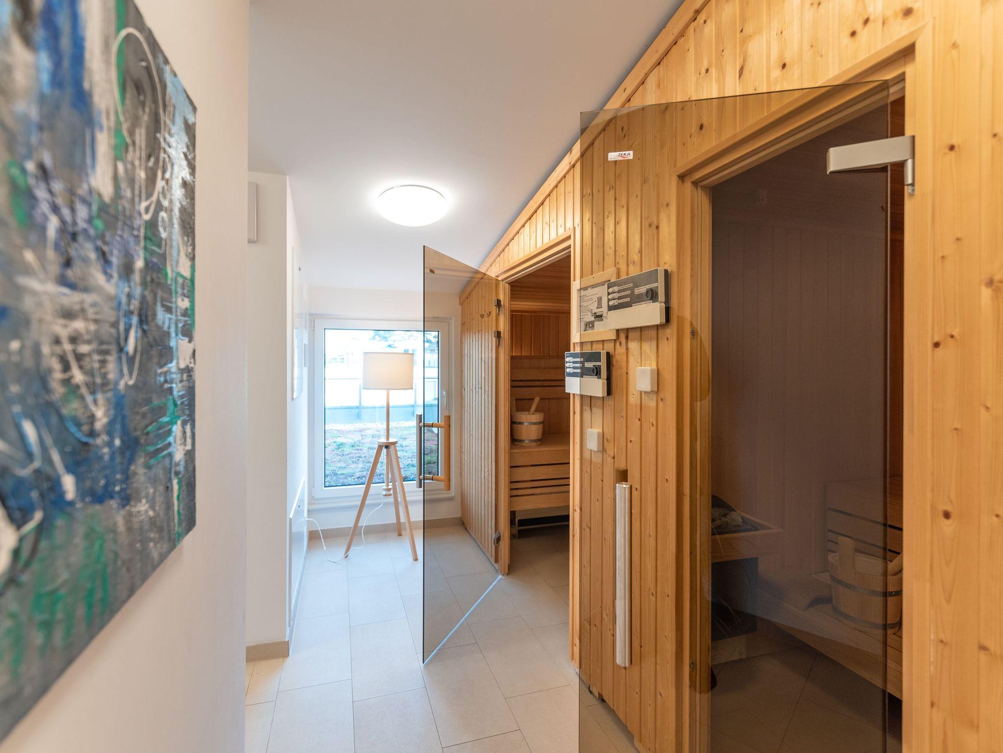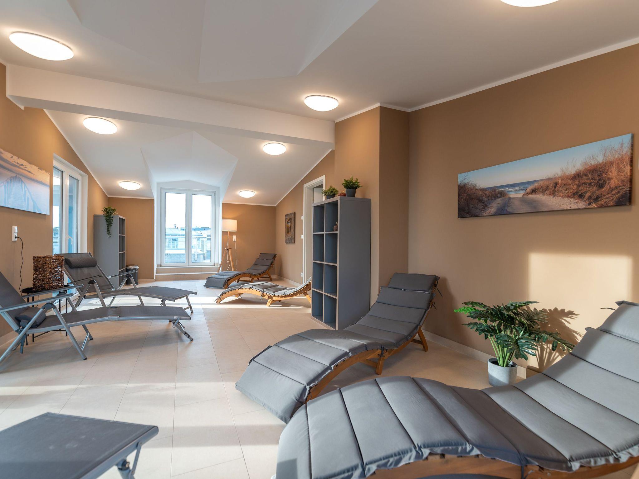 Im 3. Stockwerk des Hauses befindet sich ein Saunabereich, der allen Gästen zur Verfügung steht. Dieser umfasst drei verschiedene Saunen, mehrere Duschen, Sanitäranlagen und einen Ruheraum mit Liegen. Bei schönem Wetter können Sie von der Dachterrasse aus die wundervolle Aussicht auf die Umgebung und das Haff genießen. Im Untergeschoss des Nachbarhauses erwartet Sie ein Gemeinschaftsbereich mit Tischtennis, Airhockey, Kicker, Billard, einem kleinen Fitnessraum sowie einer Spielecke für Kinder. Die Nutzung der Saunen und des Freizeitbereiches sind im Preis inbegriffen.