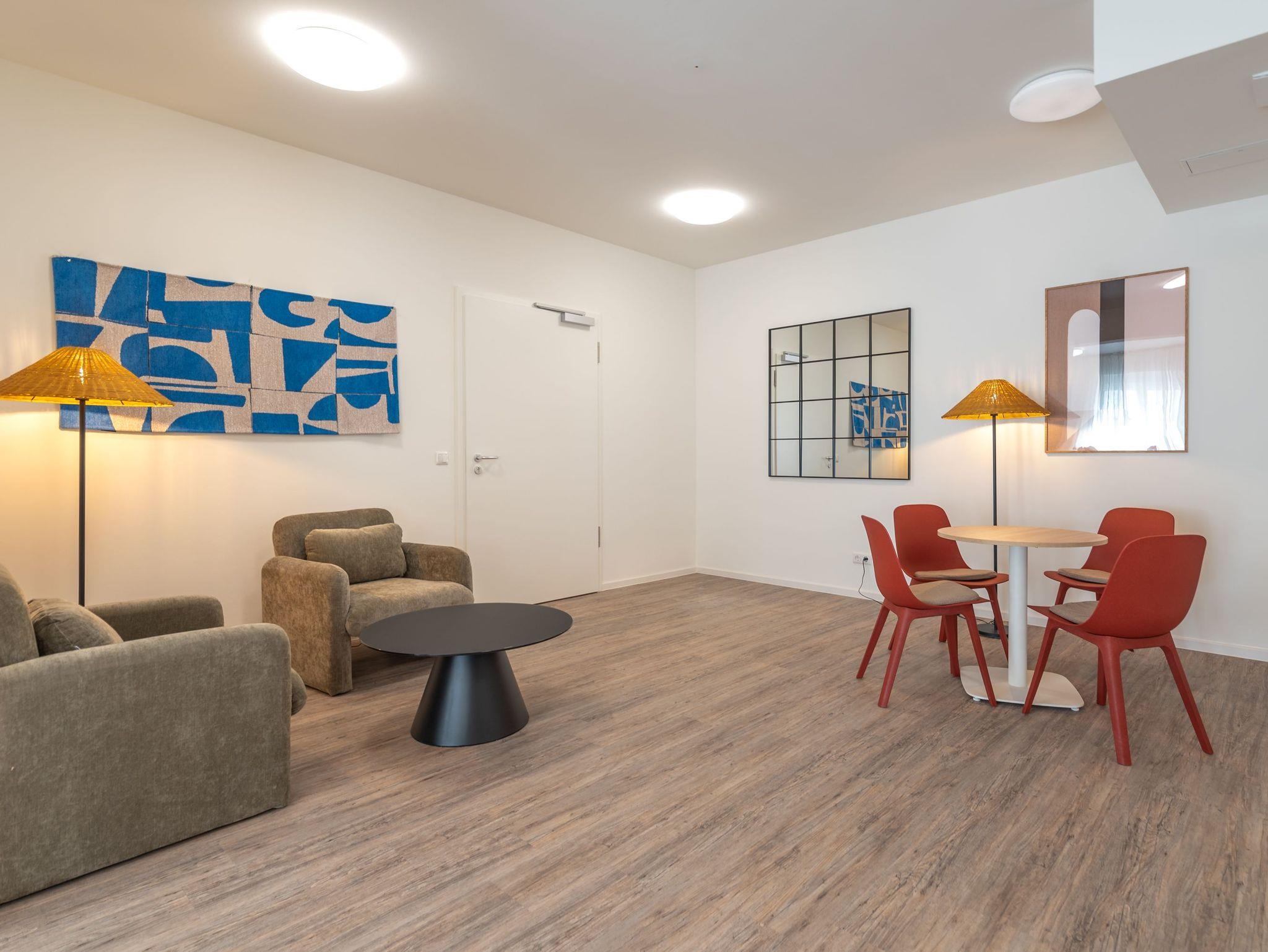 Das Herzstück der Wohnung ist der Wohn-/Essbereich mit einer voll ausgestatteten offenen Küche, die über ein Induktionskochfeld, eine Mikrowelle, einen Heißluftofen, einen Kühlschrank mit Gefrierfach und einen Geschirrspüler verfügt. Ein gemütlicher Essplatz mit vier Stühlen und eine bequeme Eckcouch laden zum Verweilen ein. Zur Unterhaltung stehen ein 50-Zoll-TV und ein Internetradio bereit. Die Couch kann bei Bedarf zu einem Schlafplatz (140 x 200 cm) umfunktioniert werden.