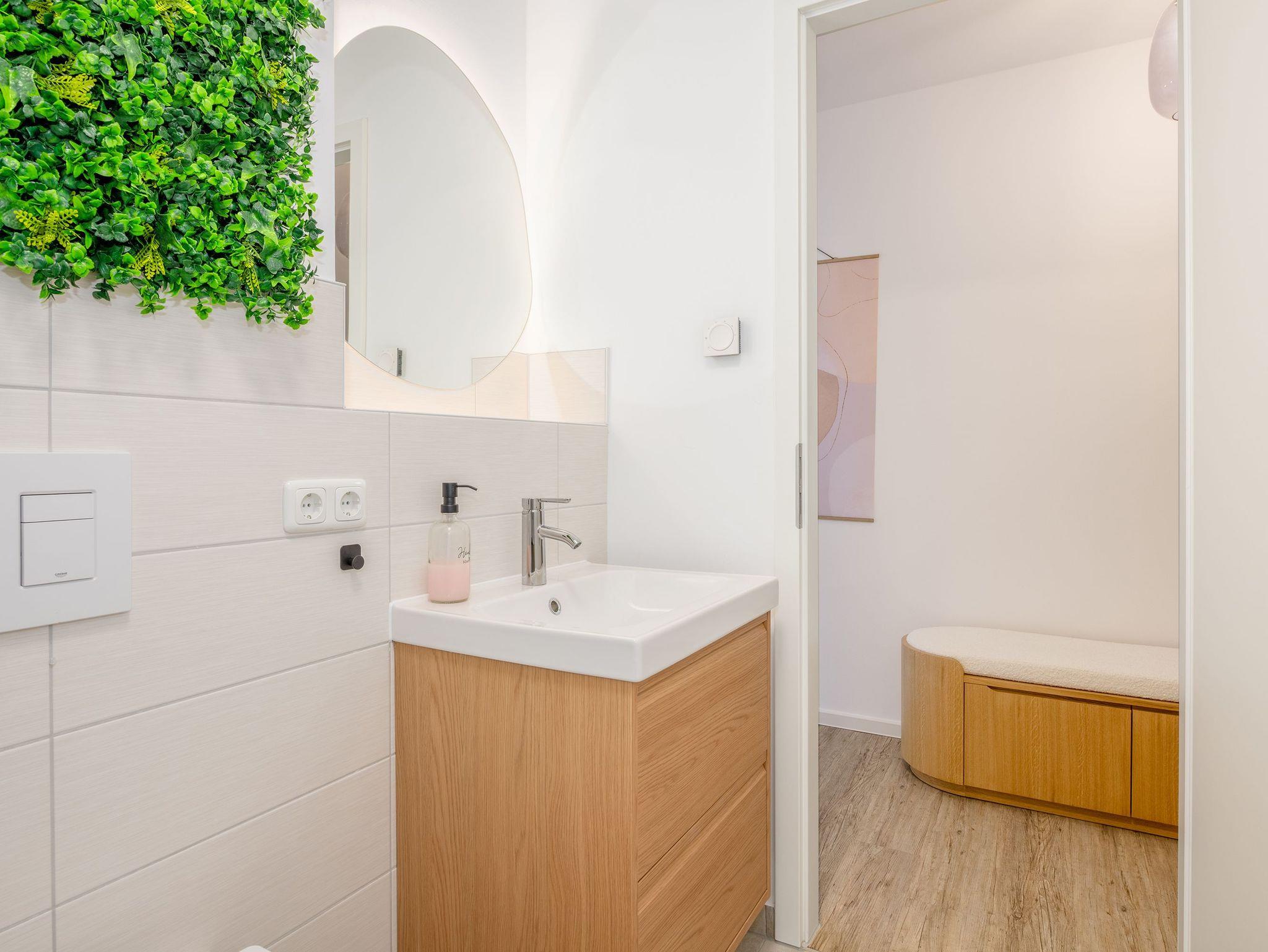 Der sonnige Balkon ist mit gemütlichen Sitzmöbeln und einer Loungeecke ausgestattet ideal für ein Frühstück im Freien oder einen entspannten Tagesausklang mit Blick ins Grüne. Dank des durchdachten Grundrisses genießen bis zu vier Personen höchsten Wohnkomfort perfekt für Paare oder kleine Familien.