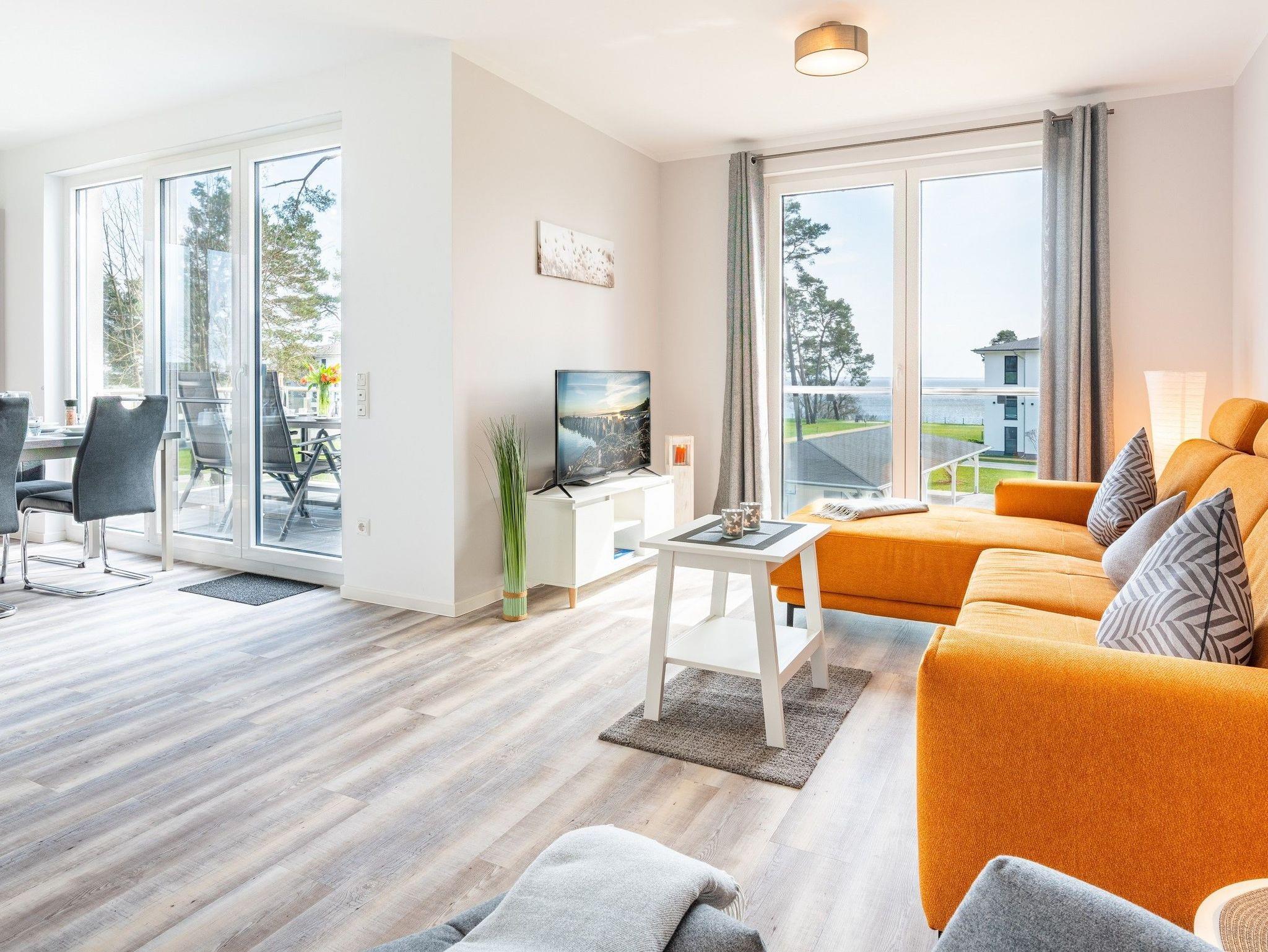 Der offen gestaltete Wohnbereich ist mit einem komfortablen Sofa und Sessel sowie Smart-TV ausgestattet. Sie haben vom Wohnzimmer aus Zugang zum Südost-Balkon. Der möblierte Balkon mit traumhaften Ausblicken auf das Stettiner Haff bietet auch aus der zweiten Reihe einen wunderschönen Ort, um Ihre Mahlzeiten zu genießen und die Aussicht zu bewundern.
