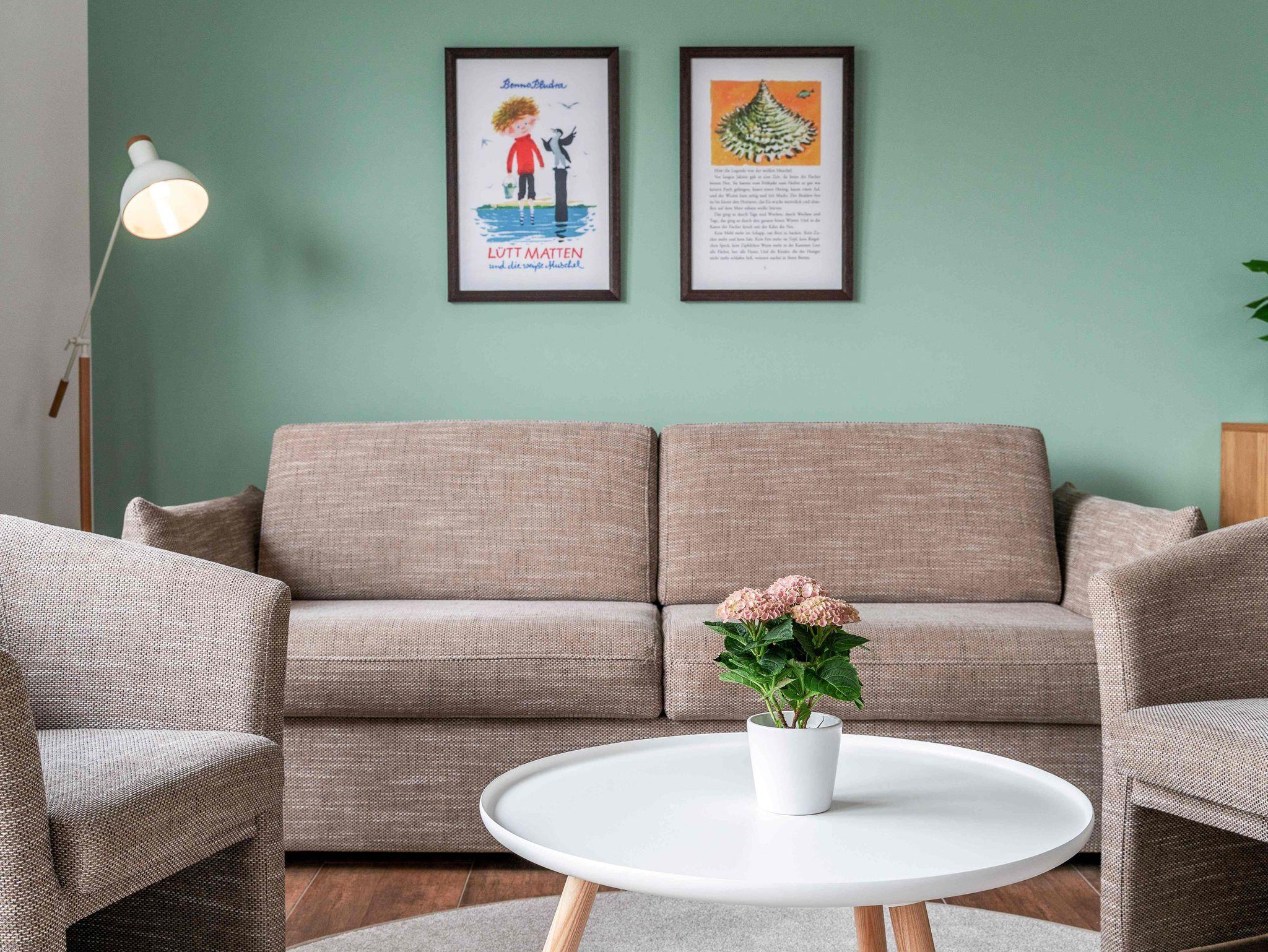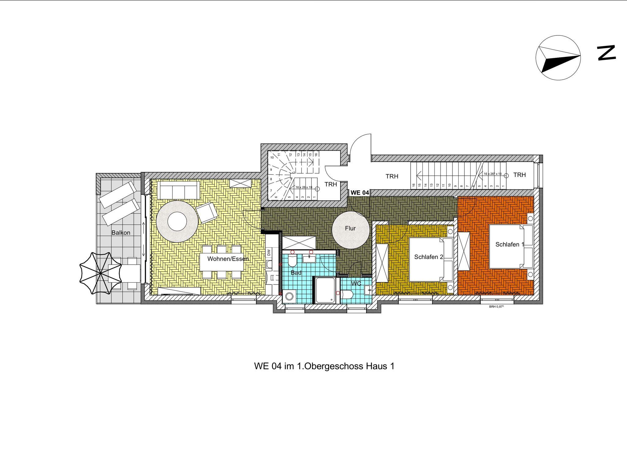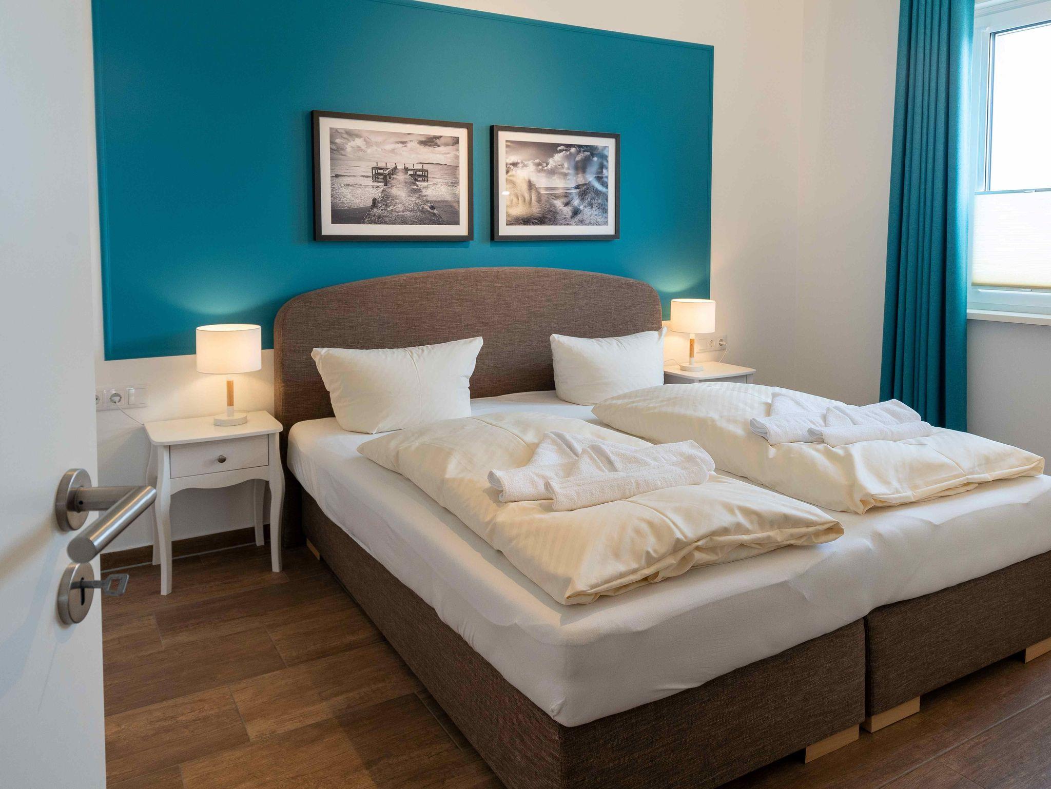 Unsere Ferienwohnung ist großzügig geschnitten und für bis zu 6 Personen geeignet, 1. OG, 80 qm, 2 Schlafzimmer zzgl. Schlafcoach im Wohnzimmer, 2 Balkone, 2 Bäder, Küche