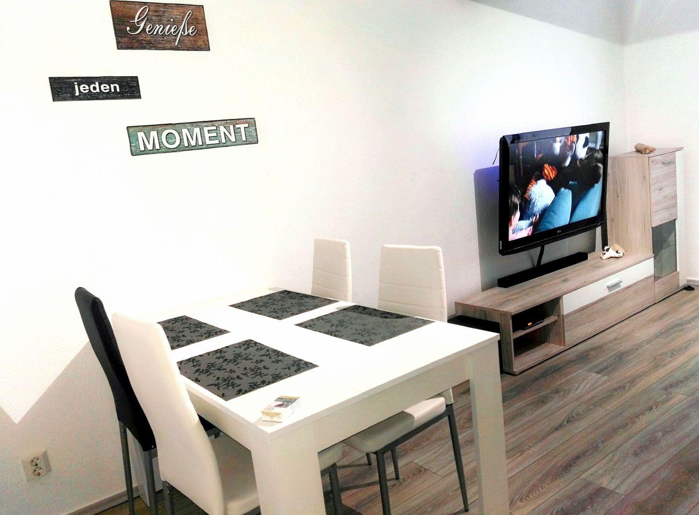 WOHNEN // Wohnraum mit Essbereich, Couch mit Schlaffunktion, Flachbild-TV (Kabel), Radio ++