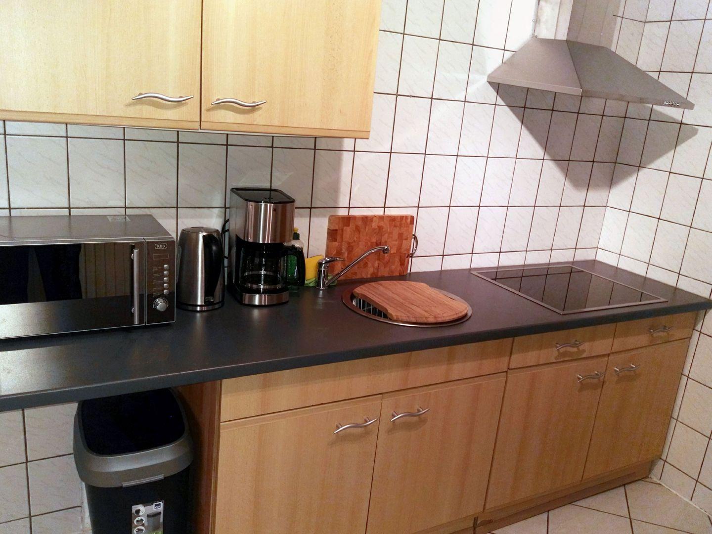 KÜCHE // Küchenzeile, 4-Platten Ceranherd, Kühlschrank mit Gefrierfach, Mikrowelle, Toaster, Wasserkocher, Kaffeemaschine, reichlich Besteck, Geschirr und Küchenutensilien ++